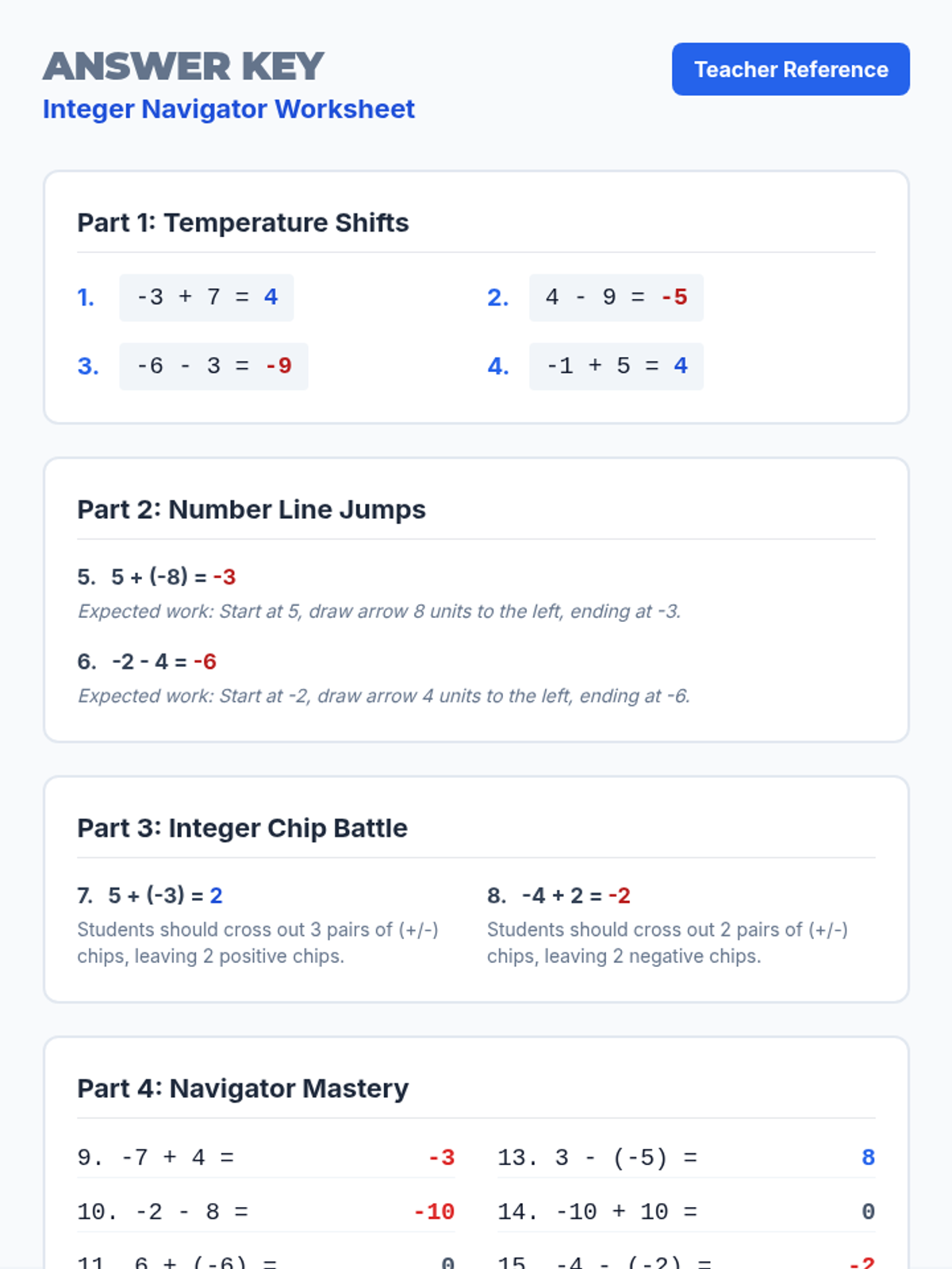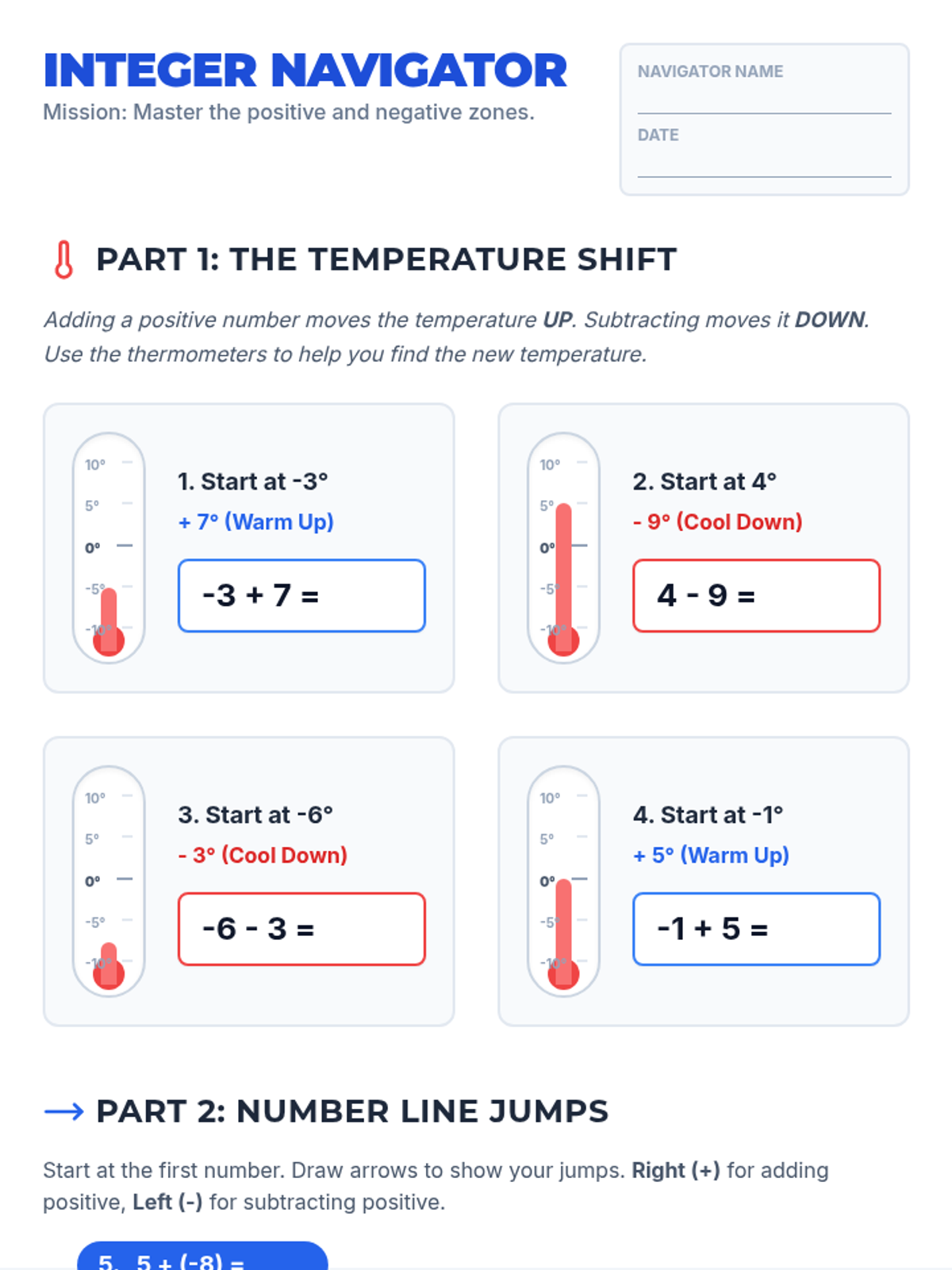 A visual-heavy lesson introducing 6th graders to adding and subtracting integers using thermometers, number lines, and integer chips. Students explore movement and zero pairs to master signed number operations.