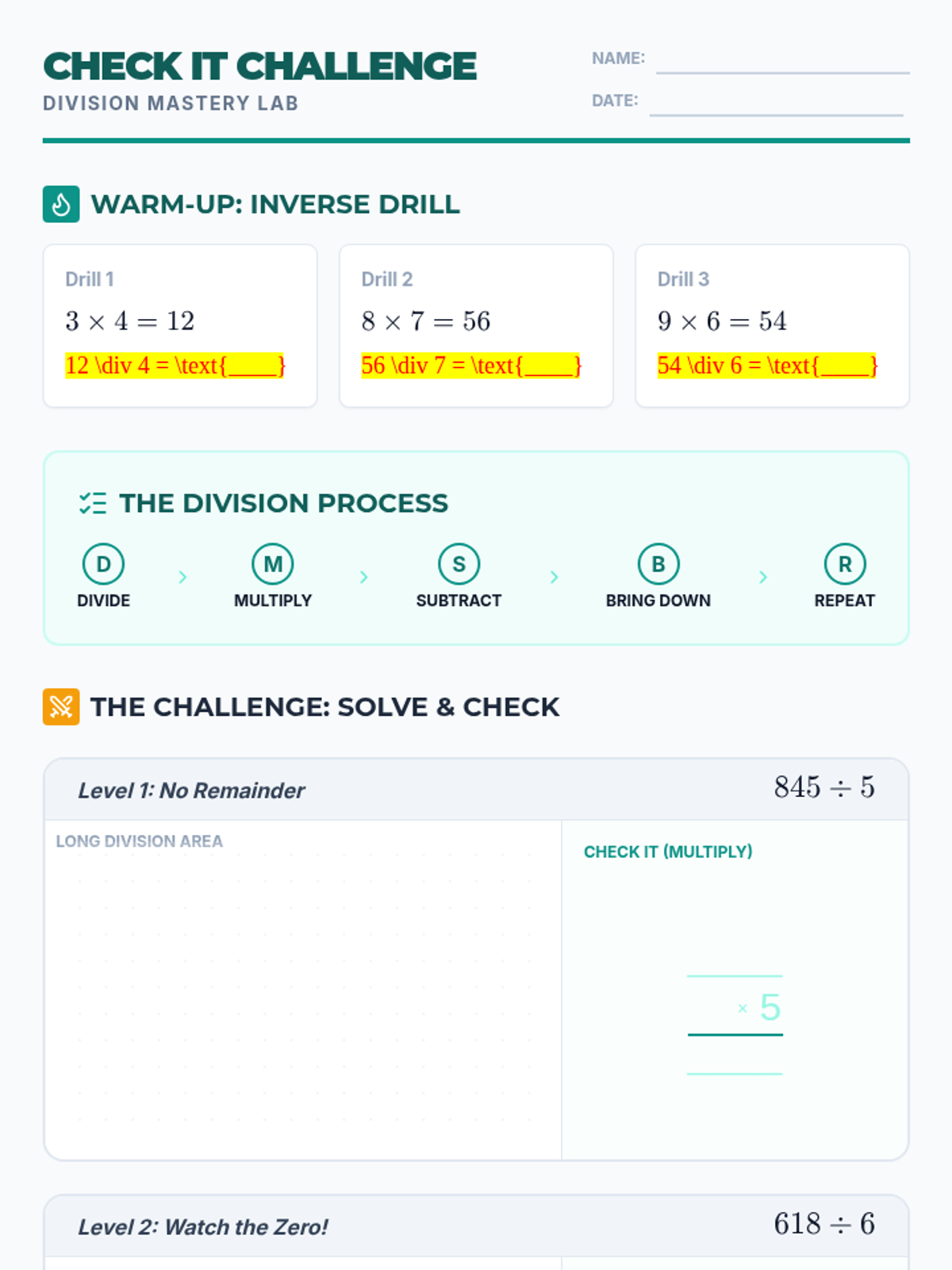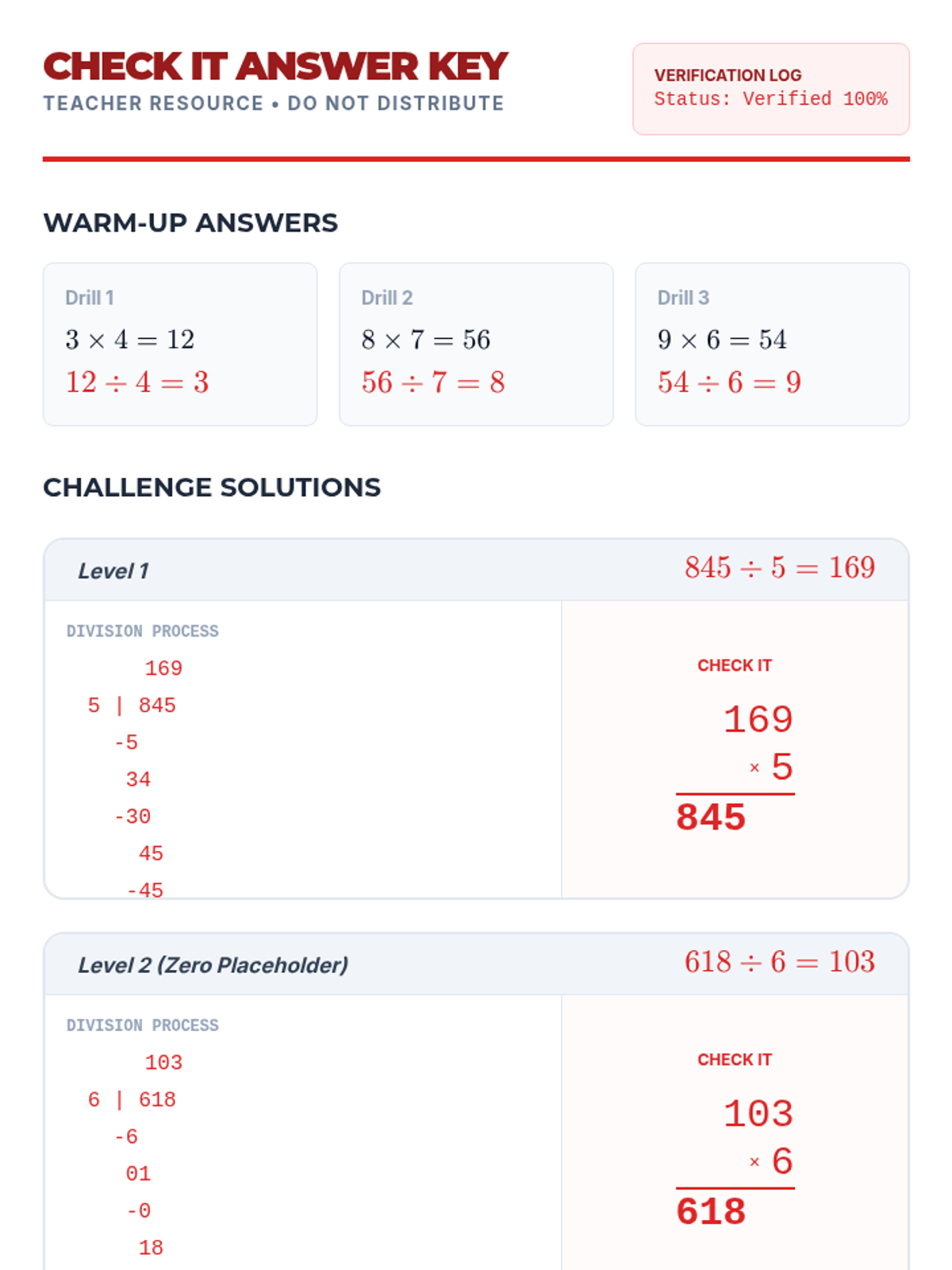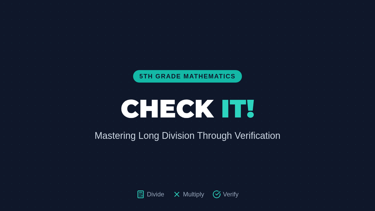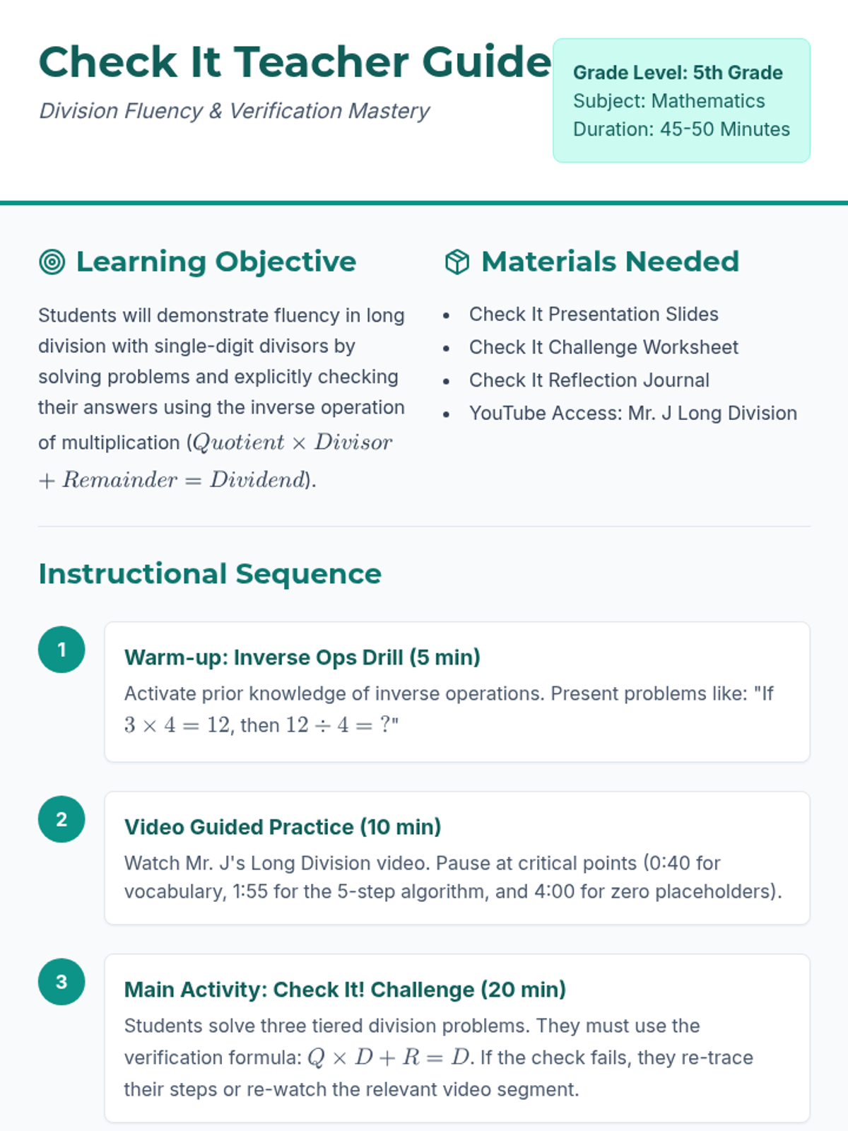 A 5th-grade math lesson focused on mastering long division through the 'Check It!' method, using multiplication to verify quotients and remainders. Students watch a guided video by Mr. J and apply the standard algorithm to solve and verify complex division problems.