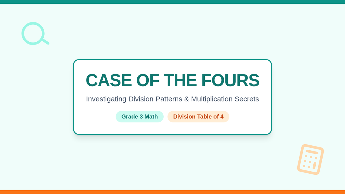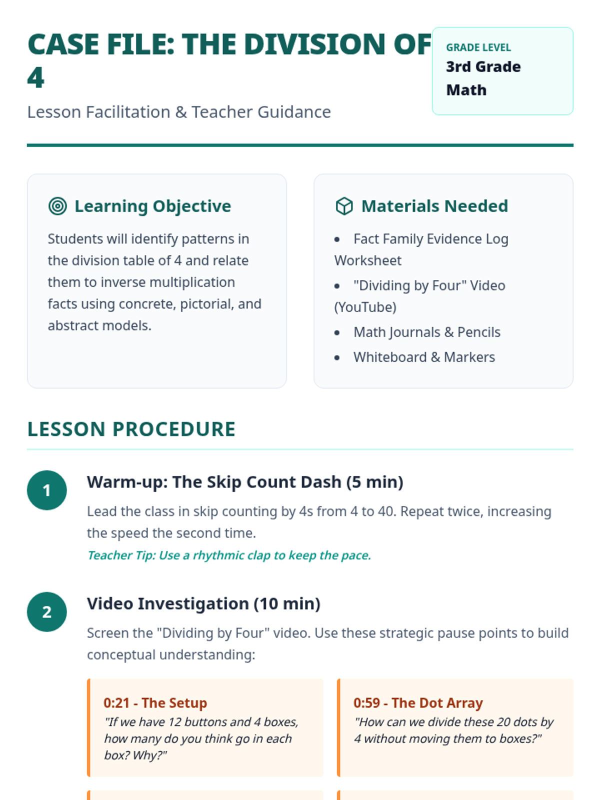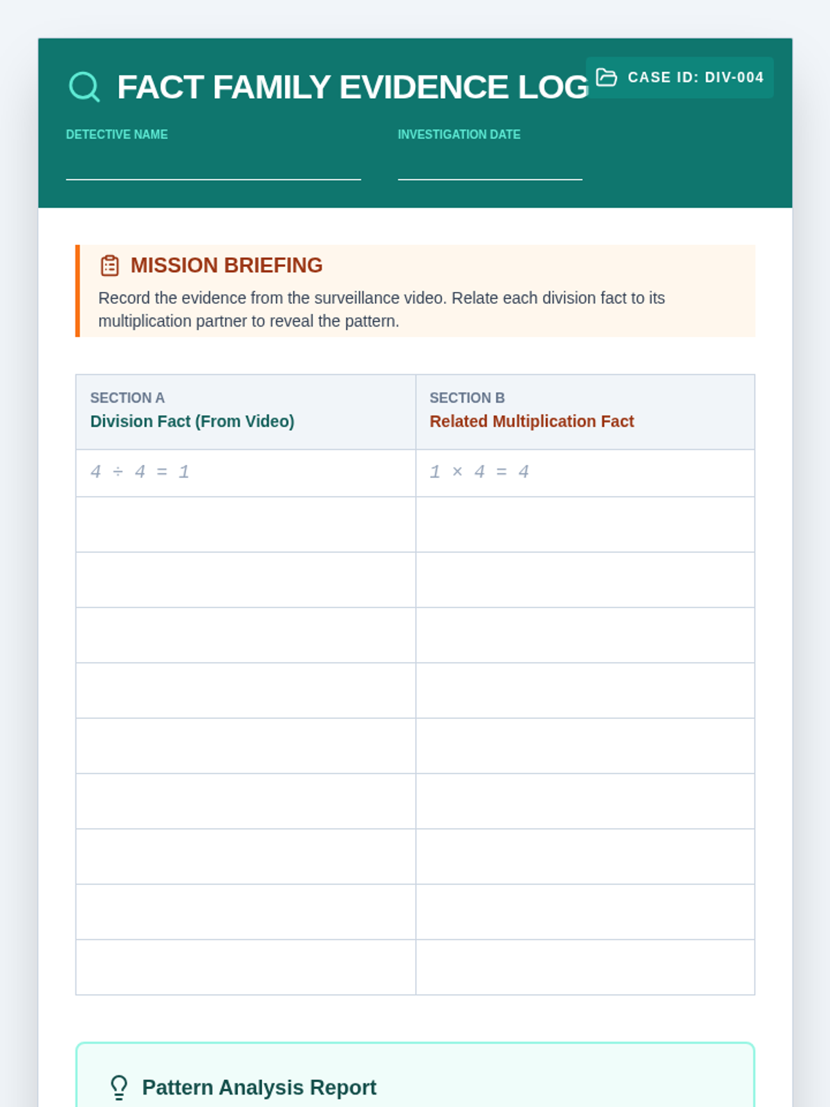 Students investigate the division table of 4, uncovering patterns and links to multiplication through a video-based 'Fact Family Detectives' activity.