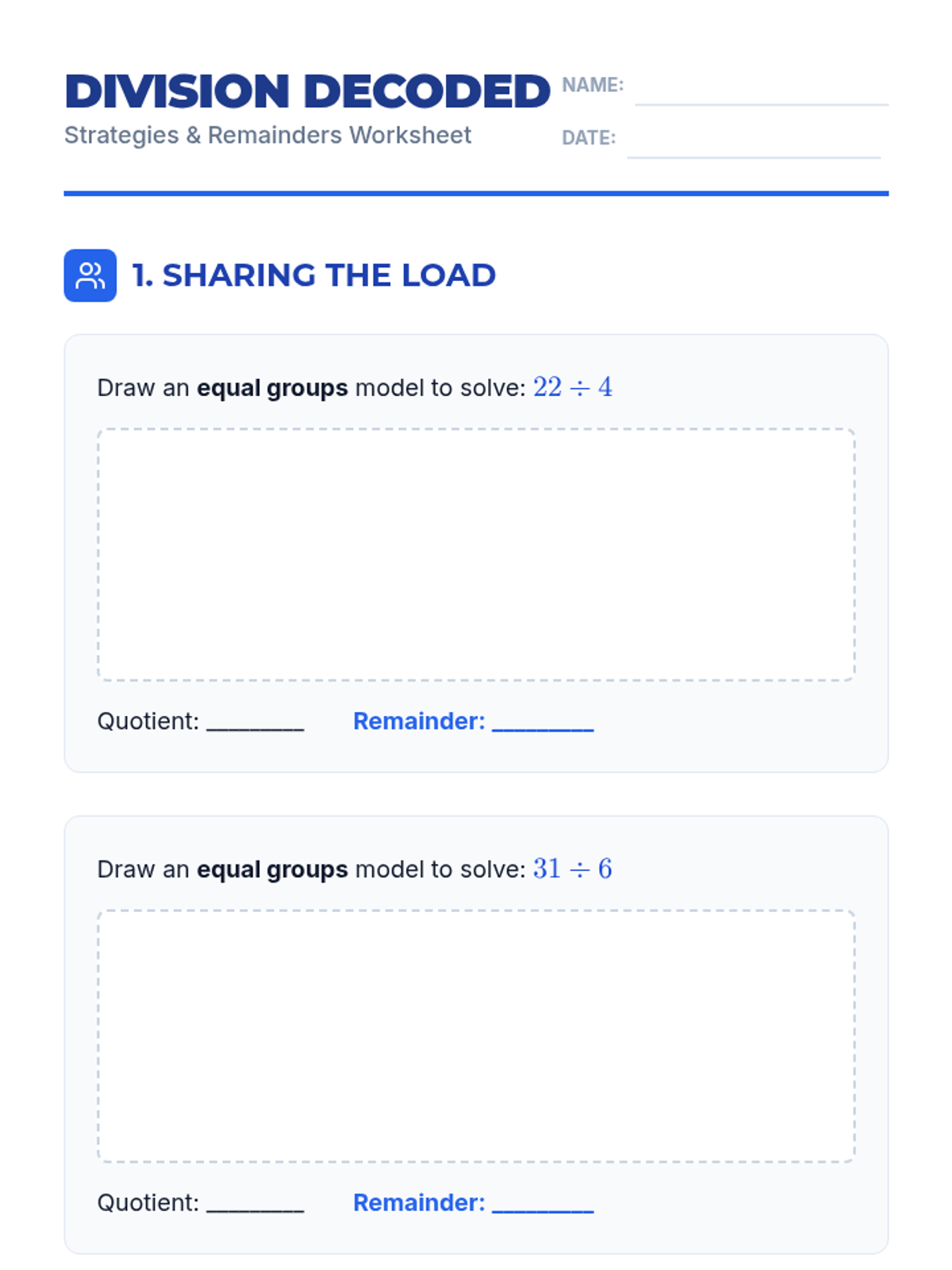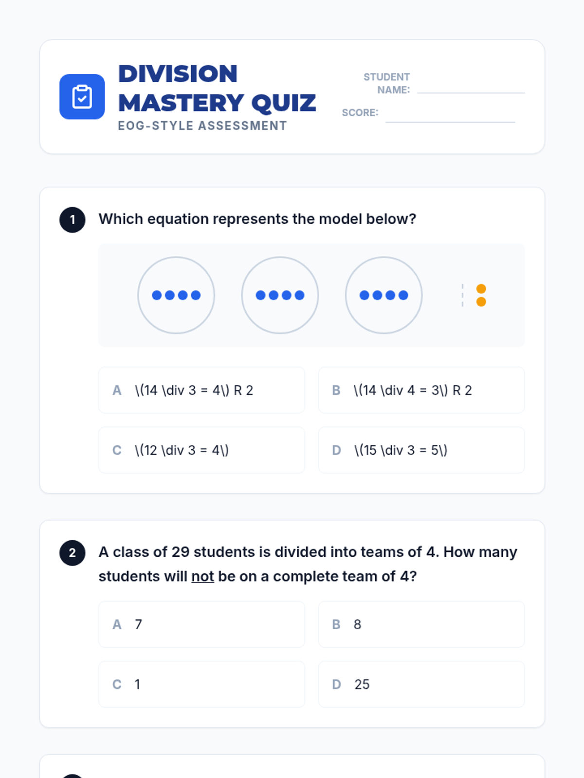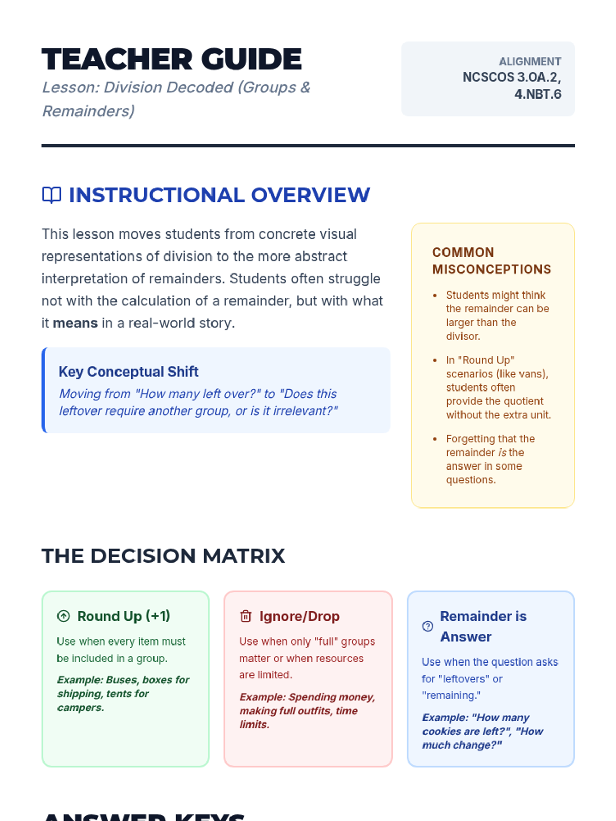 Students explore division through visual models like equal groups and area models, progressing to interpreting remainders in real-world contexts. Includes hands-on practice and EOG-style assessment.