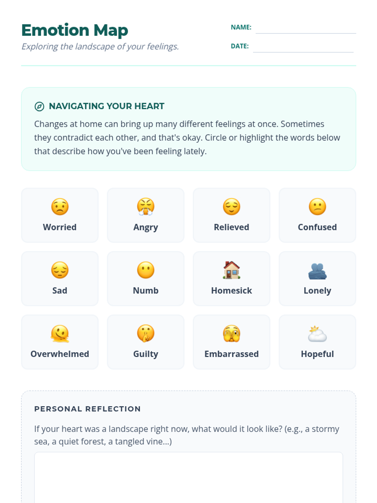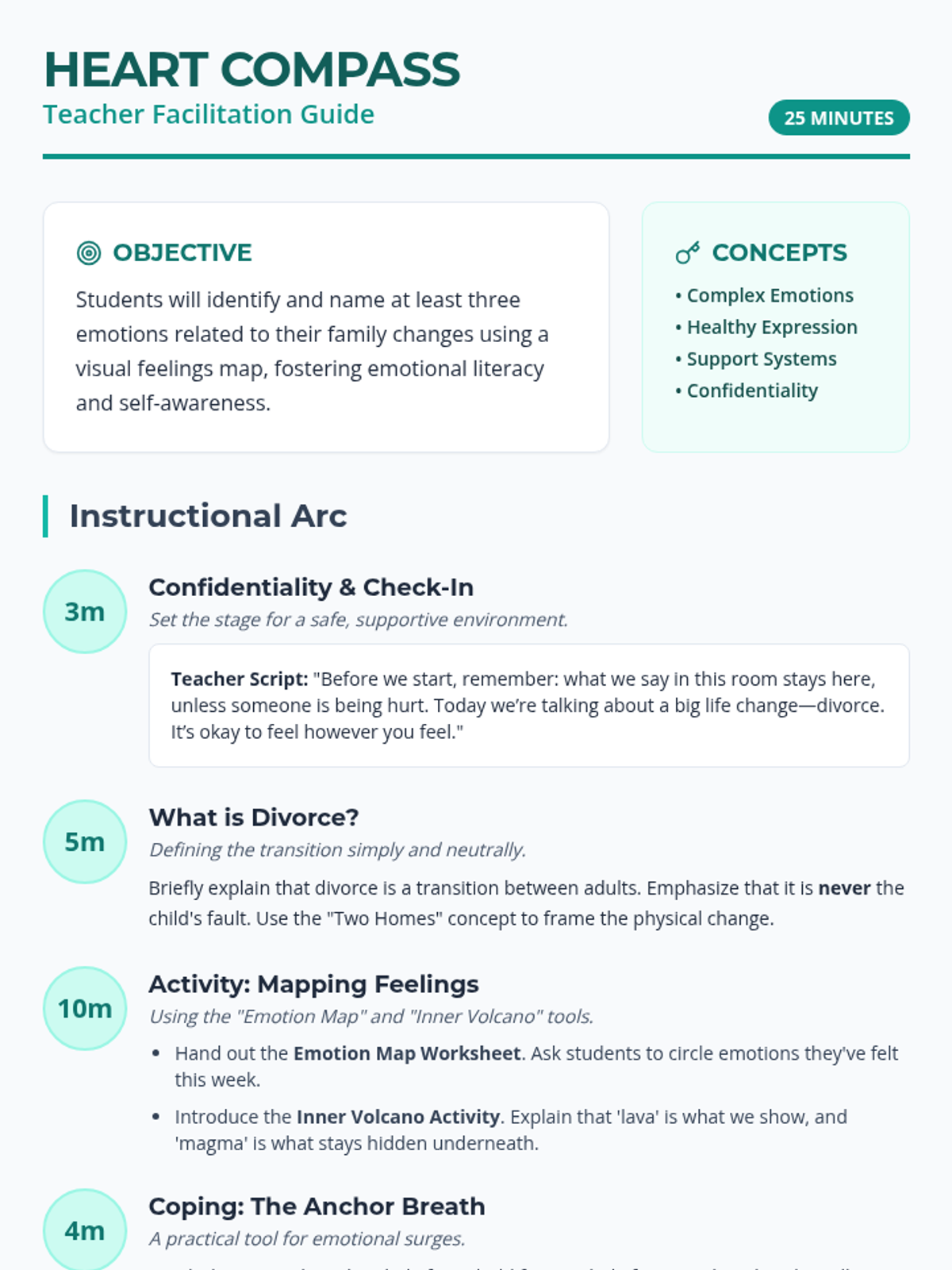 This lesson helps 8th-grade students navigate the complex emotions surrounding parental divorce, providing a safe space to identify feelings and learn healthy expression strategies. Students will use visual tools to map their internal experiences and discover that having multiple, conflicting emotions is normal.