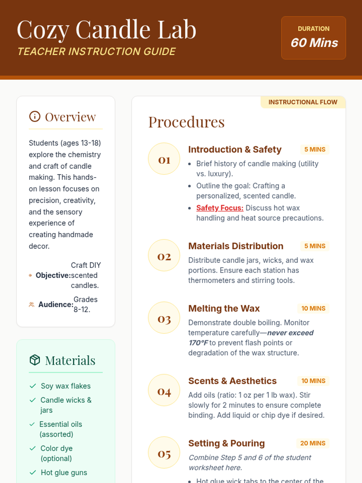 A hands-on workshop where students (ages 13-18) learn the craft of candle making, exploring scents, colors, and the chemistry of wax while creating their own personalized, cozy decor.