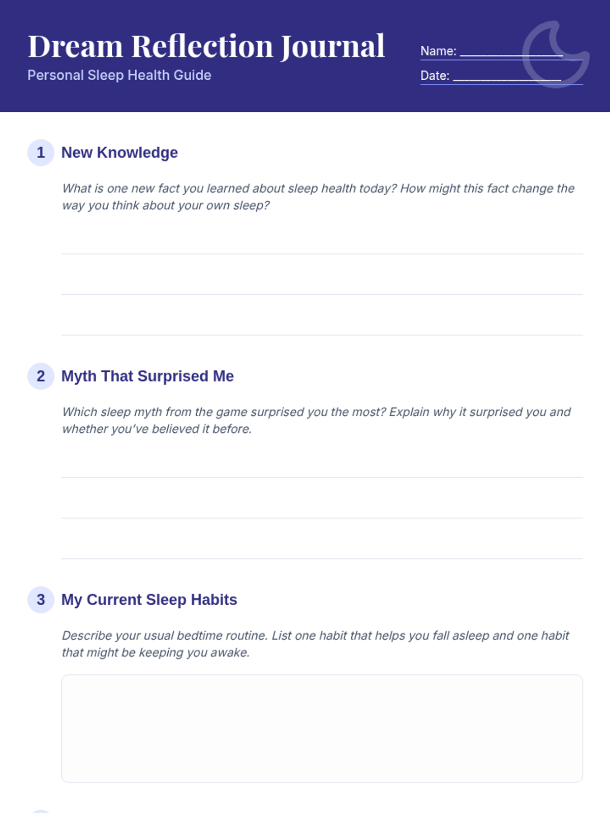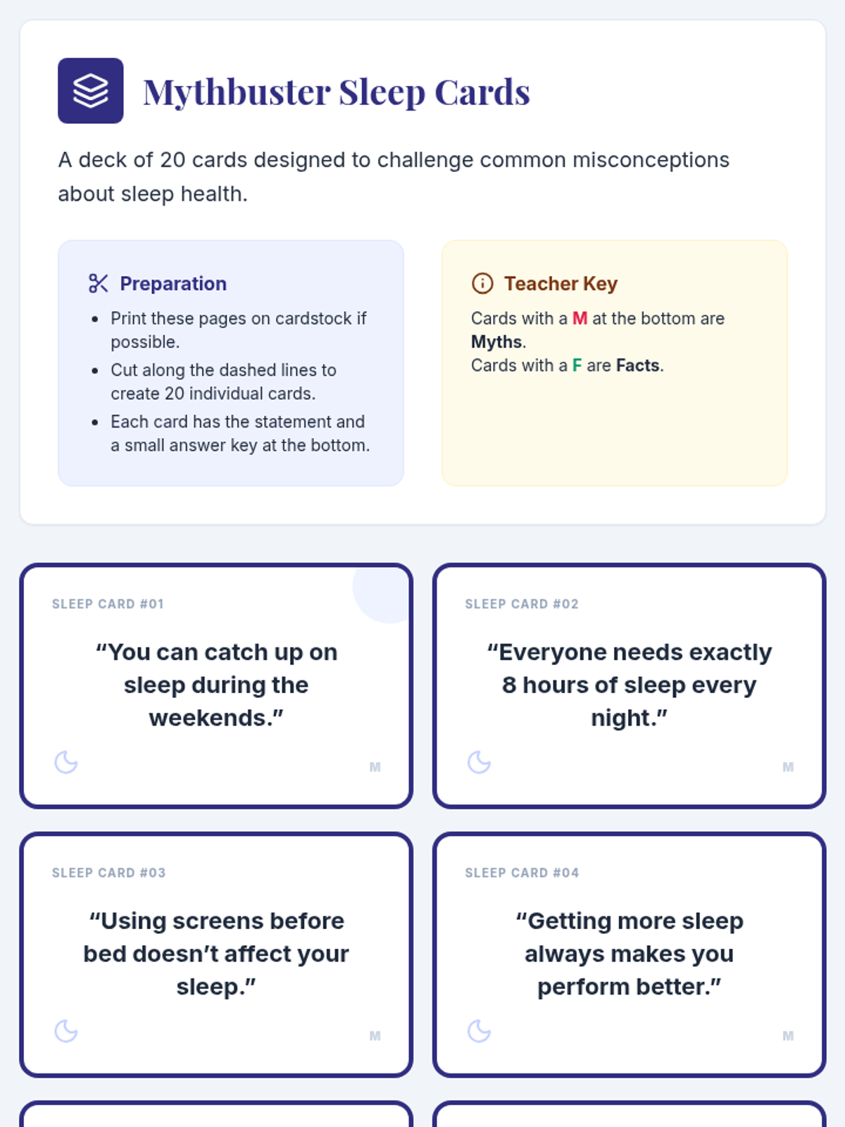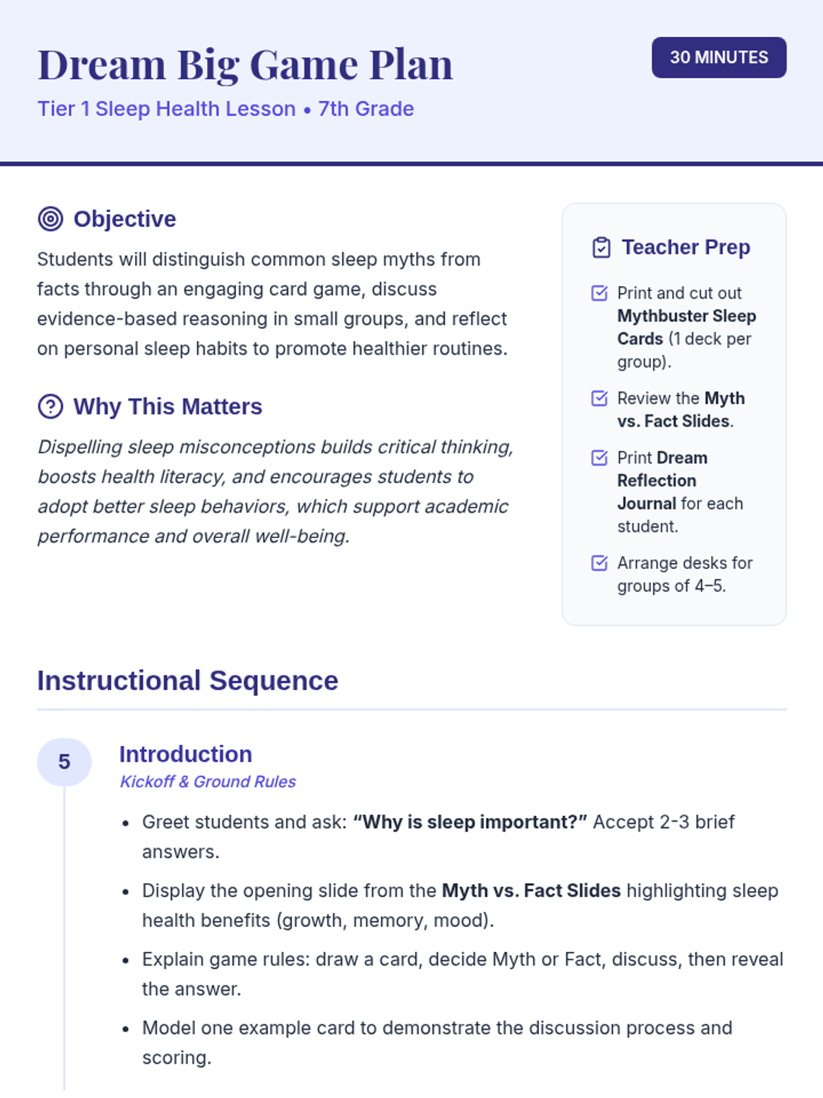 An interactive 30-minute Tier 1 classroom lesson where 7th graders debunk sleep myths through a fast-paced card game and personal reflection. Students build health literacy by identifying evidence-based sleep facts and setting personal goals for better rest.