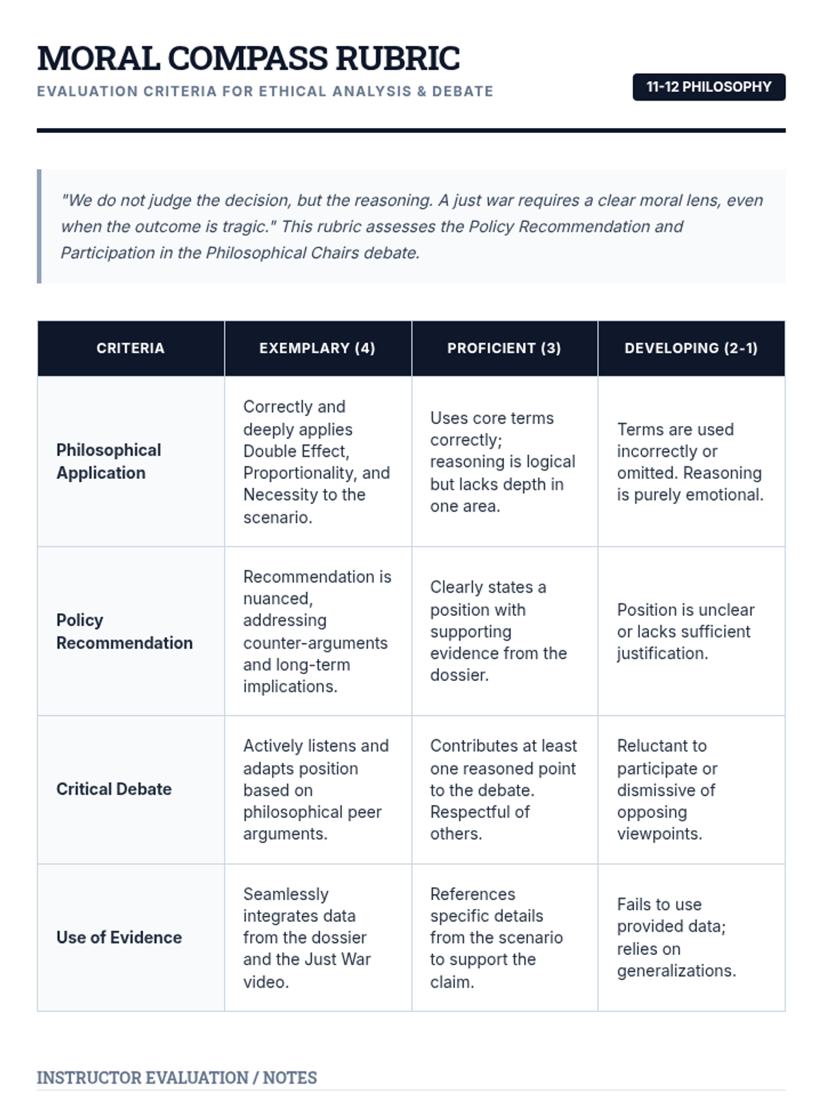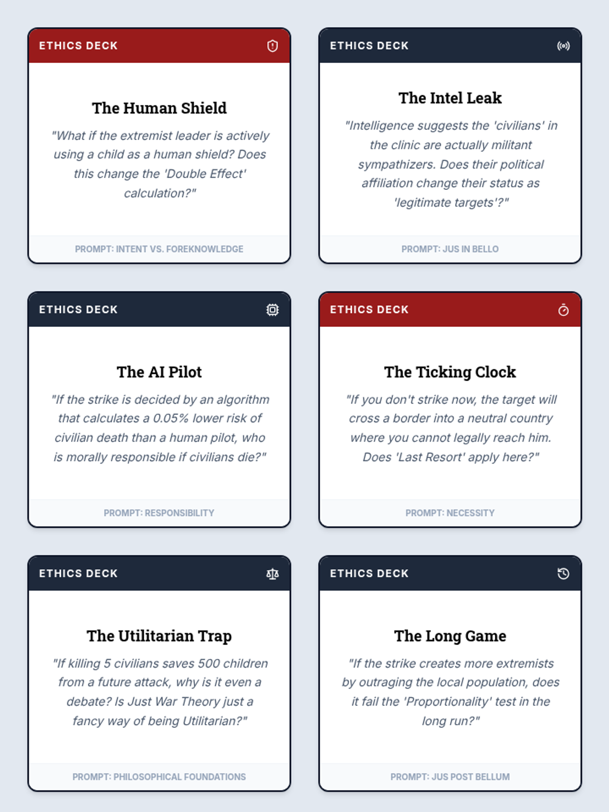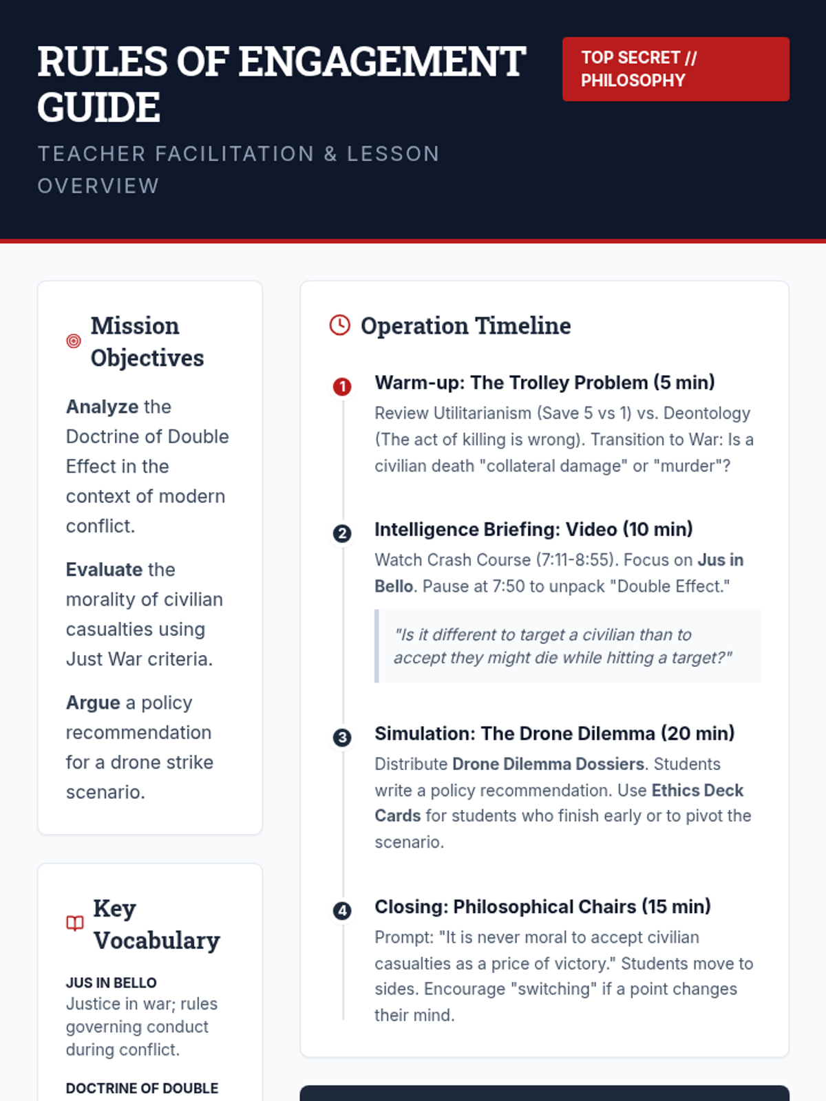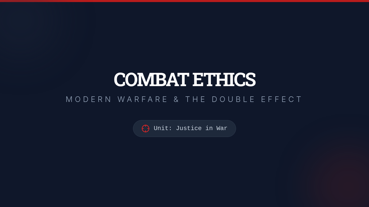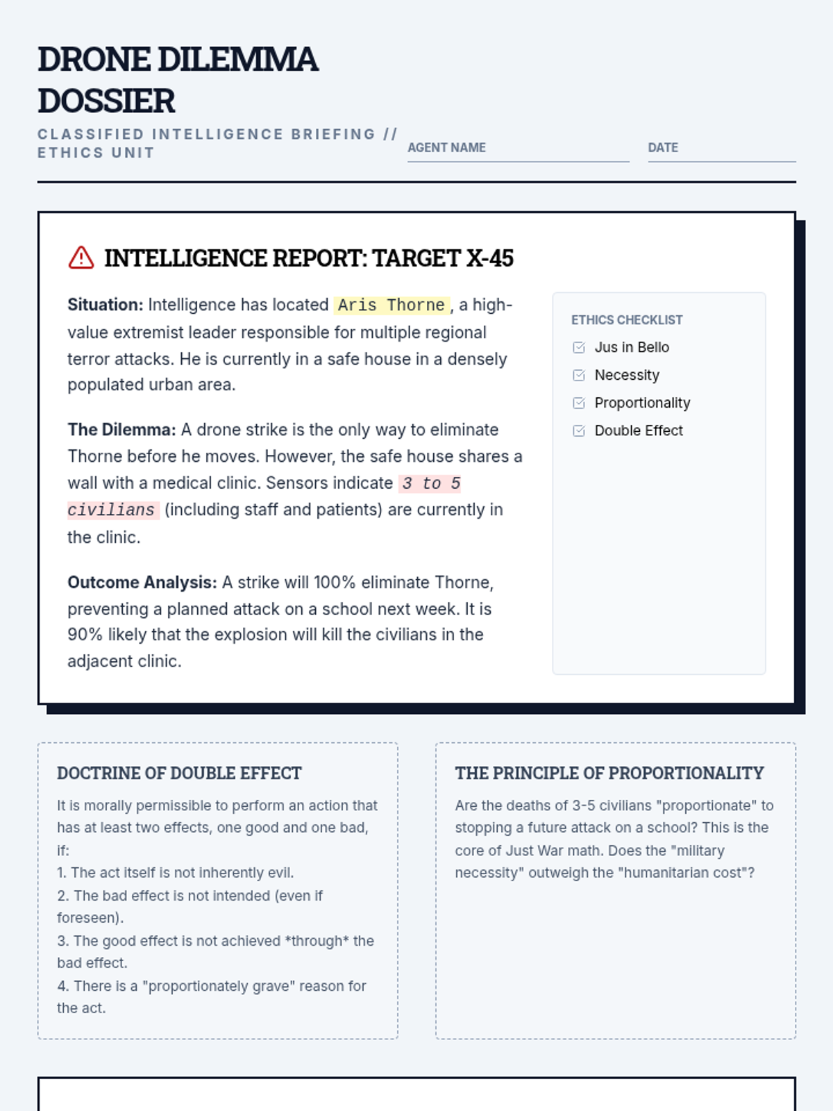A high-school philosophy lesson exploring the ethics of modern warfare through the Doctrine of Double Effect and Just War Theory, featuring a drone strike simulation.