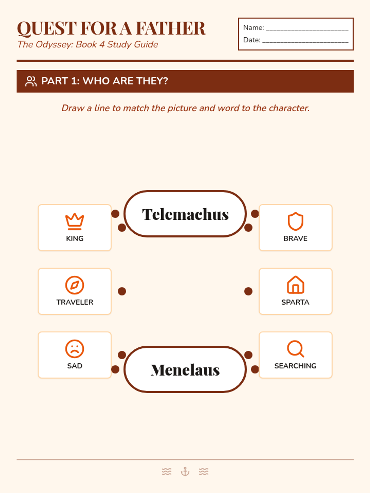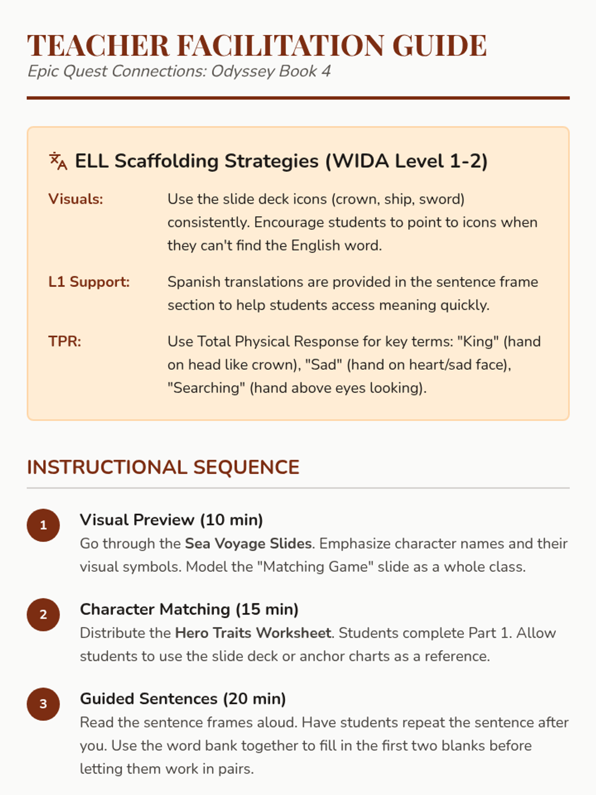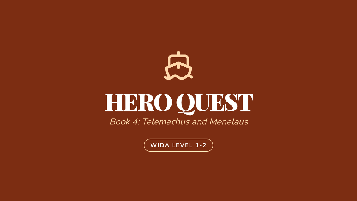 A targeted lesson for ELL students (WIDA Levels 1-2) focusing on character analysis and reading comprehension of Book 4 of the Odyssey, centered on Telemachus and Menelaus.