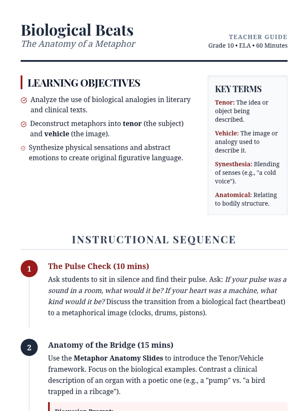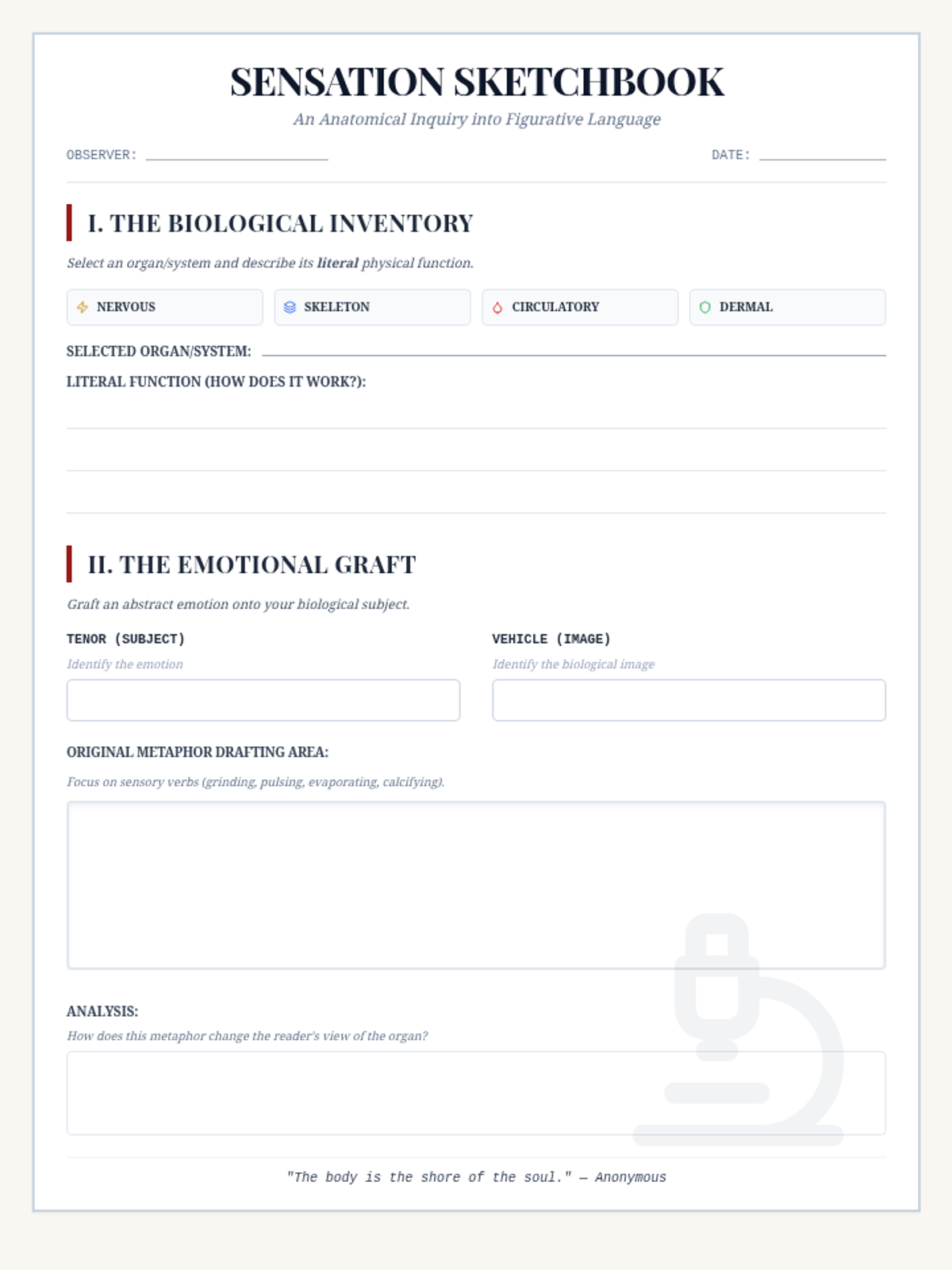 A high school ELA lesson exploring the intersection of biology and poetry. Students analyze how anatomical metaphors bridge physical sensation and complex human emotion, culminating in the creation of their own figurative 'anatomies'.