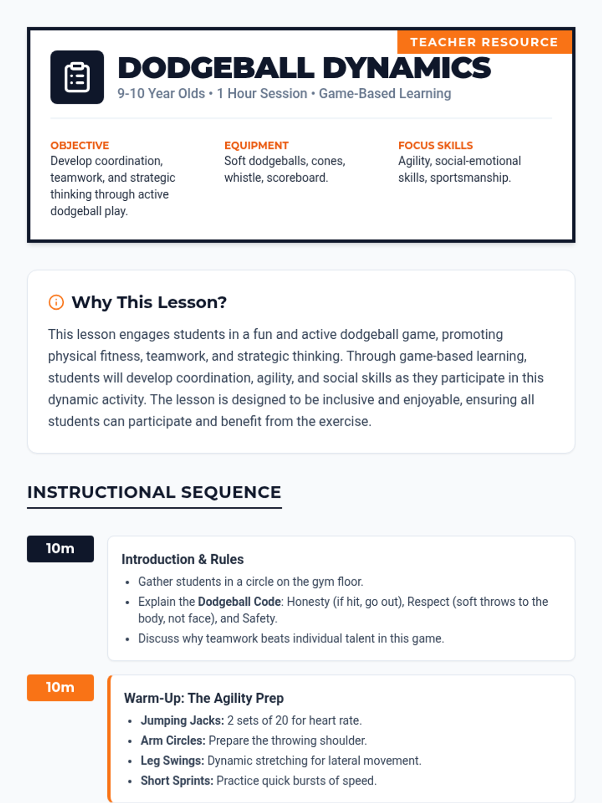 A high-energy PE lesson where students develop coordination, teamwork, and strategic thinking through game-based learning. Students will learn the rules of dodgeball, practice warm-ups, and reflect on their collaborative performance.