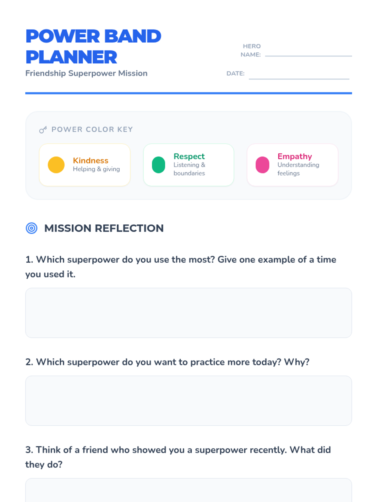 A social-emotional learning lesson that frames kindness, respect, and empathy as 'superpowers' for building strong friendships, featuring a creative bracelet-making craft.