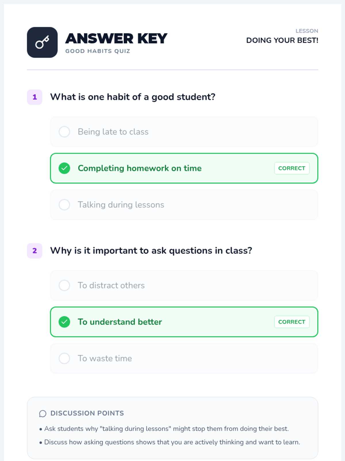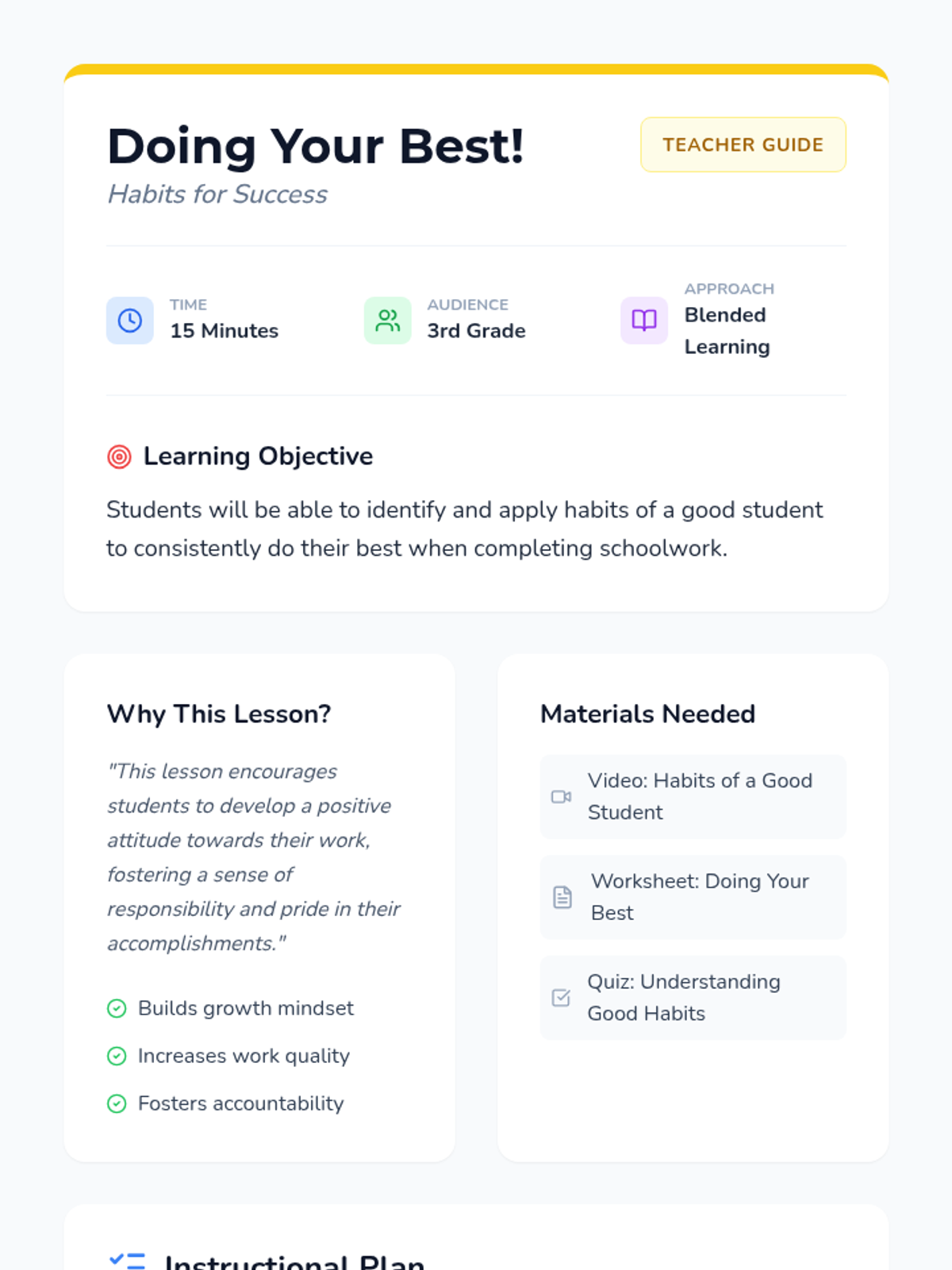 A 15-minute lesson for 3rd graders on the habits of a good student, encouraging responsibility and pride in their work through a video, worksheet, and quiz.