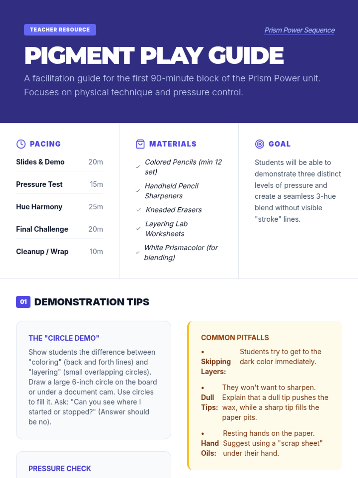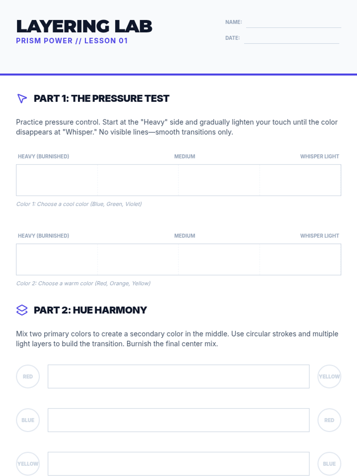 An introduction to colored pencil mechanics, focusing on pressure control, layering multiple colors to create new hues, and the burnishing technique for a professional finish.