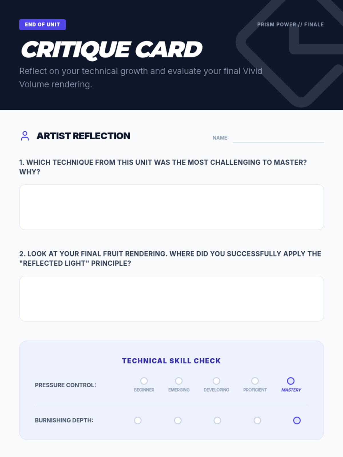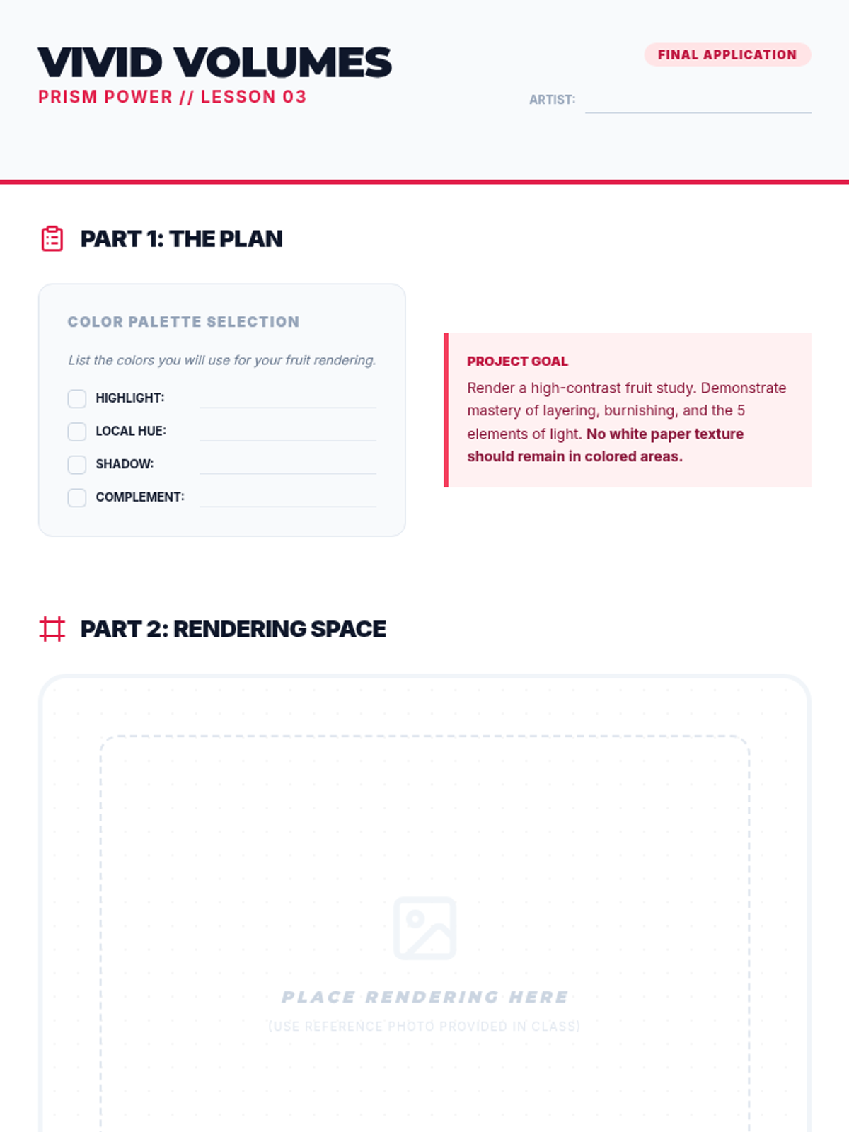 A culminating activity where students render a realistic, high-contrast fruit (like a cherry or grape) to demonstrate their mastery of layering, value, and reflective highlights.