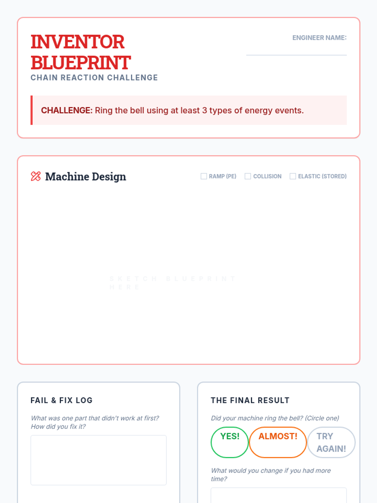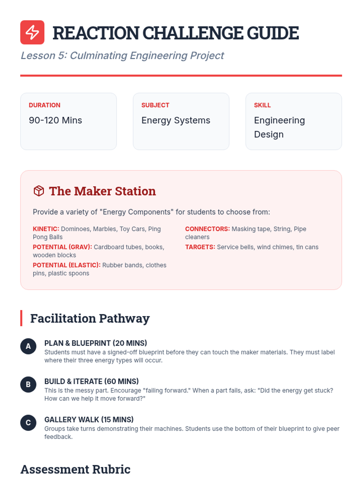 A culminating engineering challenge where students design a domino run to demonstrate their understanding of stored and moving energy.