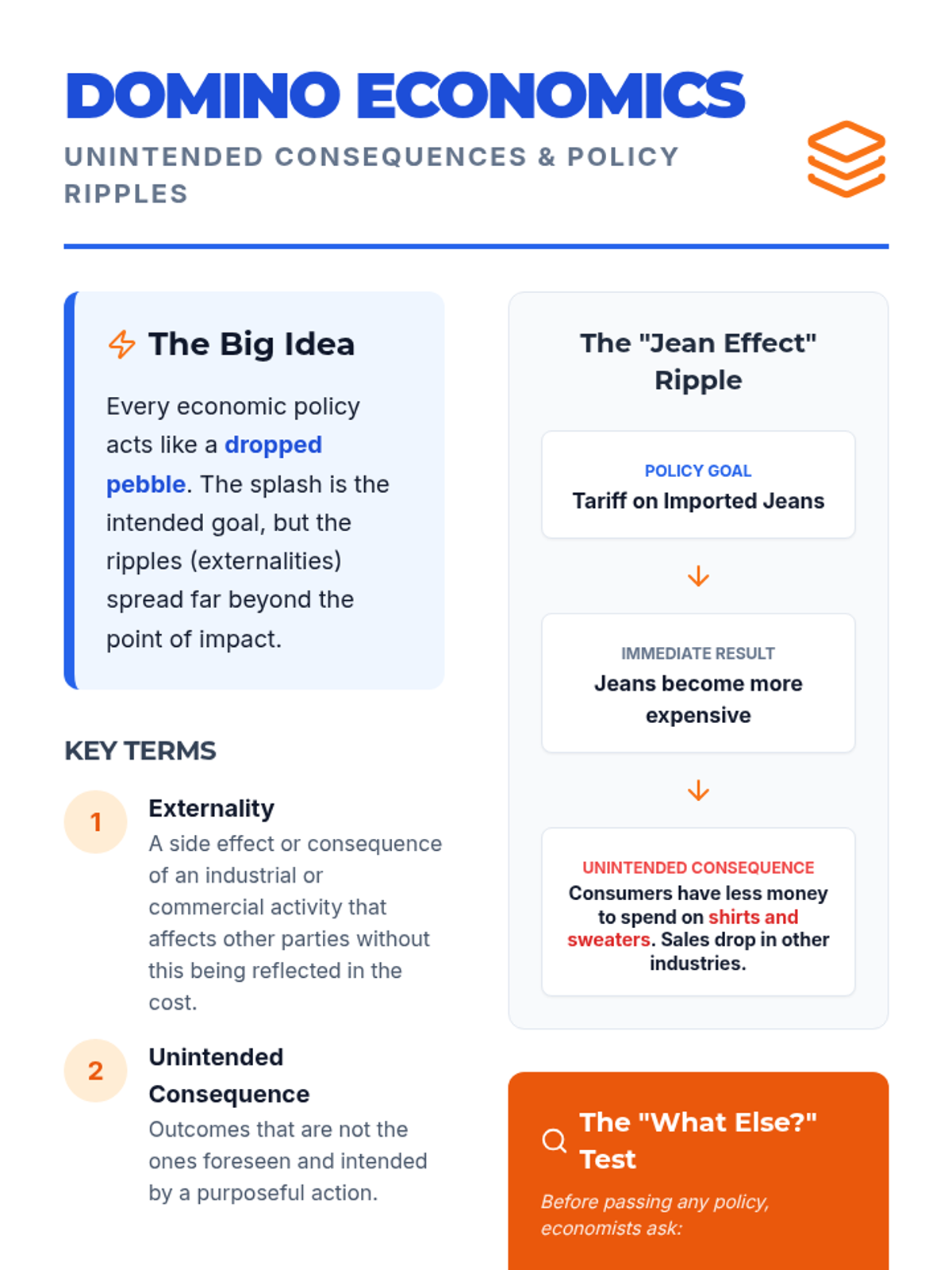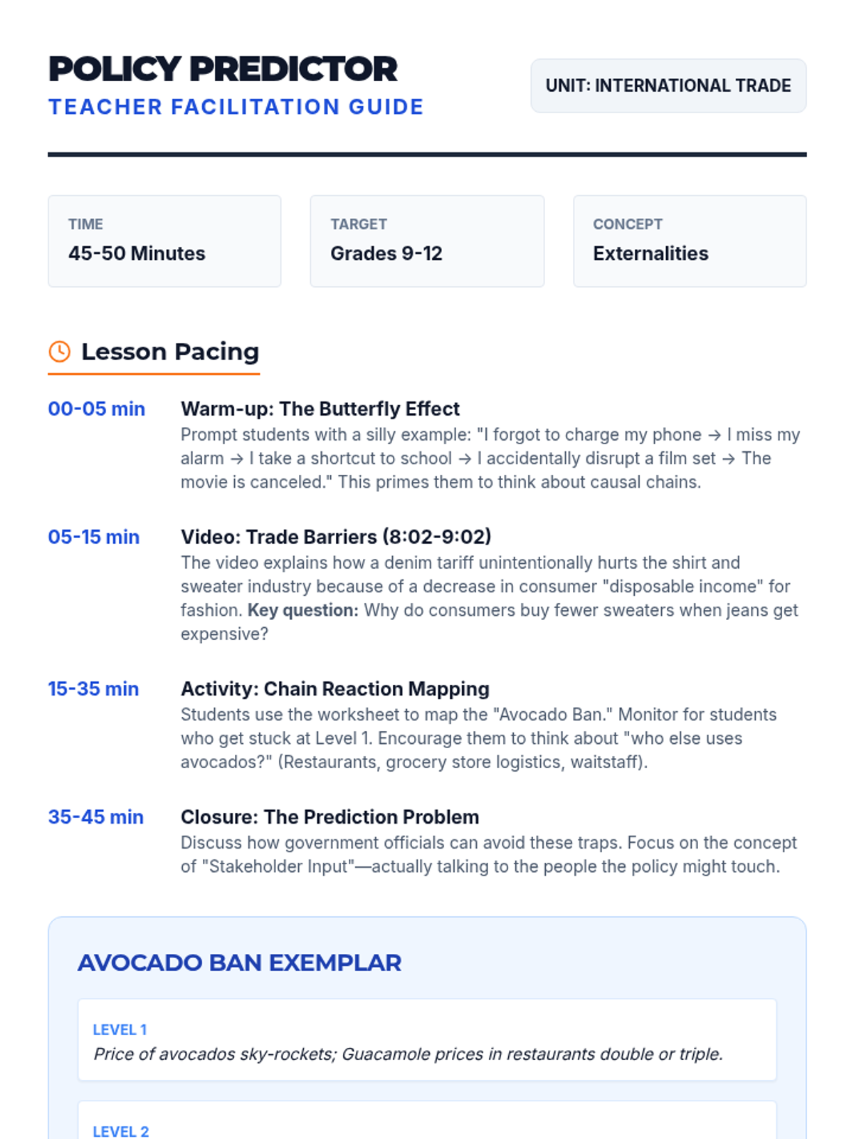 Students will explore how economic policies, such as trade barriers, create ripple effects and unintended consequences throughout an economy using the concept of 'Chain Reaction Mapping'.