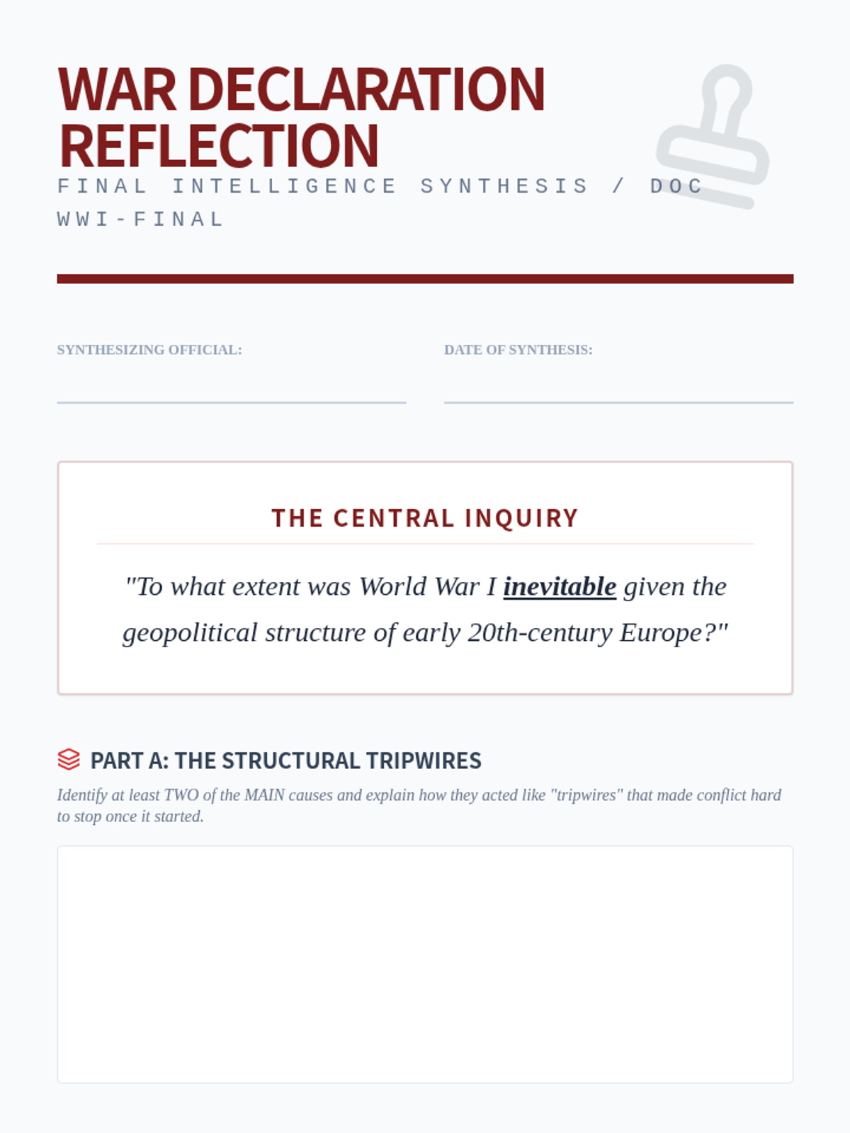 Students analyze the rapid-fire declarations of war in July 1914 and synthesize their learning by evaluating the inevitability of the conflict.