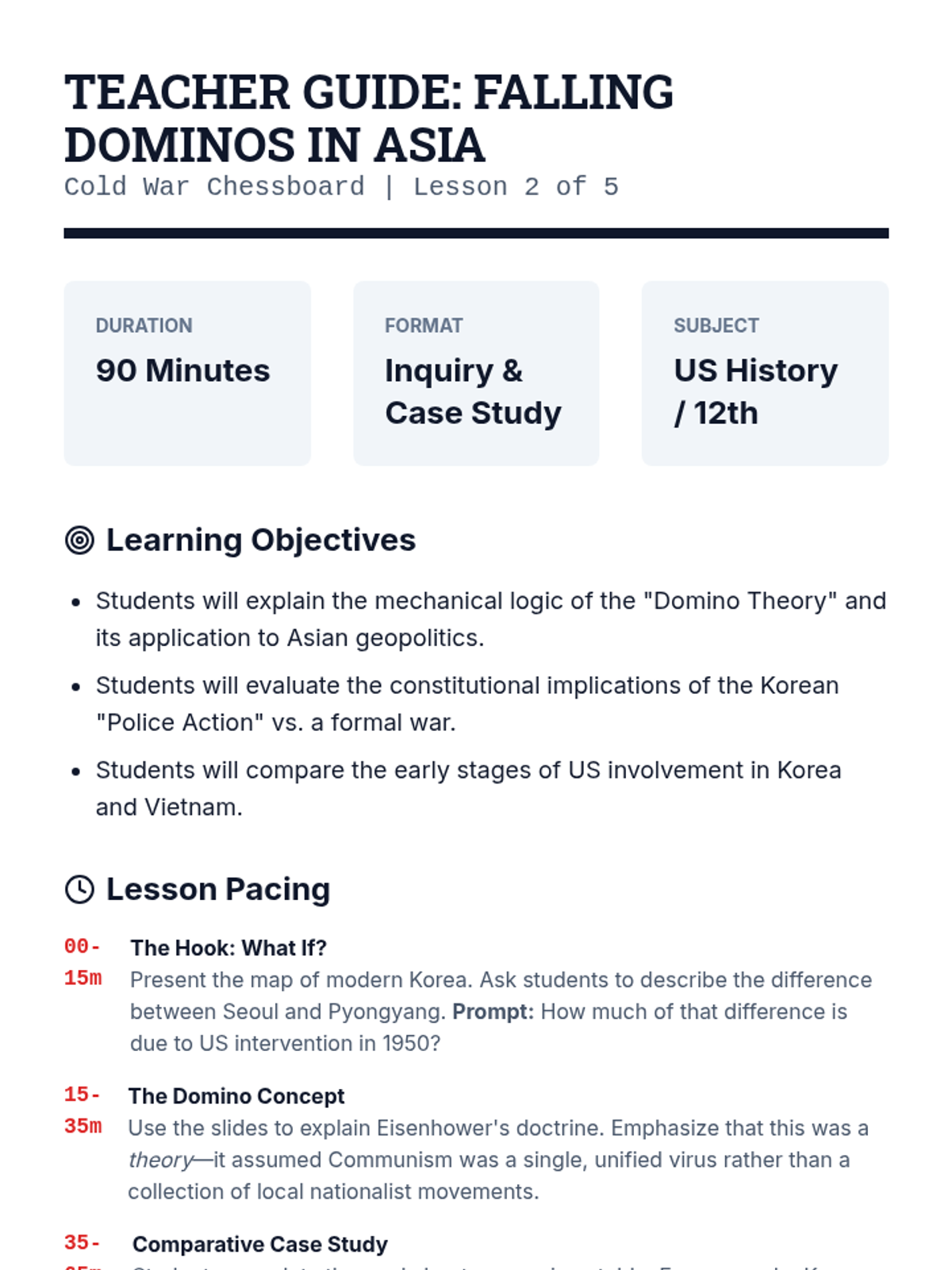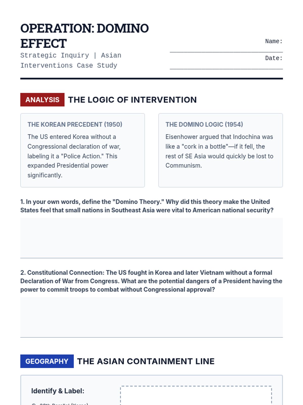 Analyze the Domino Theory's role in shifting US focus to Asia. Students debate the justifications for intervention in Korea and early Vietnam, assessing the impact of military action without formal declarations of war.