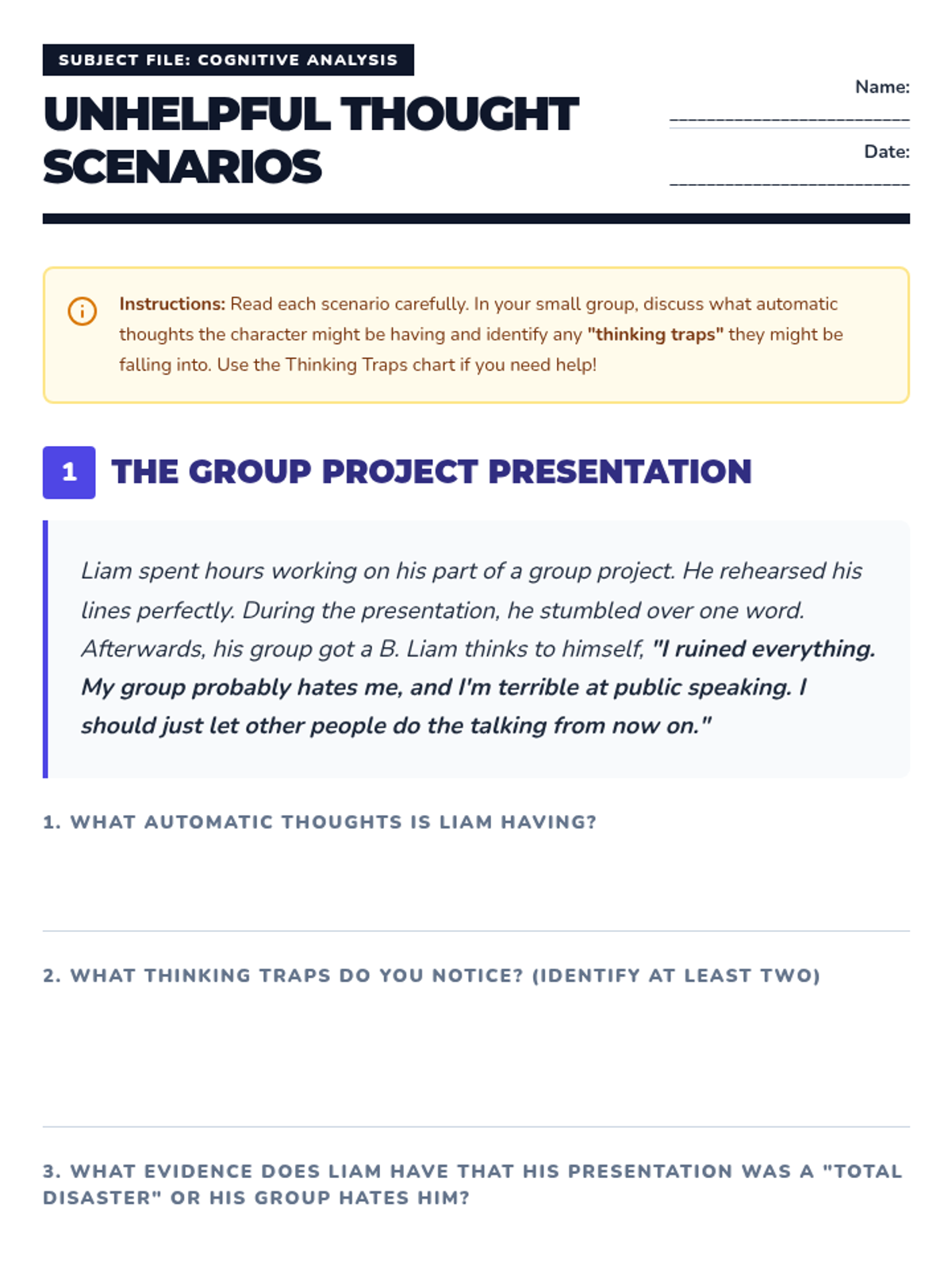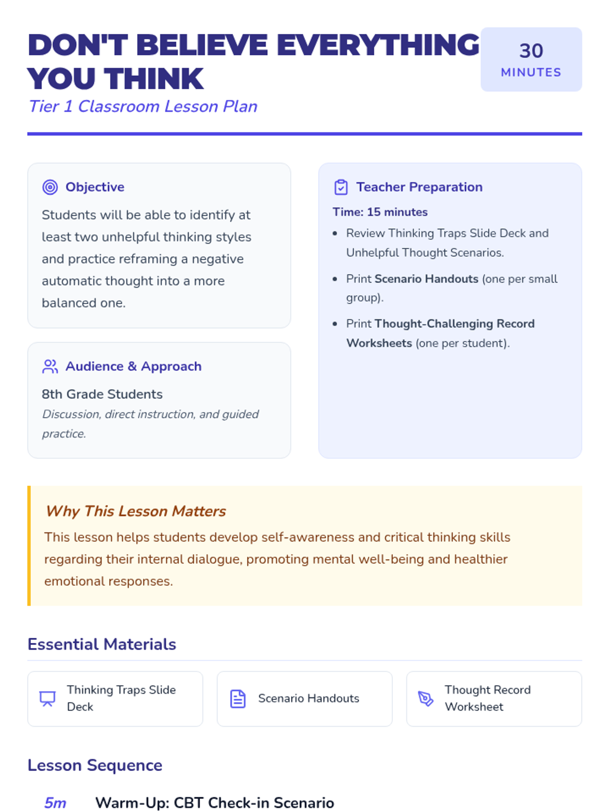This lesson helps 8th-grade students recognize and challenge unhelpful automatic thoughts. By understanding common 'thinking traps,' students will learn to reframe negative thoughts into more balanced perspectives, fostering healthier emotional responses and improving overall well-being.