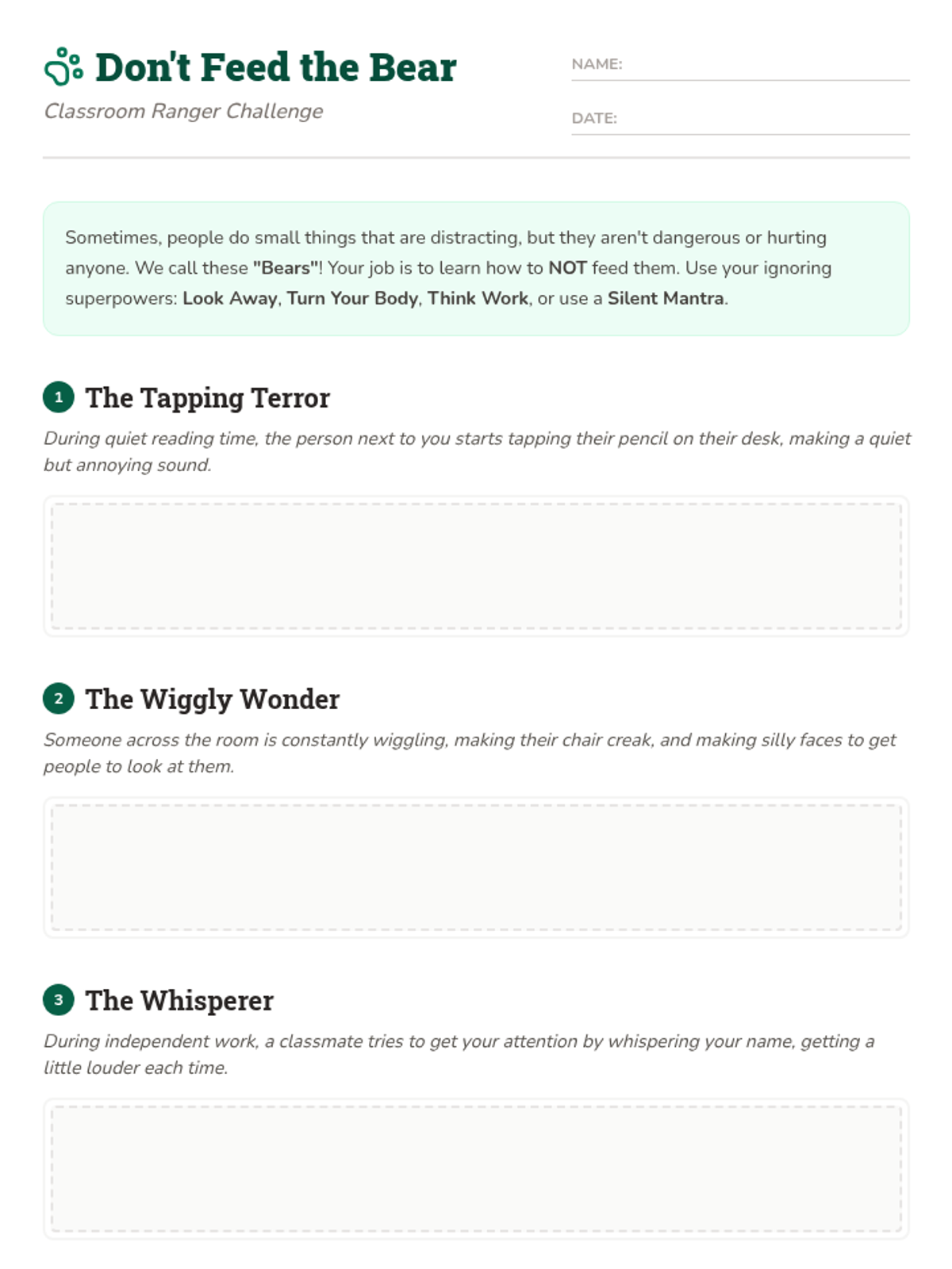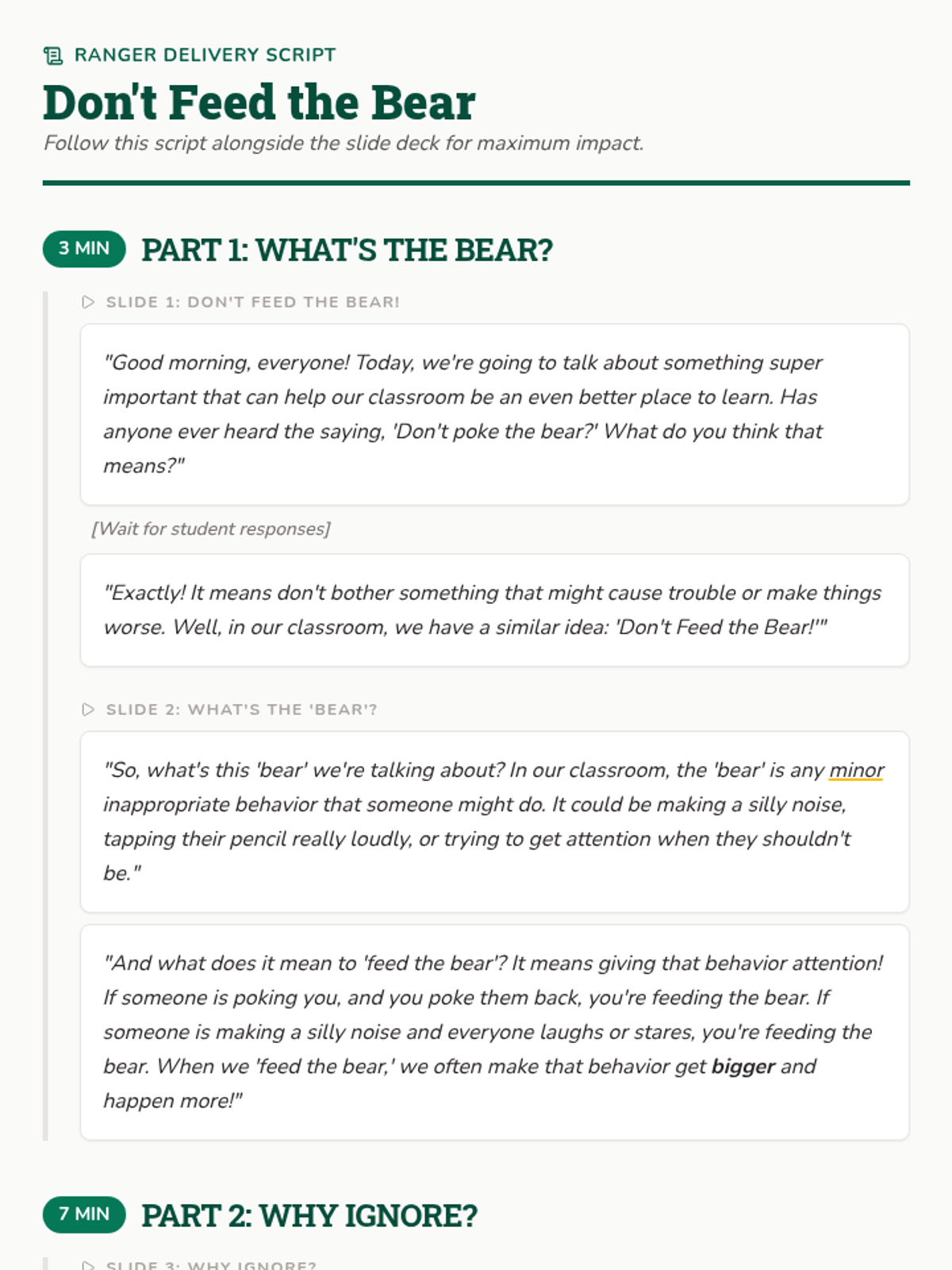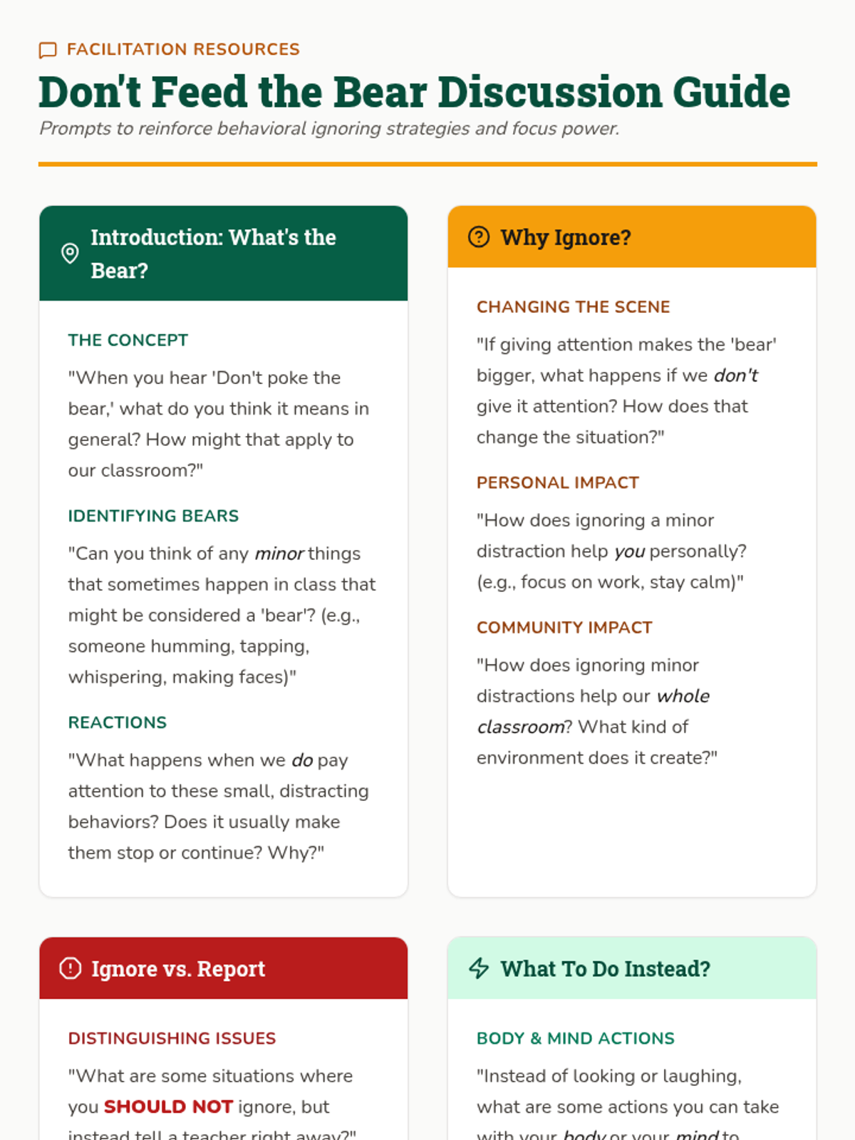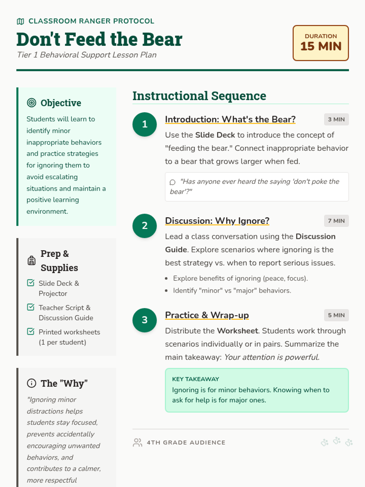 A quick 15-minute Tier 1 review lesson for 4th graders on ignoring minor inappropriate behaviors to maintain focus and a positive classroom environment. Students learn that their attention is like 'food' for behavioral 'bears'.