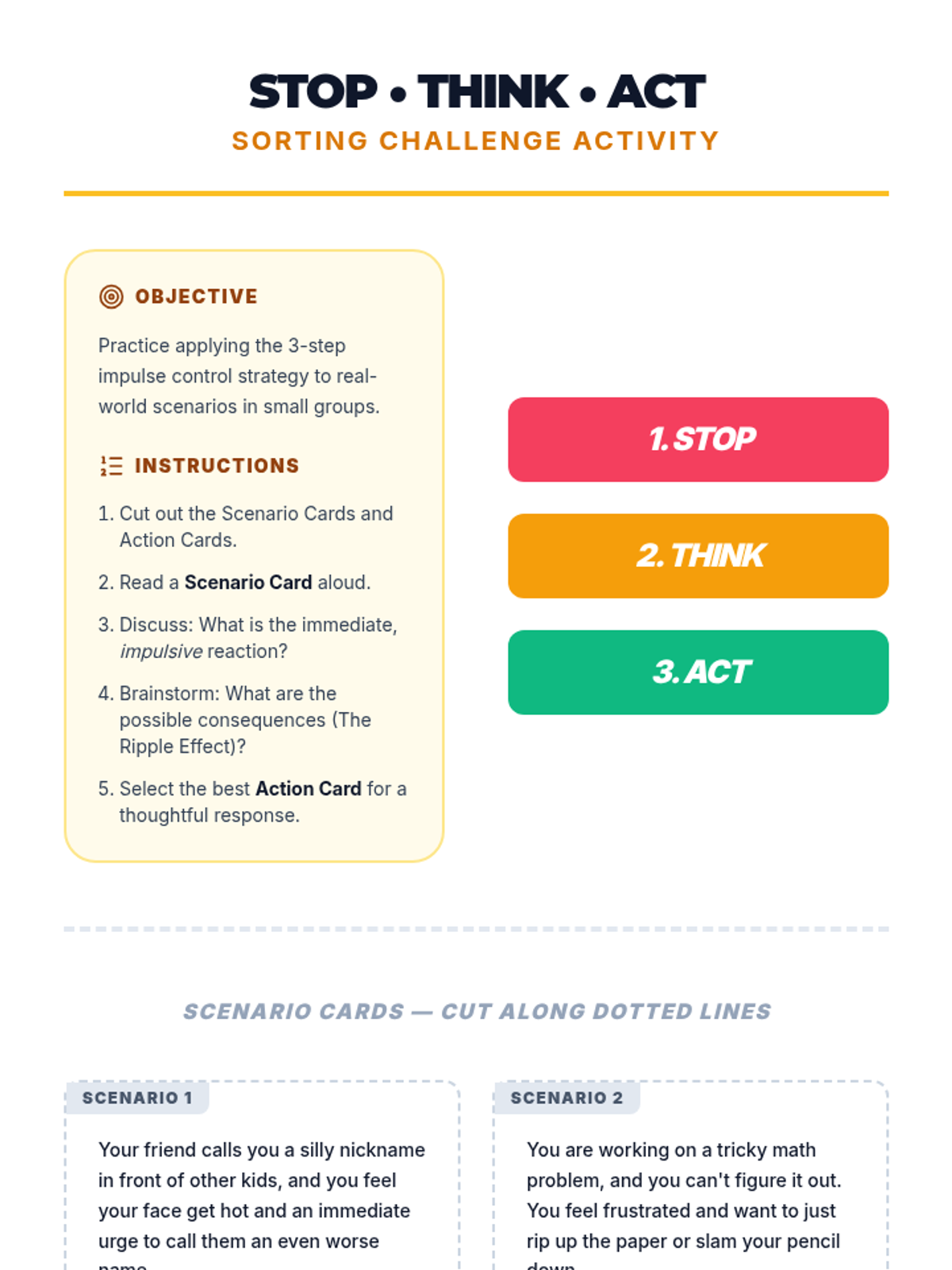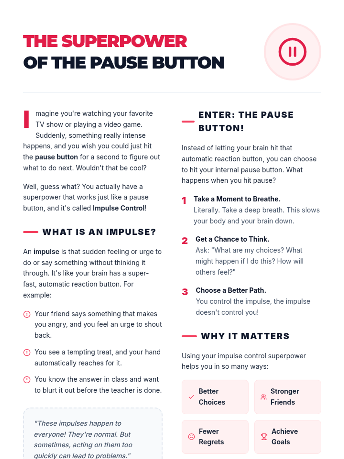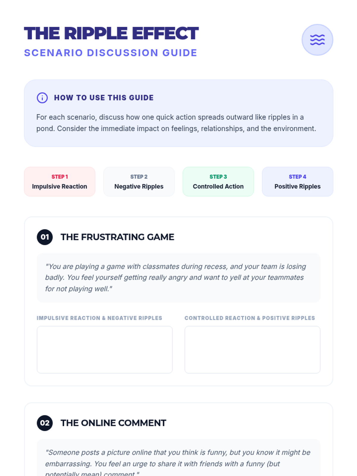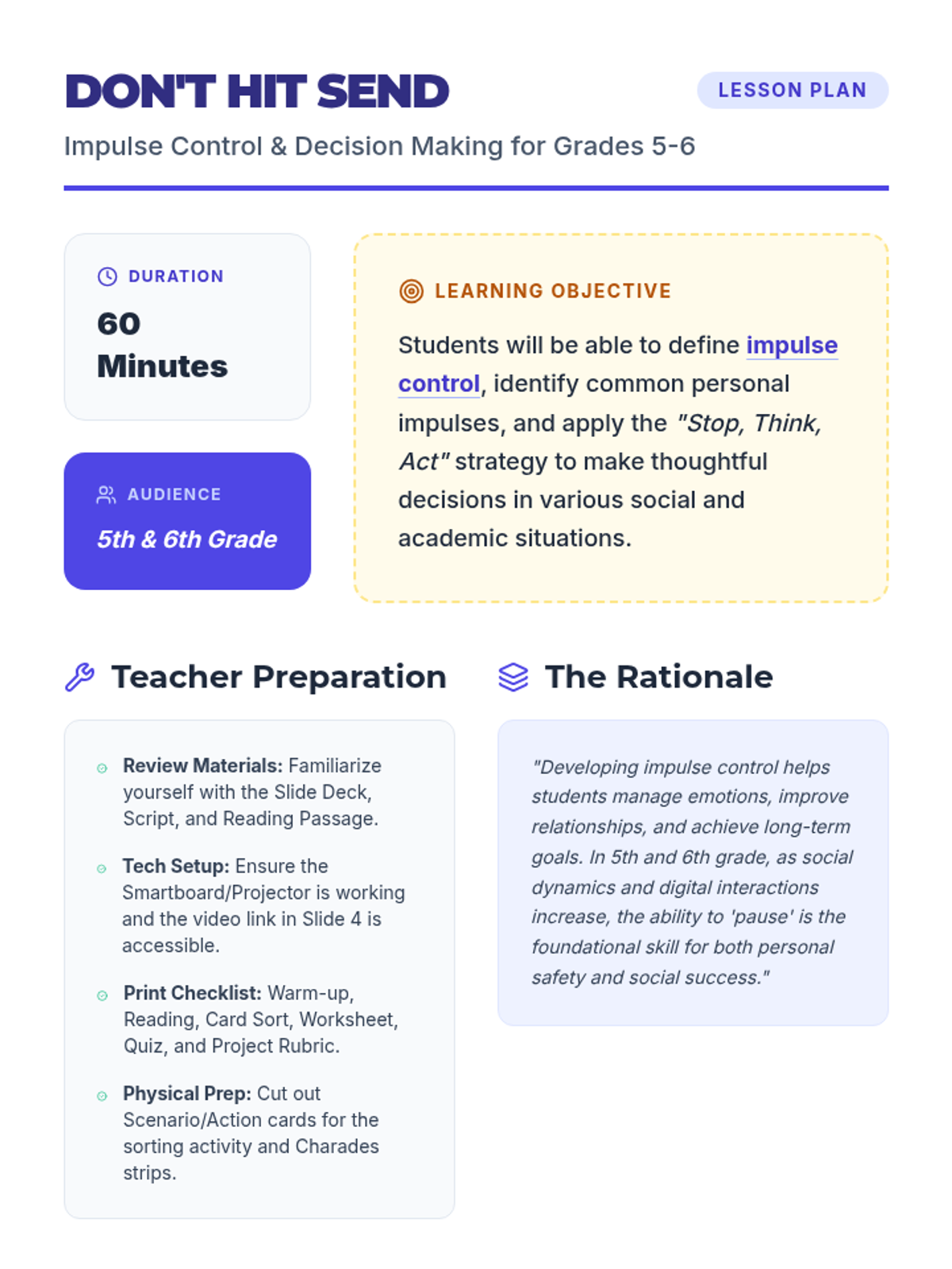 A comprehensive 60-minute lesson for 5th and 6th graders on impulse control, featuring the 'Pause Button' strategy and the 'Ripple Effect' concept. students will learn to recognize impulses, use 'Stop, Think, Act', and create personal control plans.