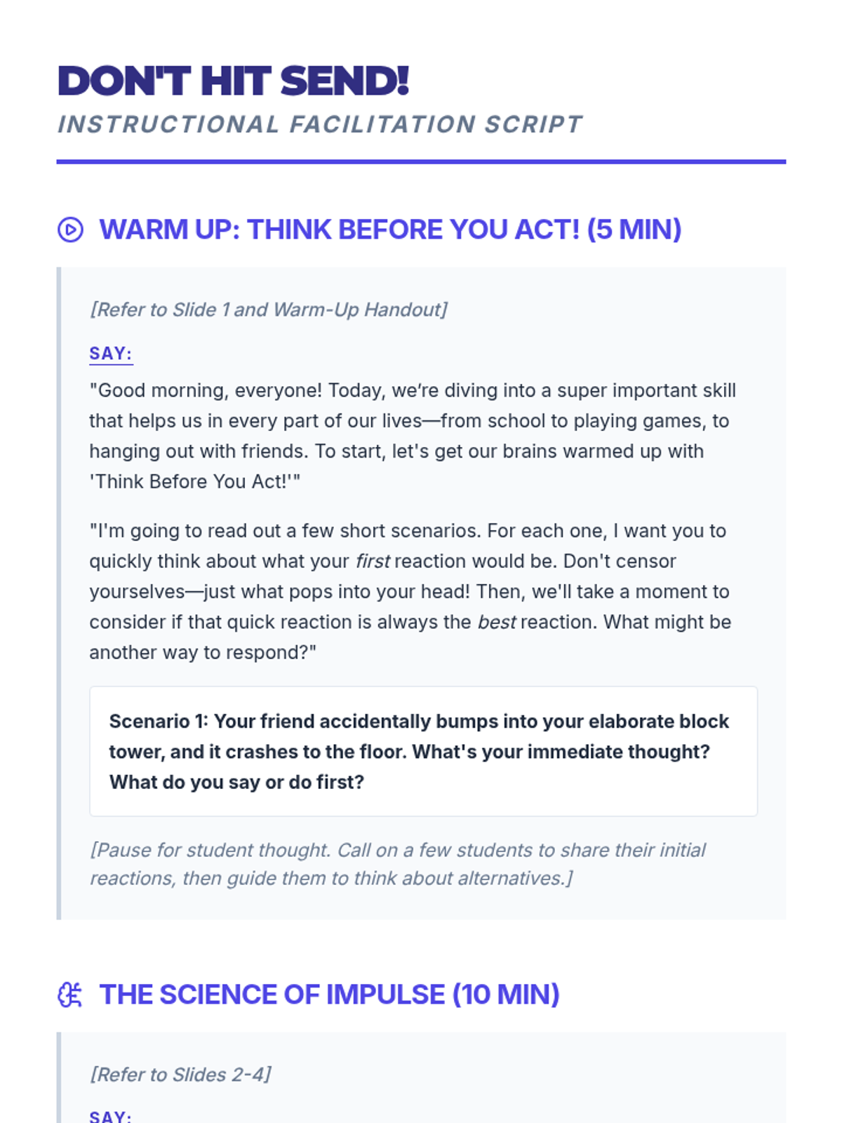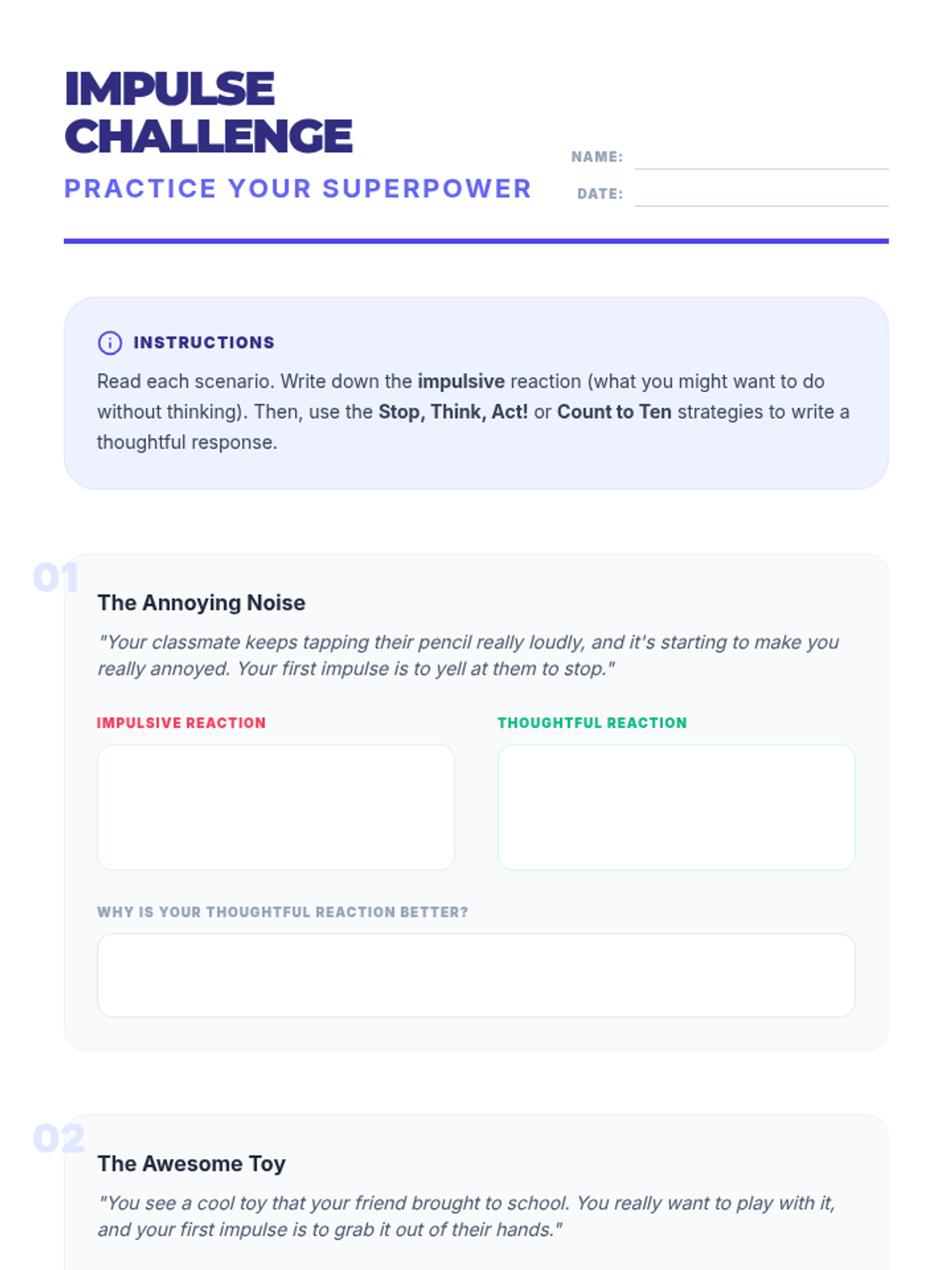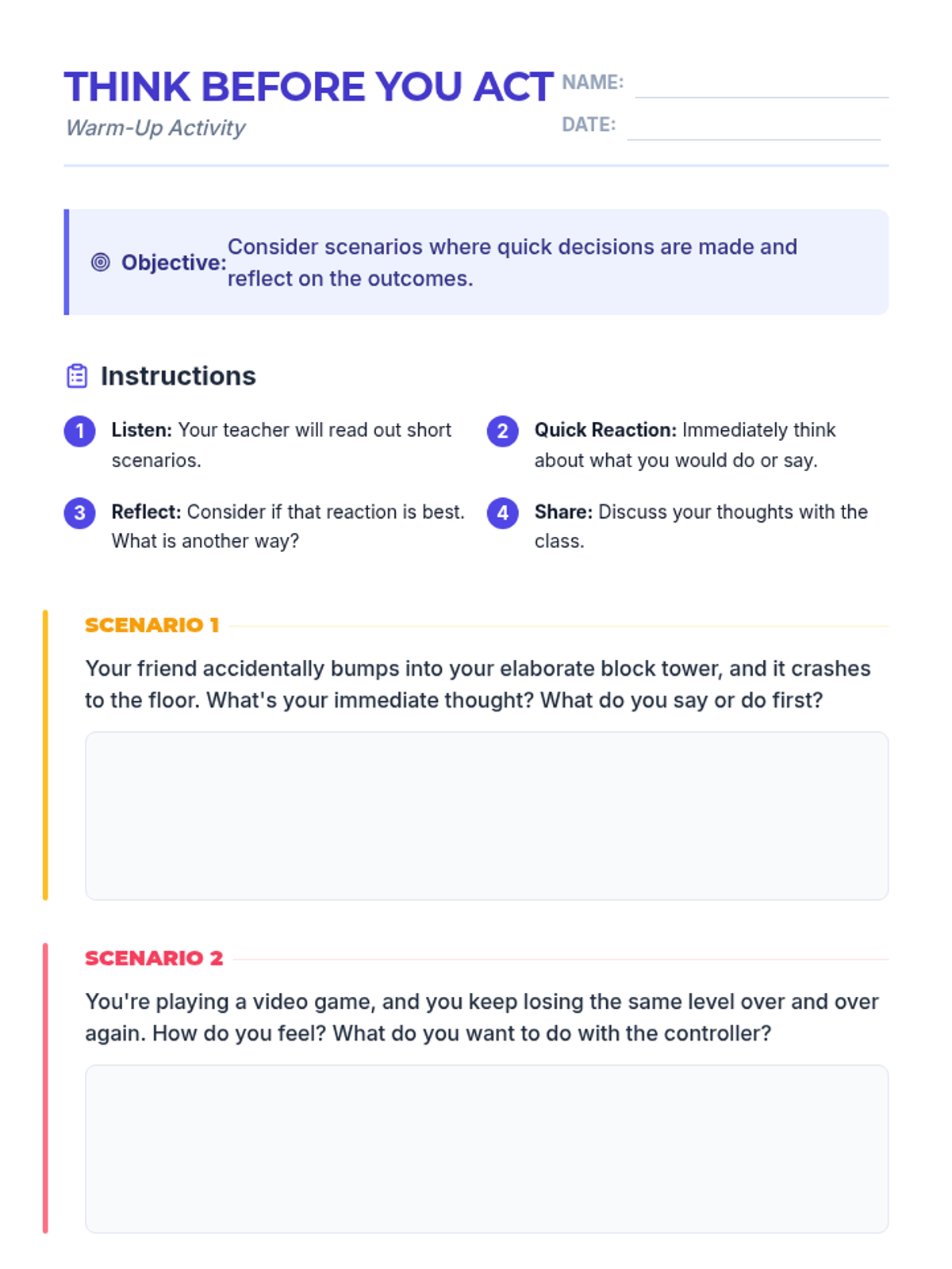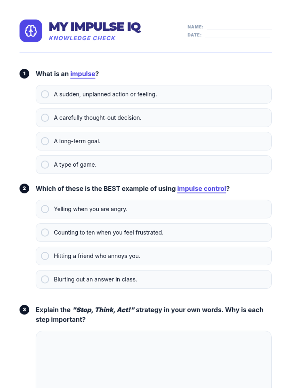 A comprehensive 60-minute lesson for 5th and 6th graders on impulse control, featuring the 'Pause Button' strategy and the 'Ripple Effect' concept. students will learn to recognize impulses, use 'Stop, Think, Act', and create personal control plans.