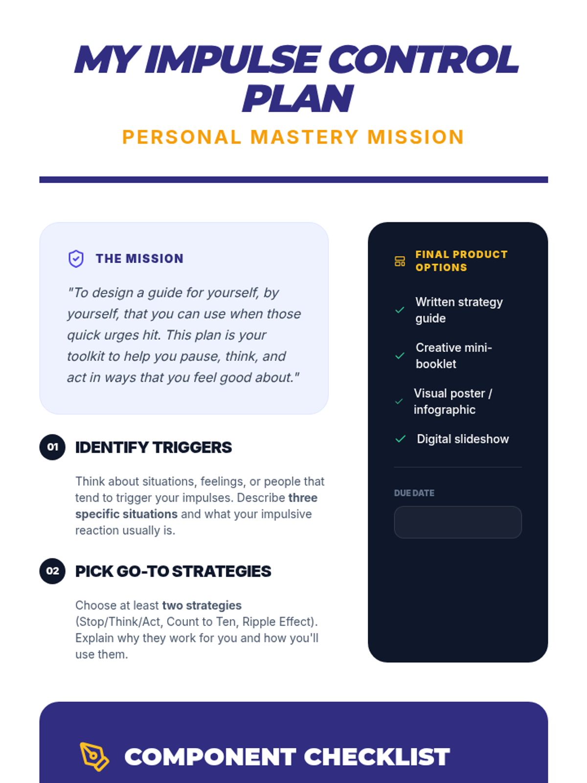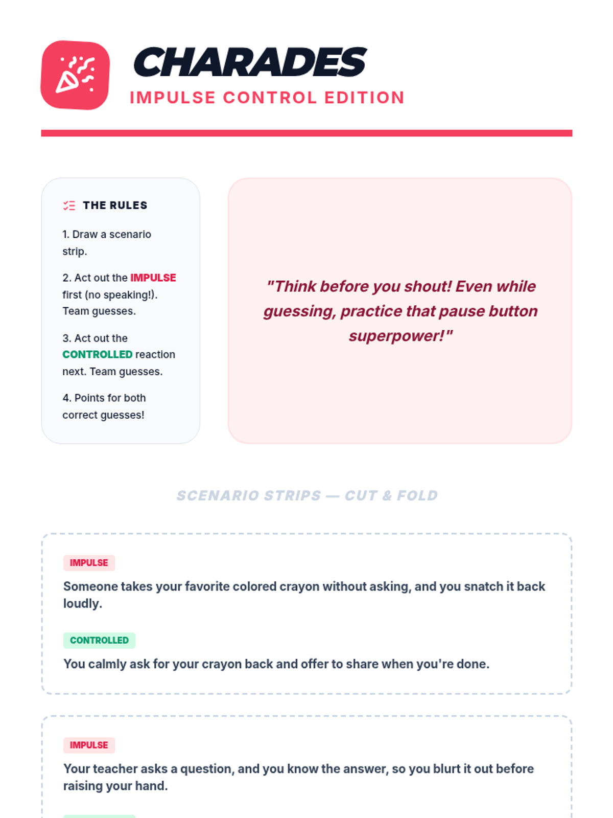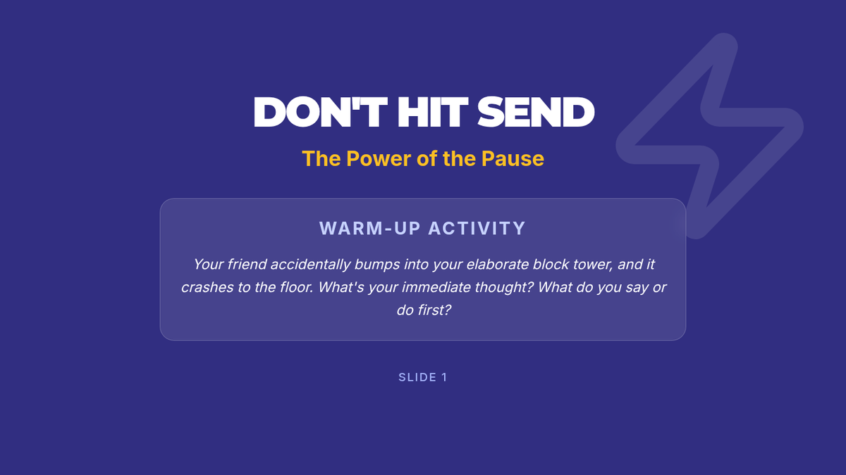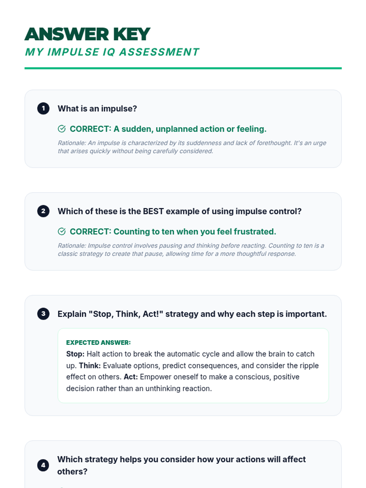 A comprehensive 60-minute lesson for 5th and 6th graders on impulse control, featuring the 'Pause Button' strategy and the 'Ripple Effect' concept. students will learn to recognize impulses, use 'Stop, Think, Act', and create personal control plans.