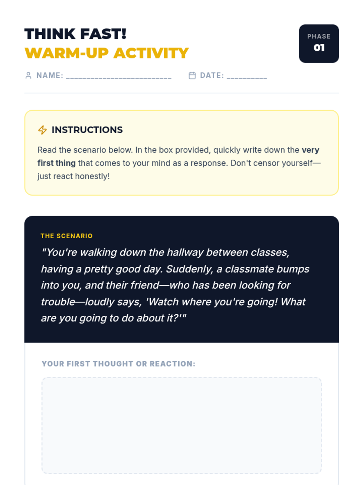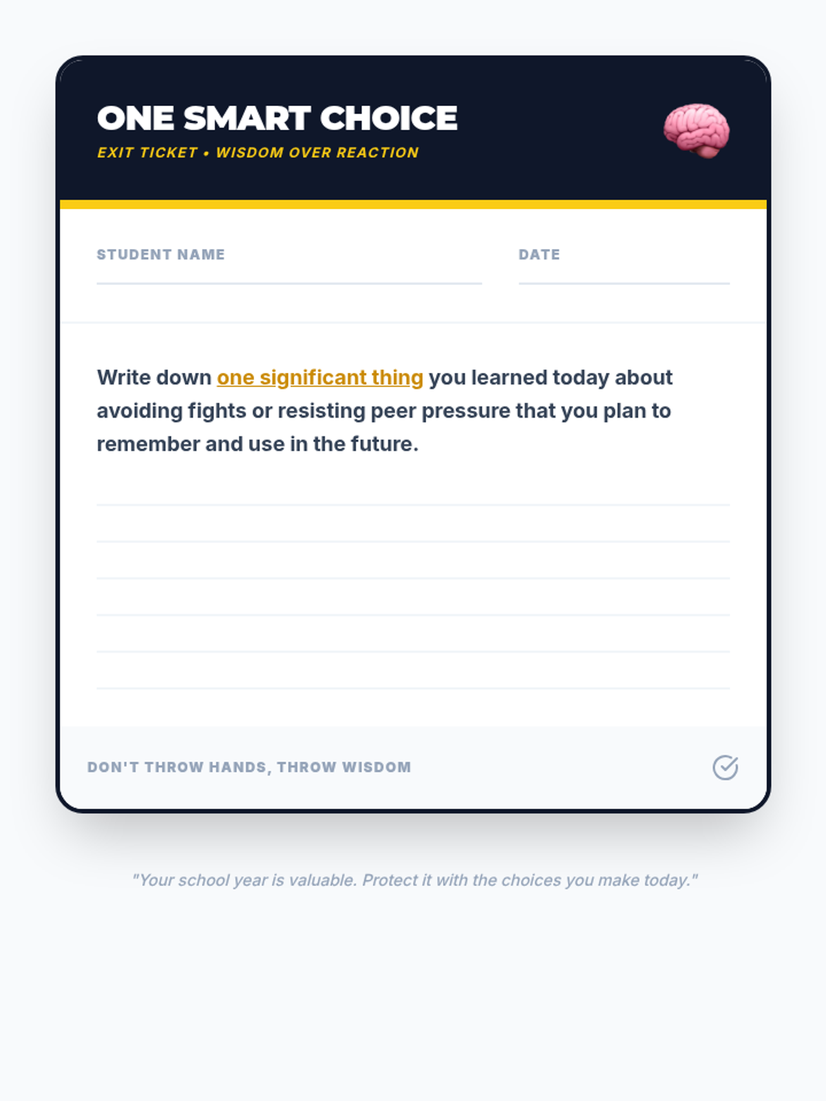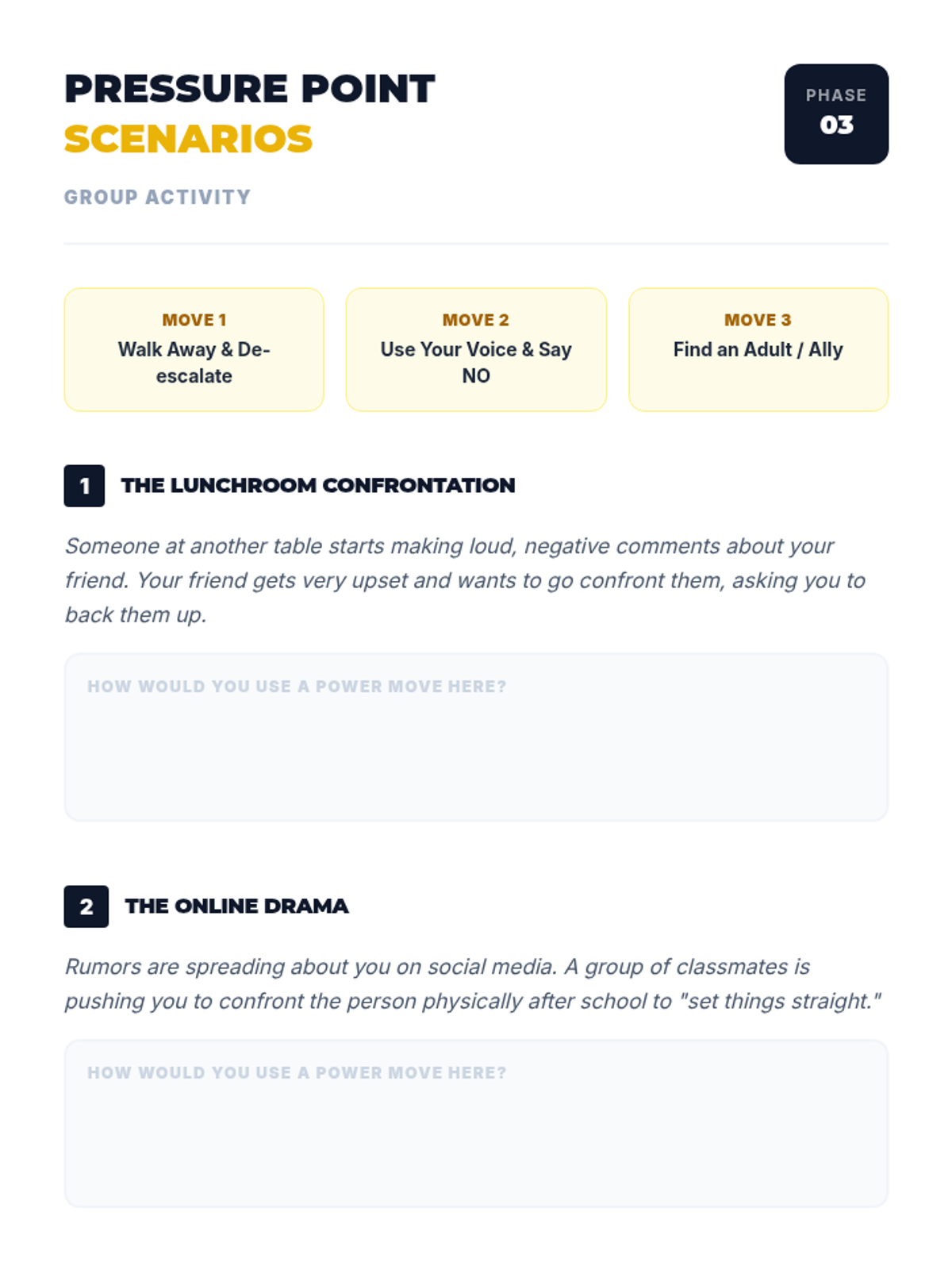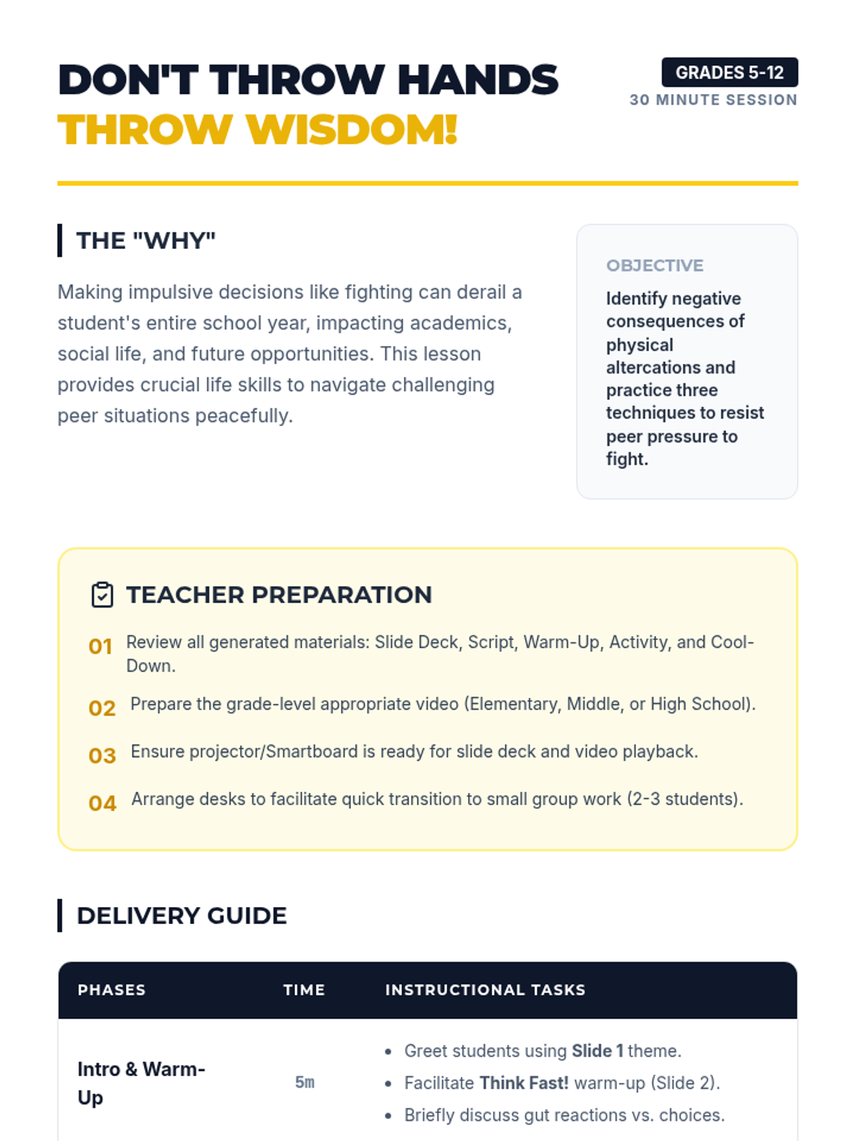 A 30-minute session for grades 5-12 exploring the consequences of school fighting and teaching practical refusal techniques. Students learn to walk away, use their voice, and find allies to protect their academic and social future.