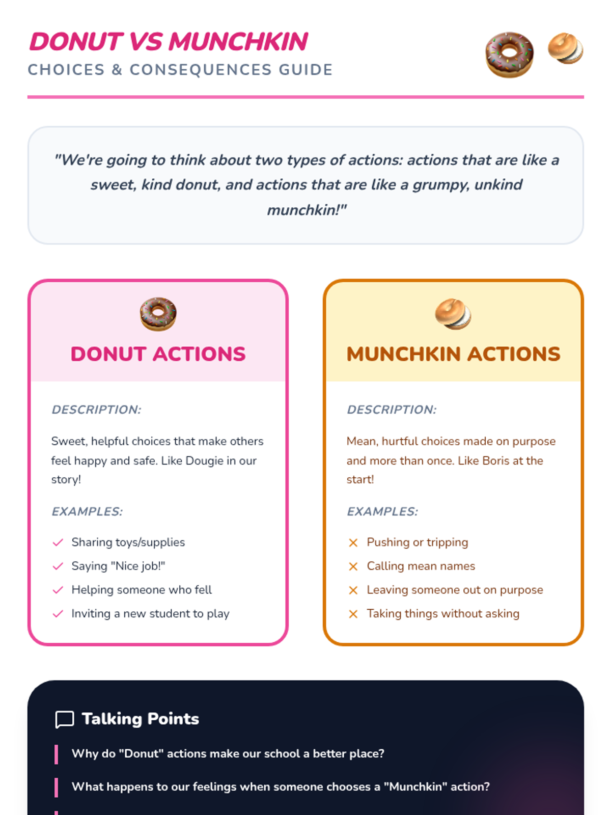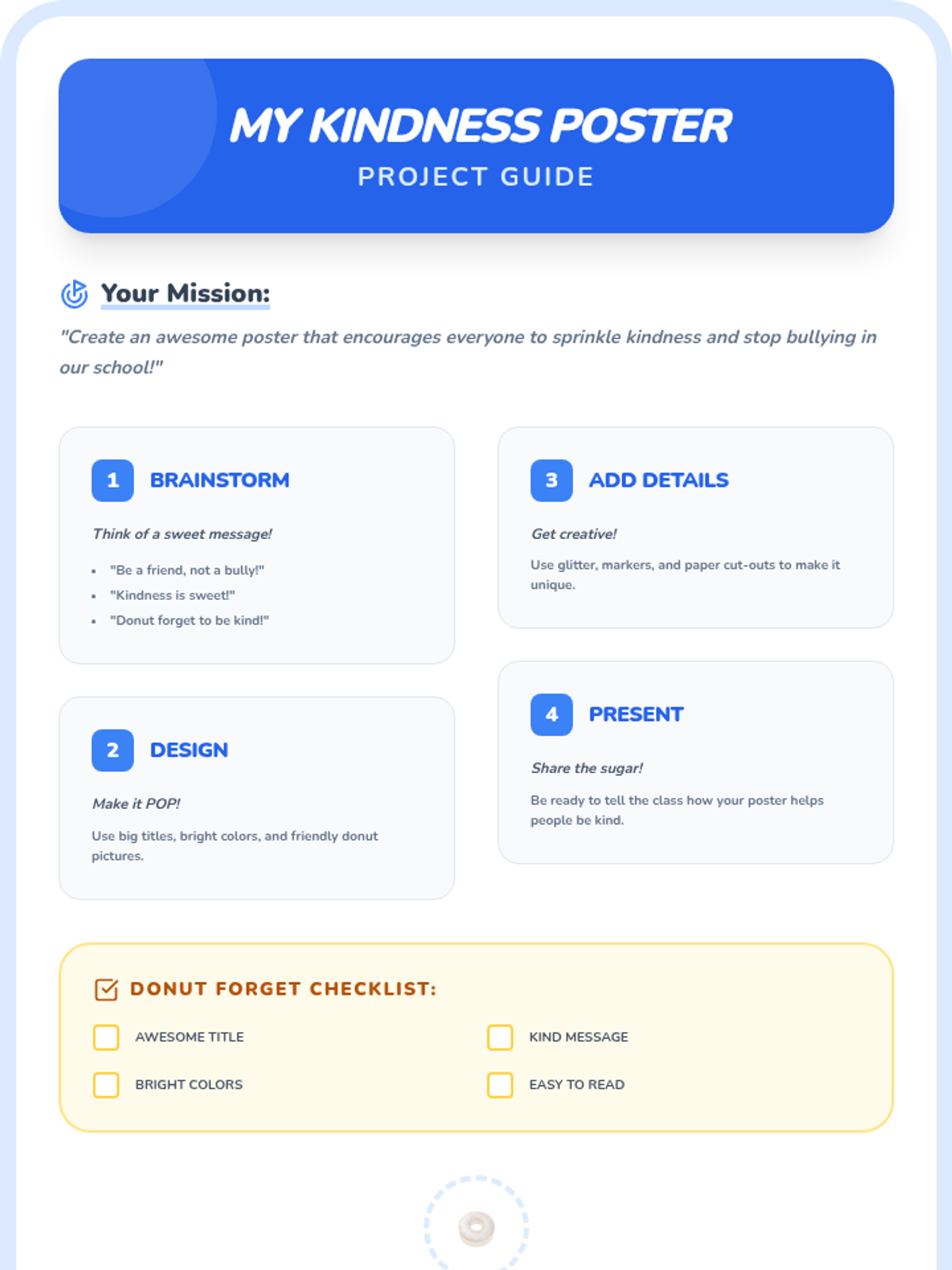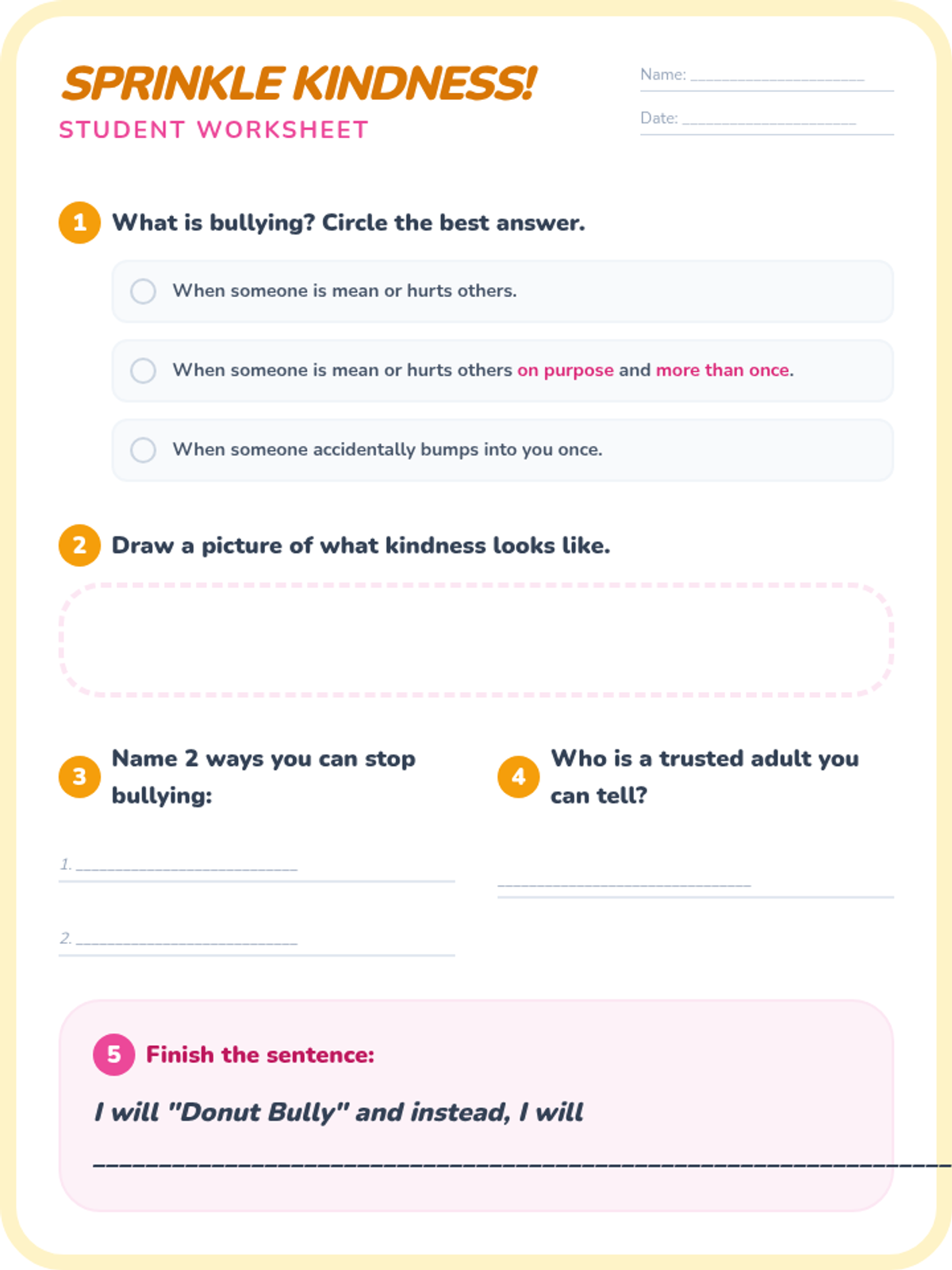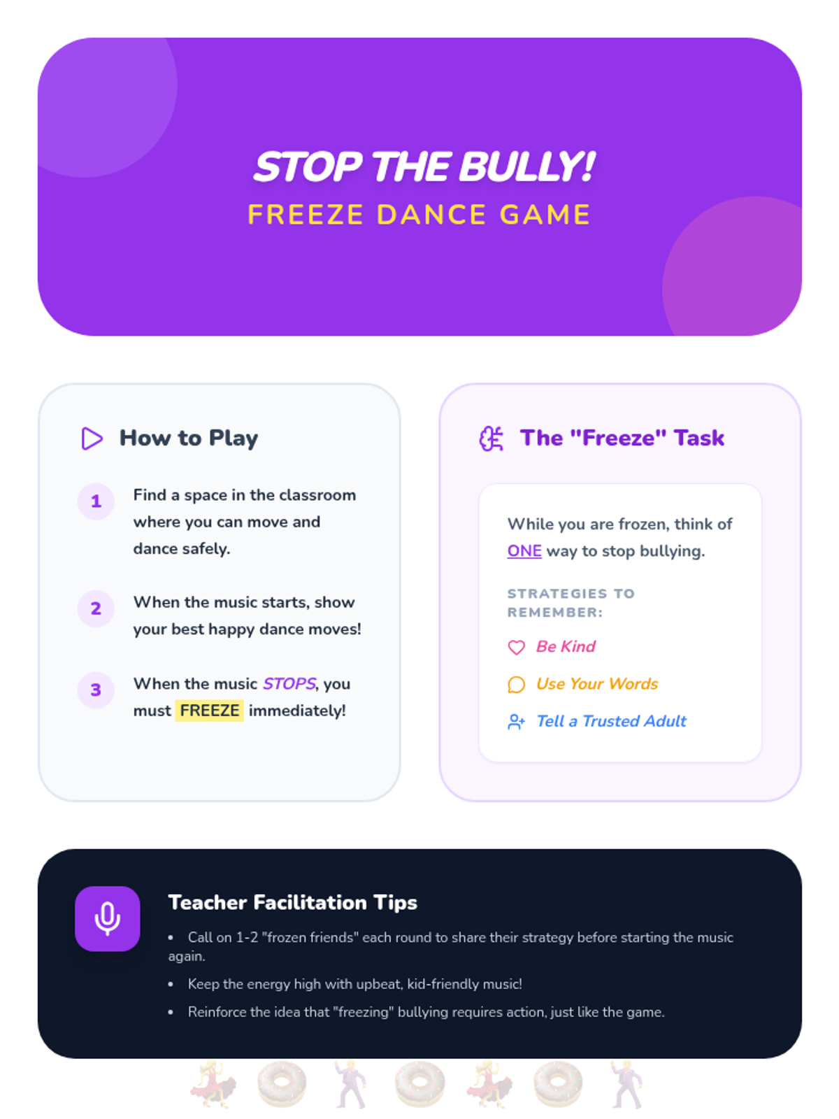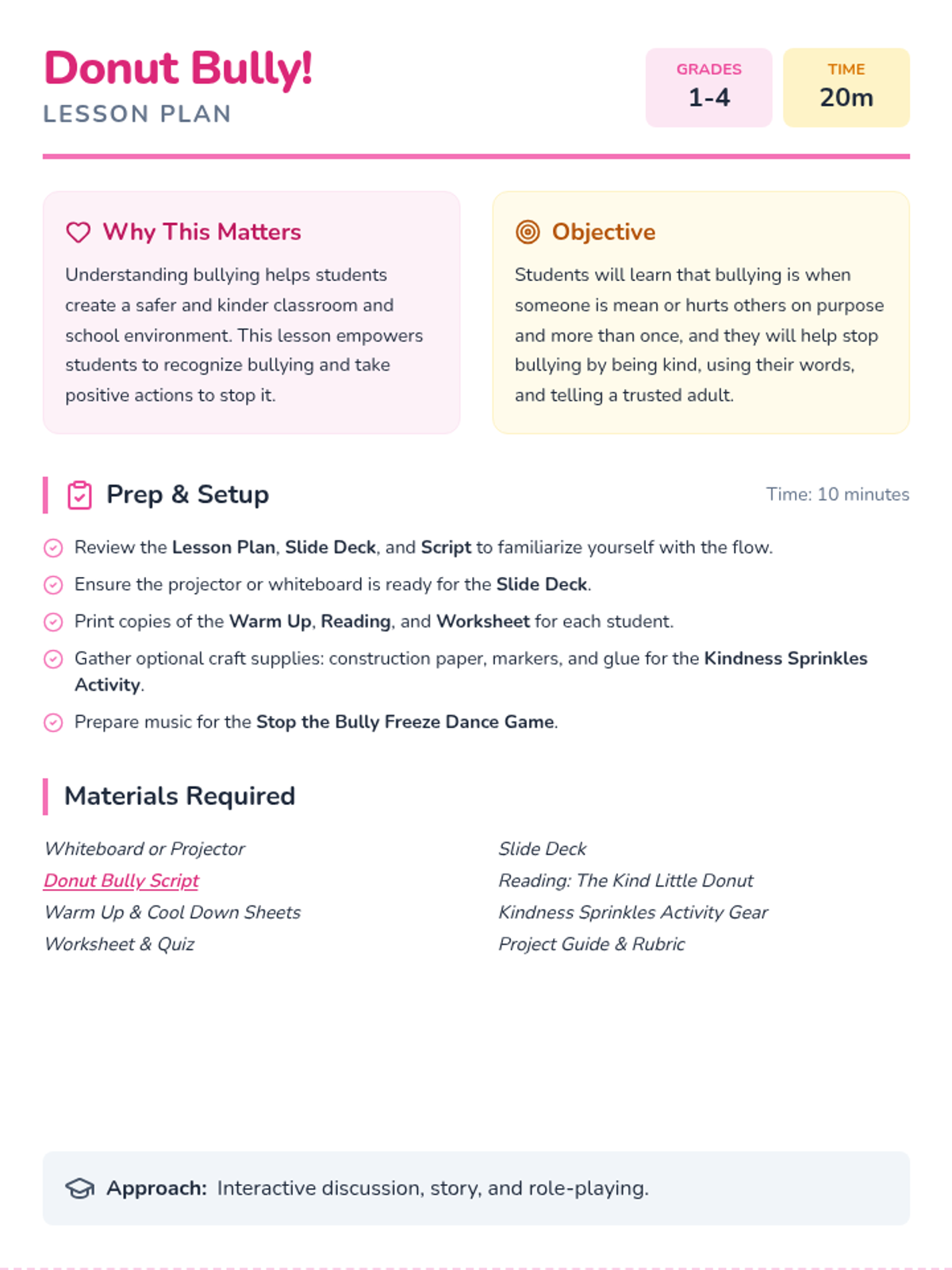 A 20-minute interactive lesson for grades 1-4 focused on identifying bullying and practicing 'sprinkling kindness' as an upstander. Students use donut-themed metaphors to understand positive vs. negative behaviors and learn three key strategies to address bullying.