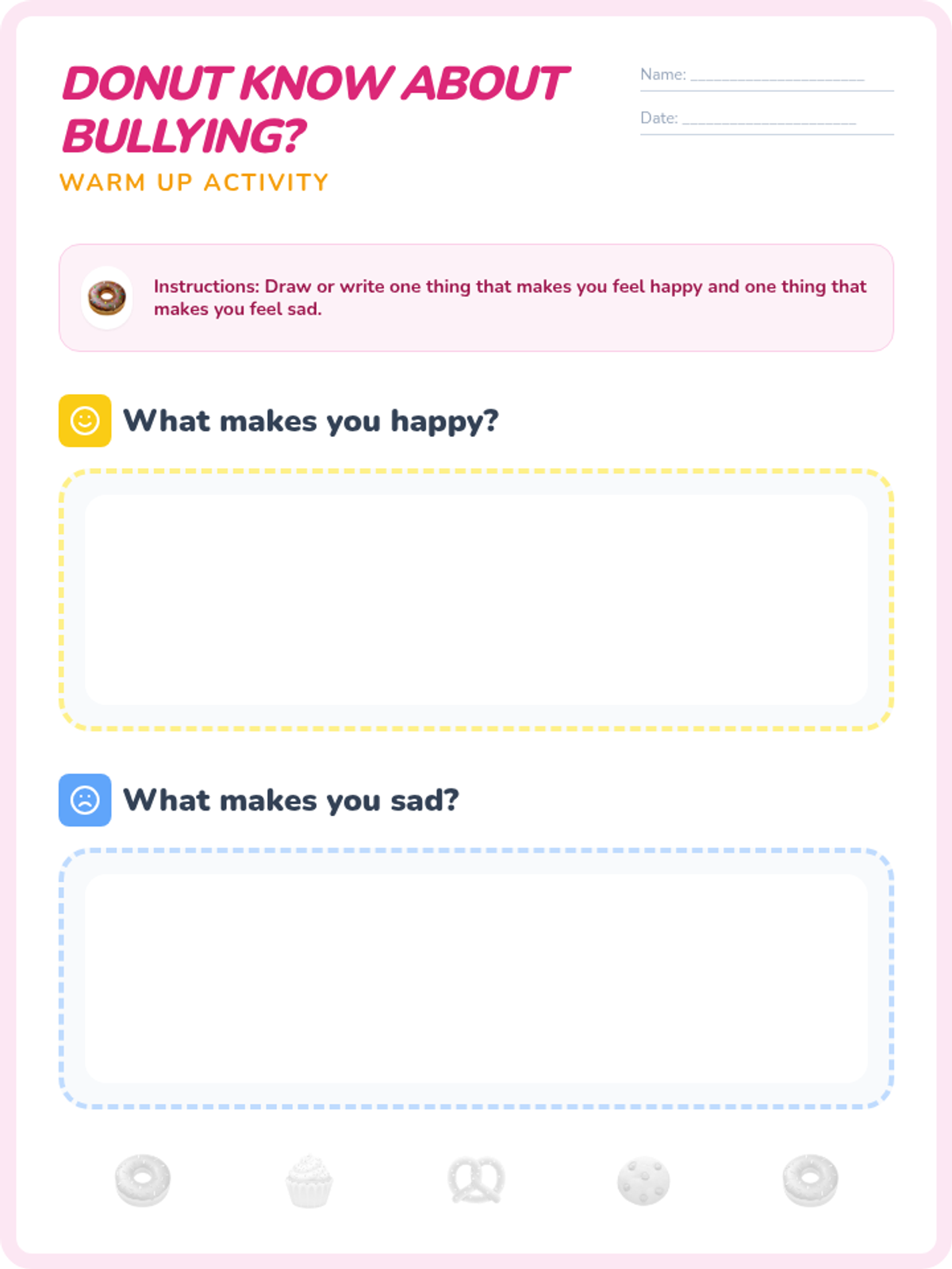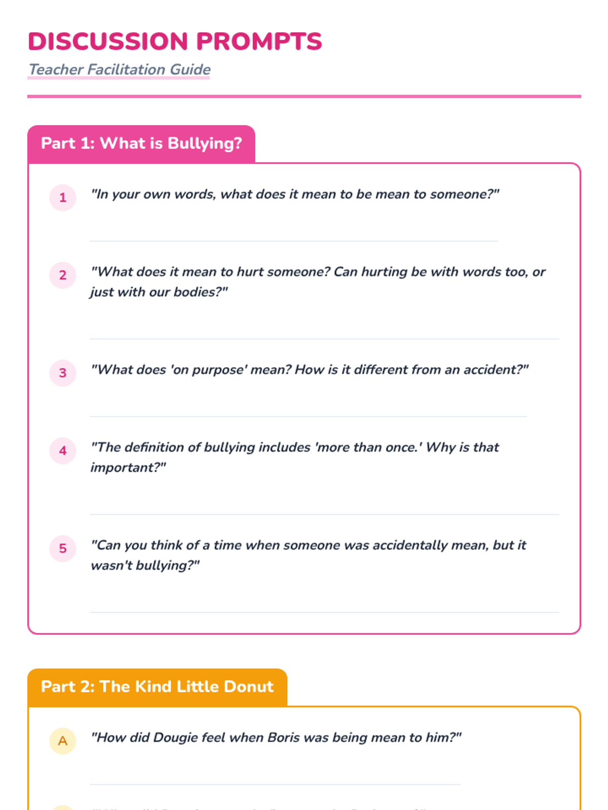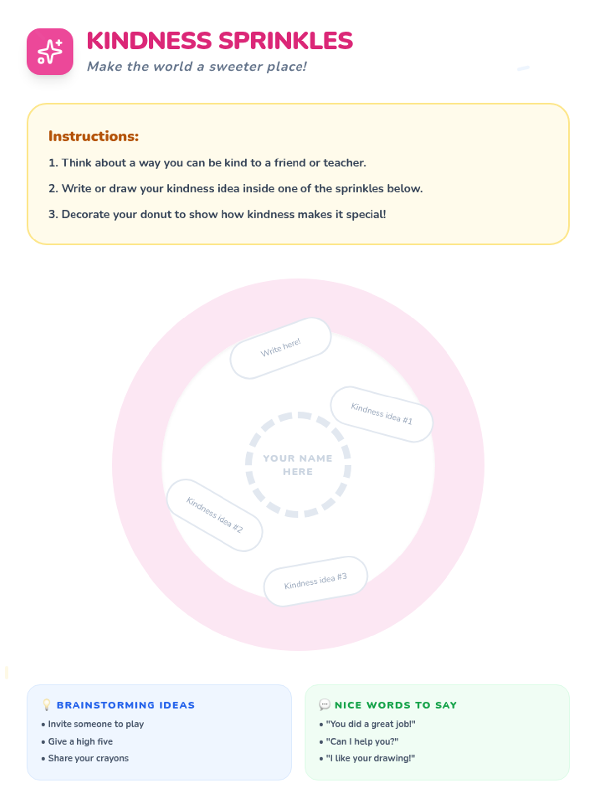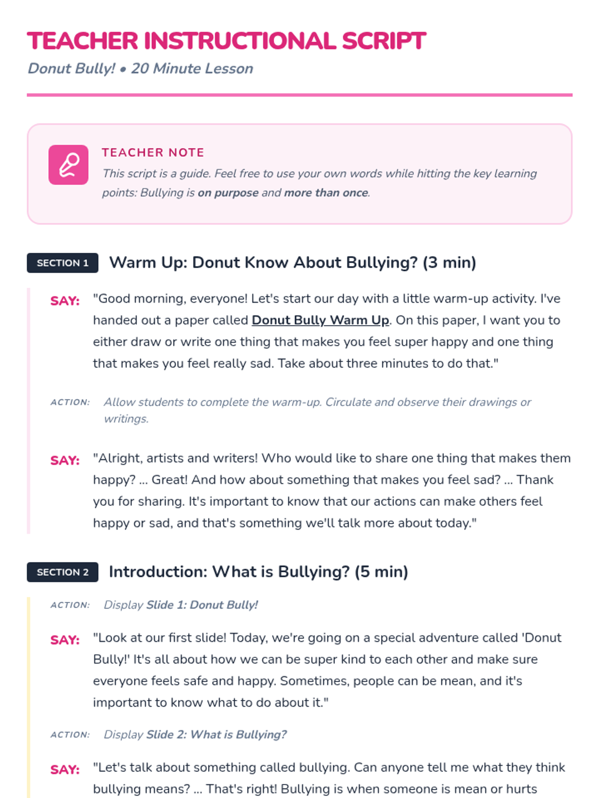 A 20-minute interactive lesson for grades 1-4 focused on identifying bullying and practicing 'sprinkling kindness' as an upstander. Students use donut-themed metaphors to understand positive vs. negative behaviors and learn three key strategies to address bullying.