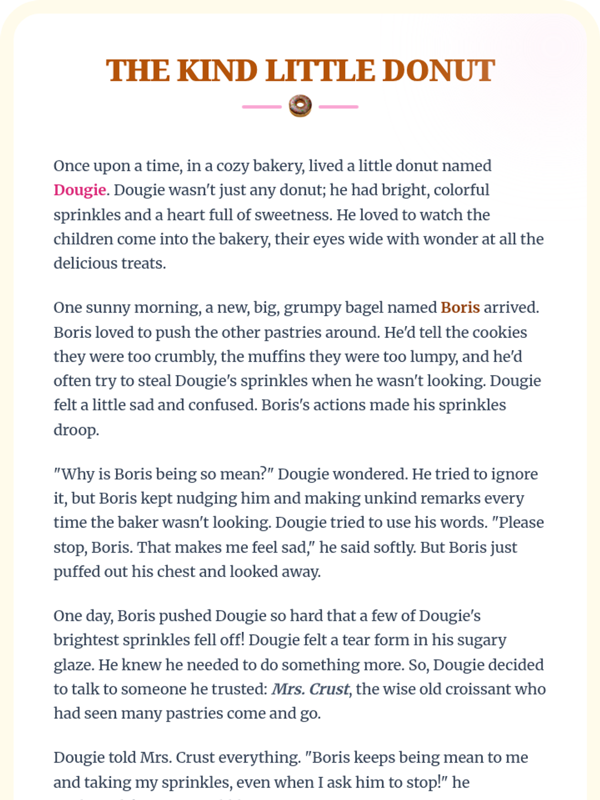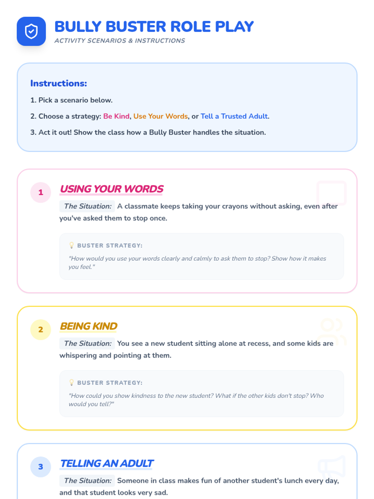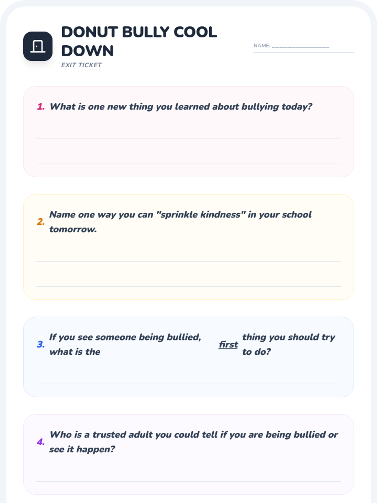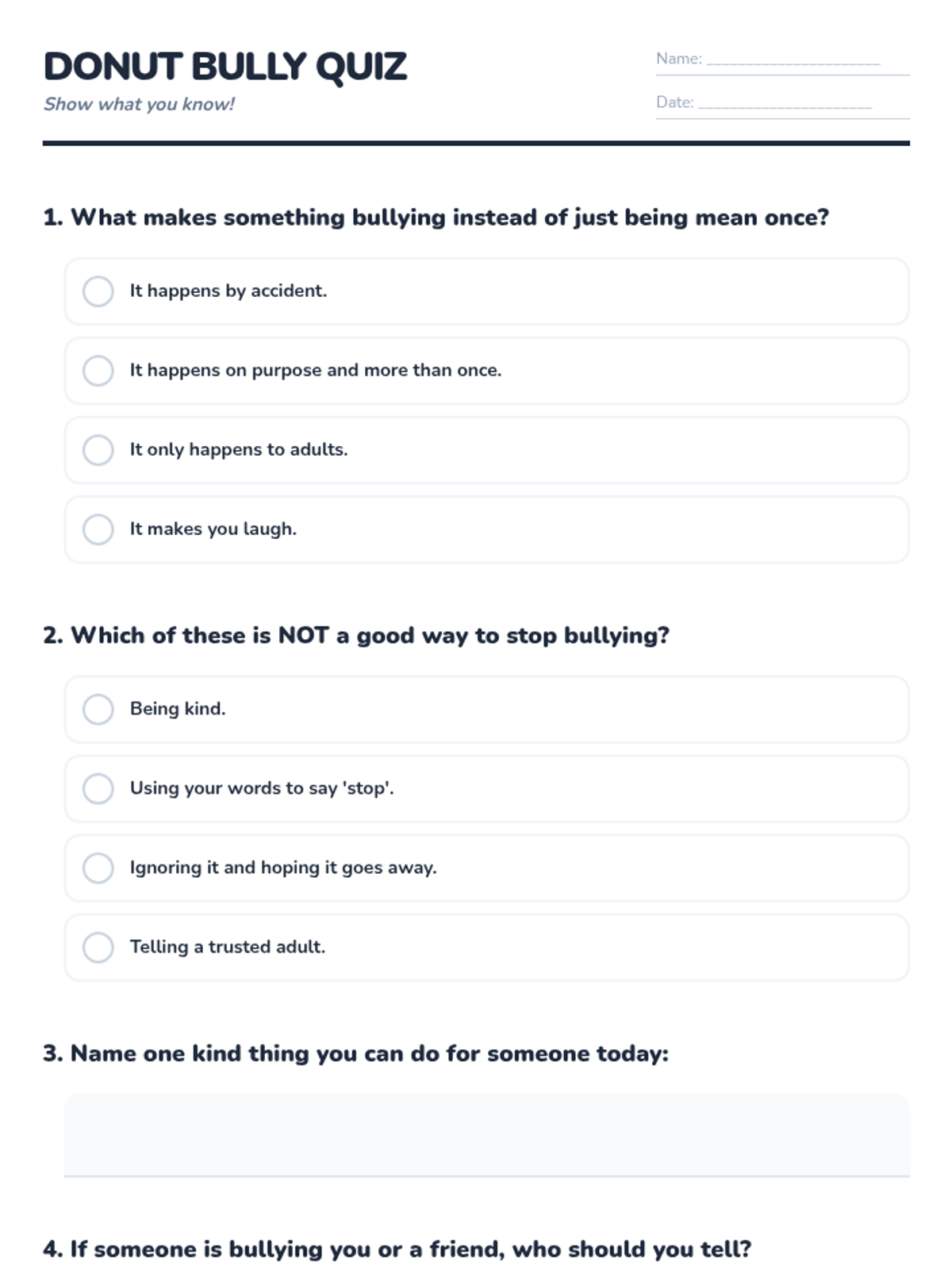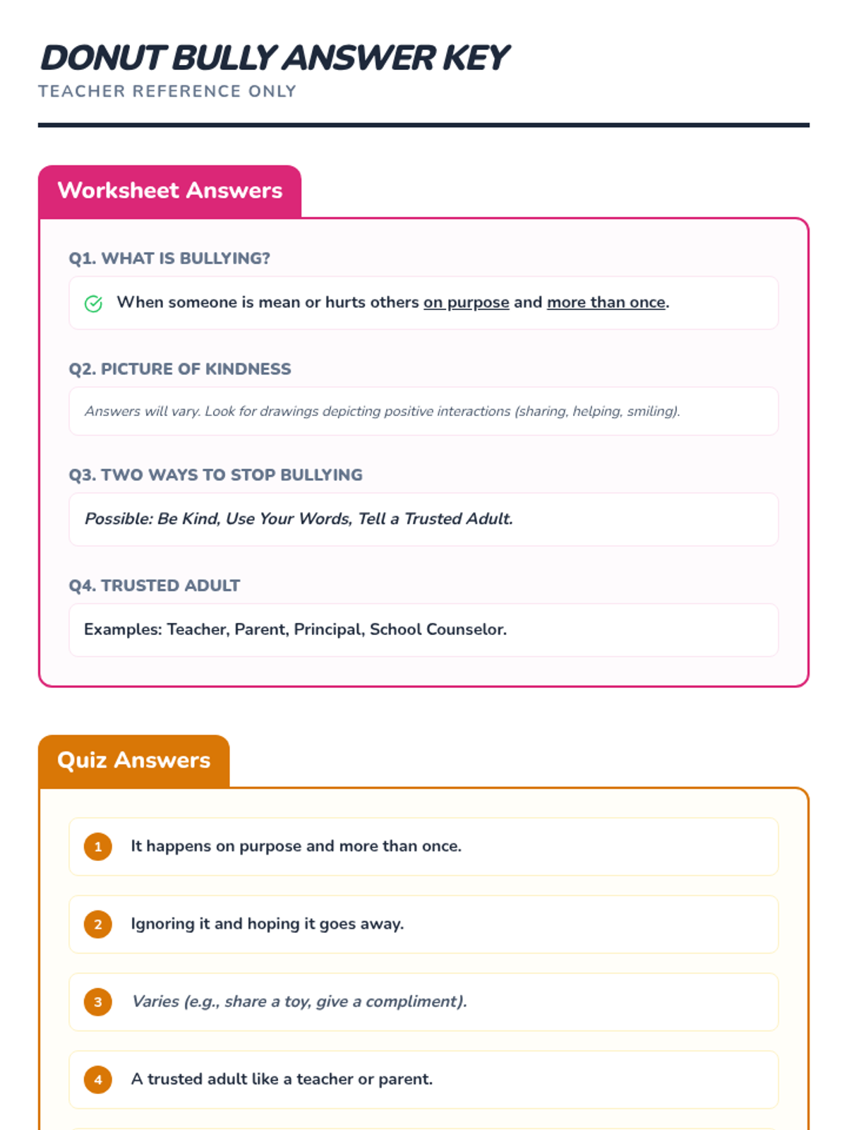 A 20-minute interactive lesson for grades 1-4 focused on identifying bullying and practicing 'sprinkling kindness' as an upstander. Students use donut-themed metaphors to understand positive vs. negative behaviors and learn three key strategies to address bullying.
