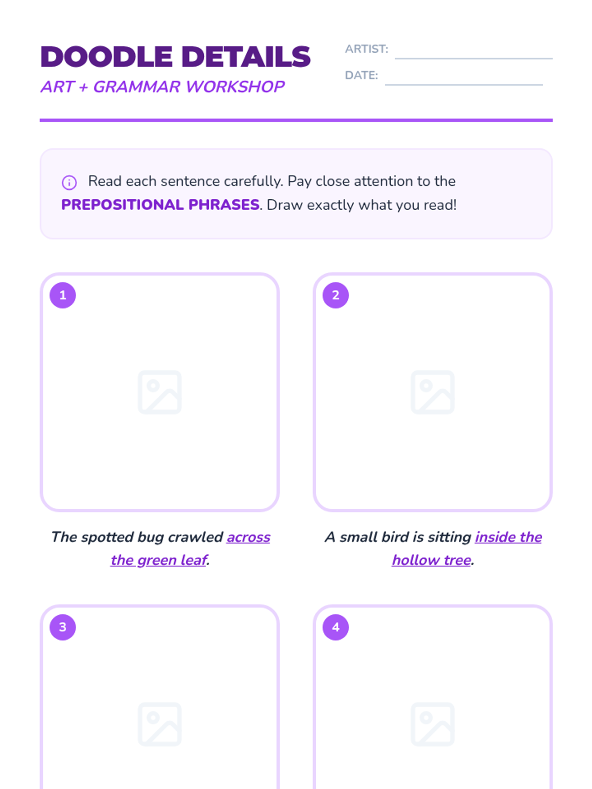 Students read descriptive sentences containing multiple prepositional phrases and illustrate them, reinforcing how specific prepositions change the meaning and visual imagery of text.