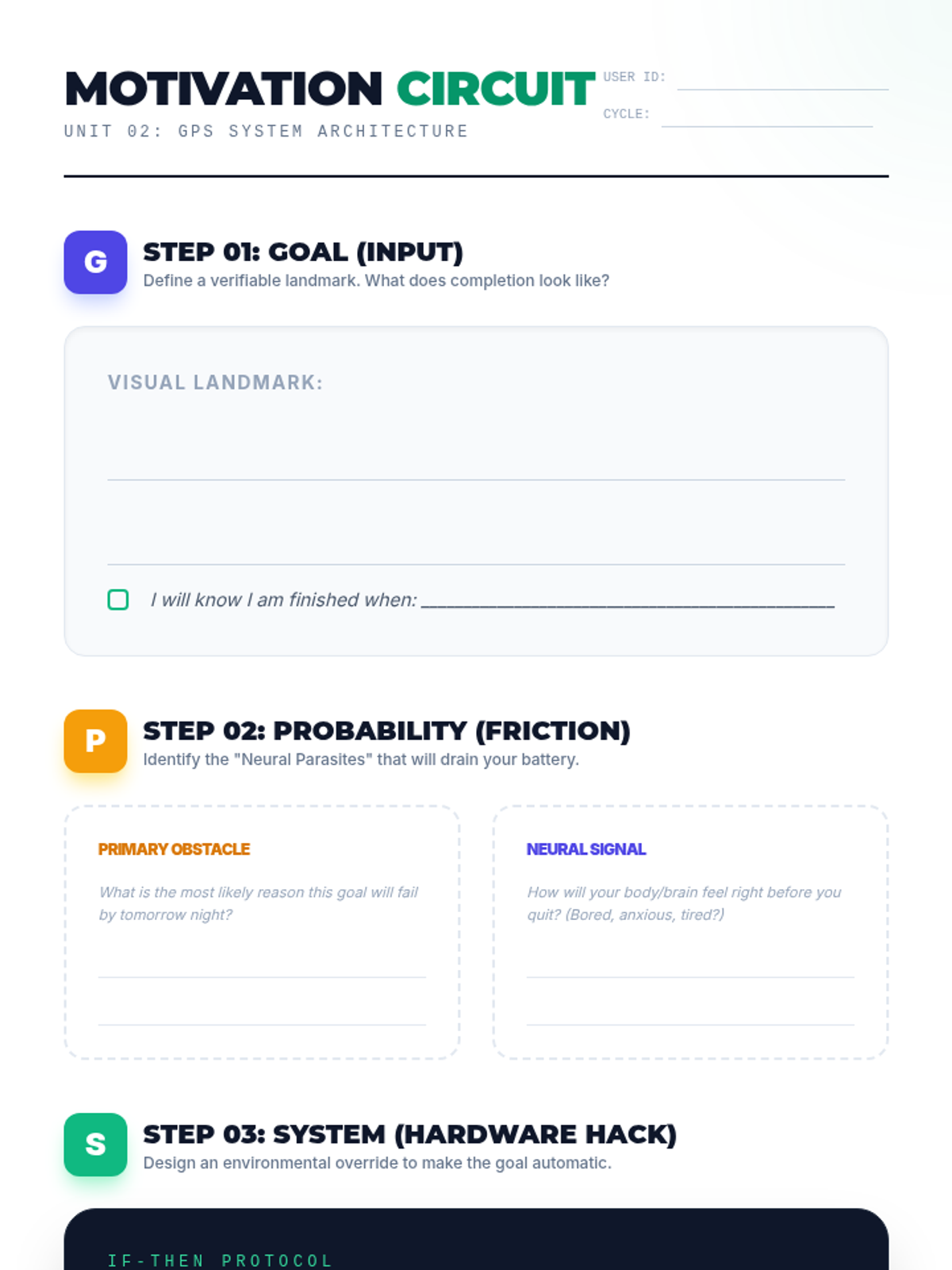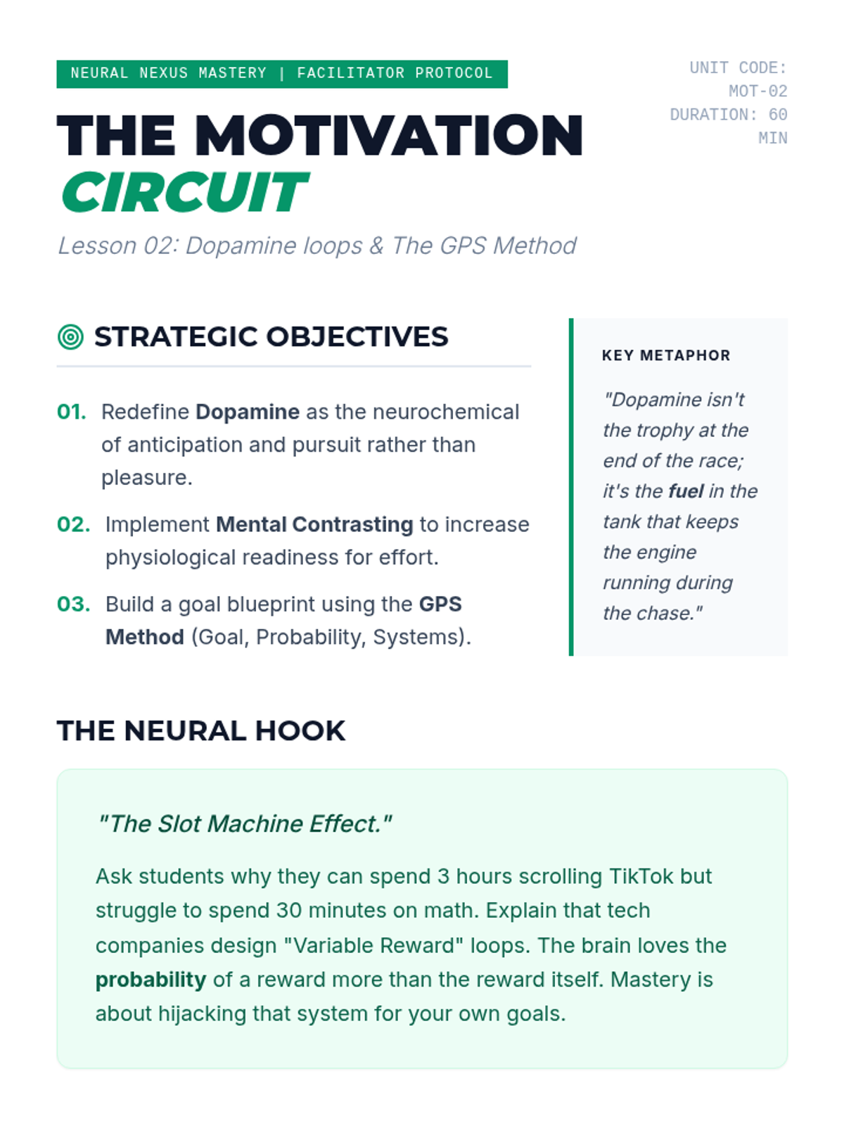 Explores the neurochemistry of motivation and the 'GPS' method for goal setting. Students learn about dopamine loops and how to design high-probability success paths using SMART+ criteria.