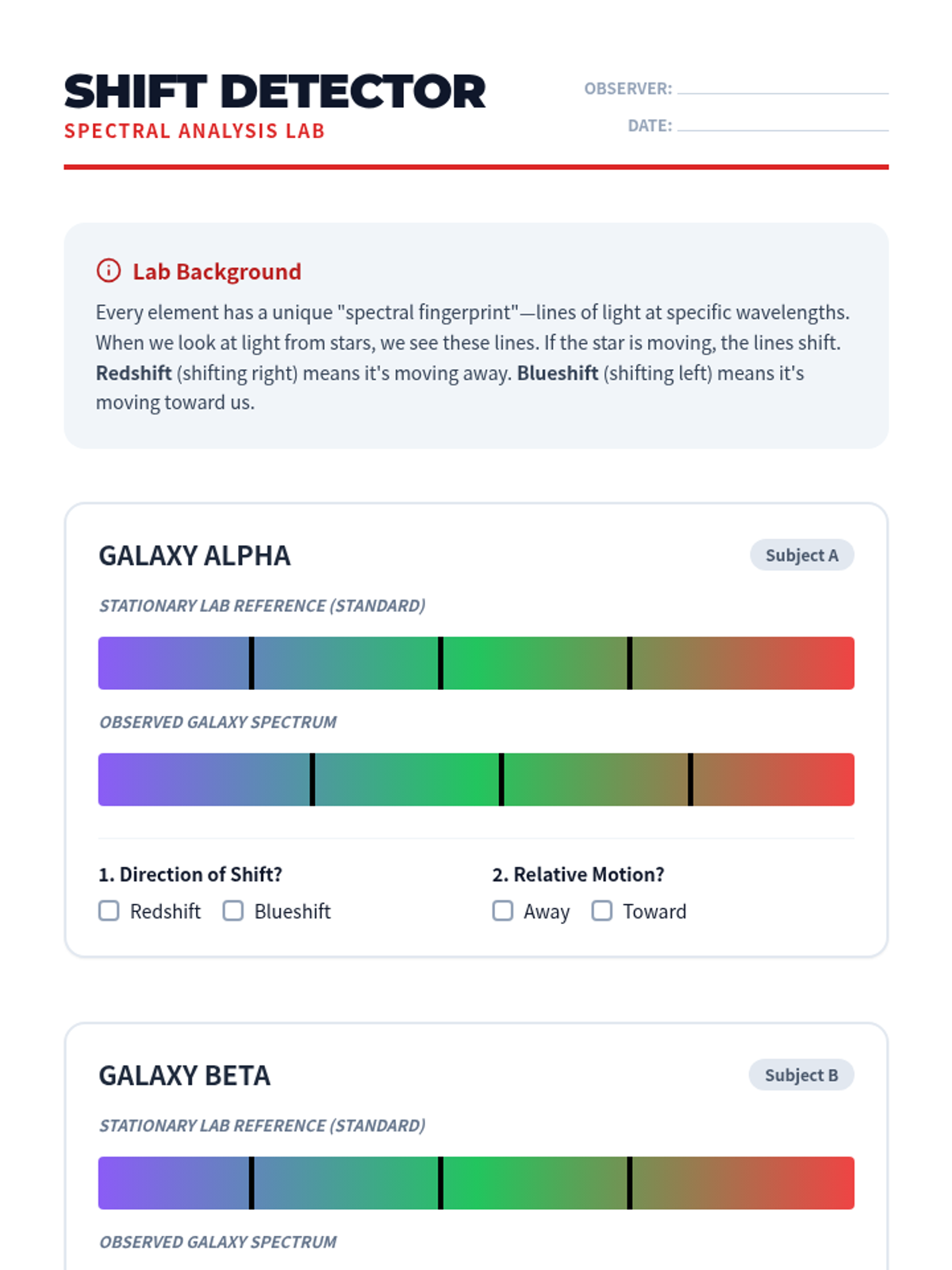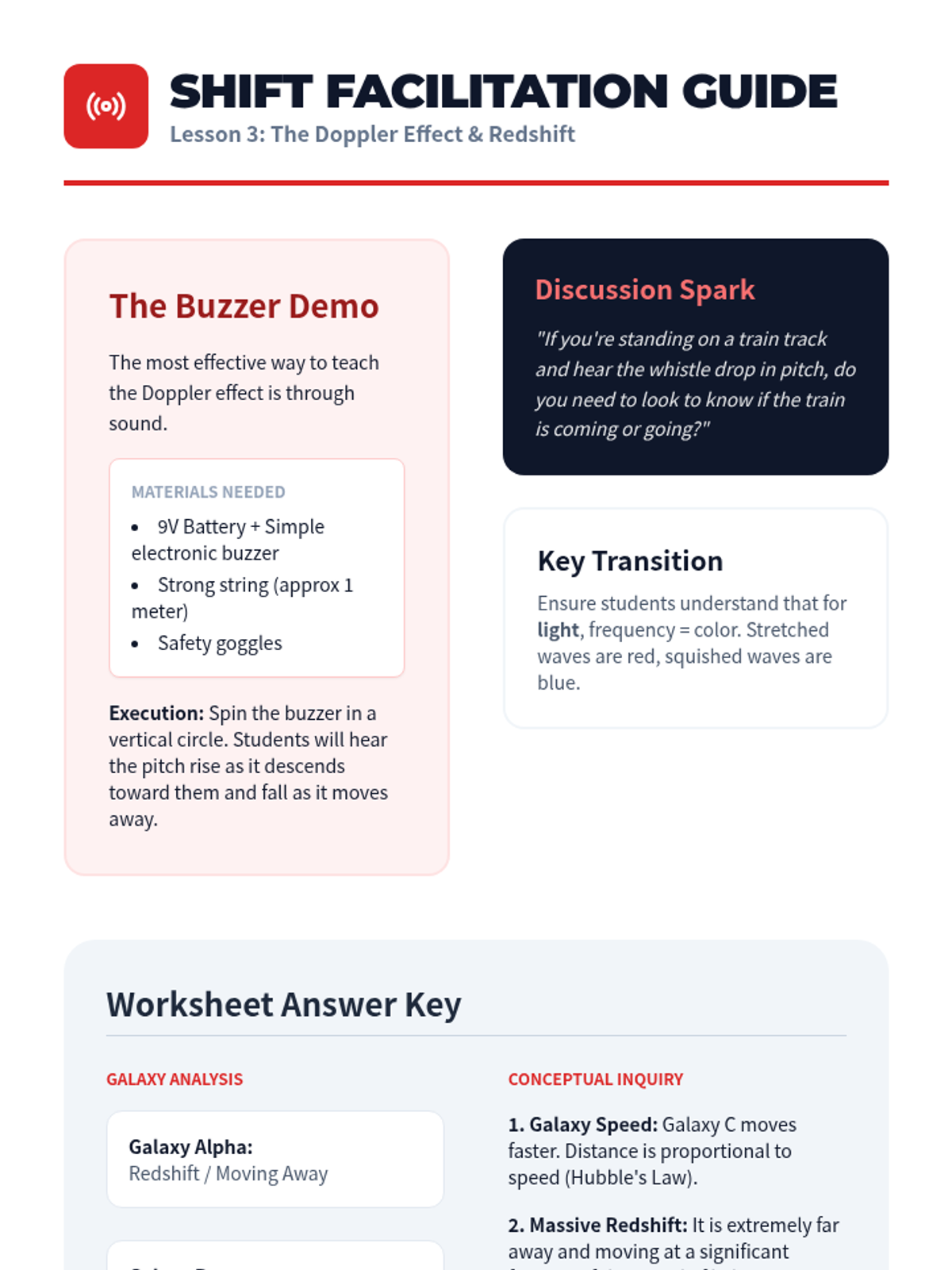 Students explore the Doppler Effect in sound and light, interpreting spectral data (redshift) as evidence of galactic motion.