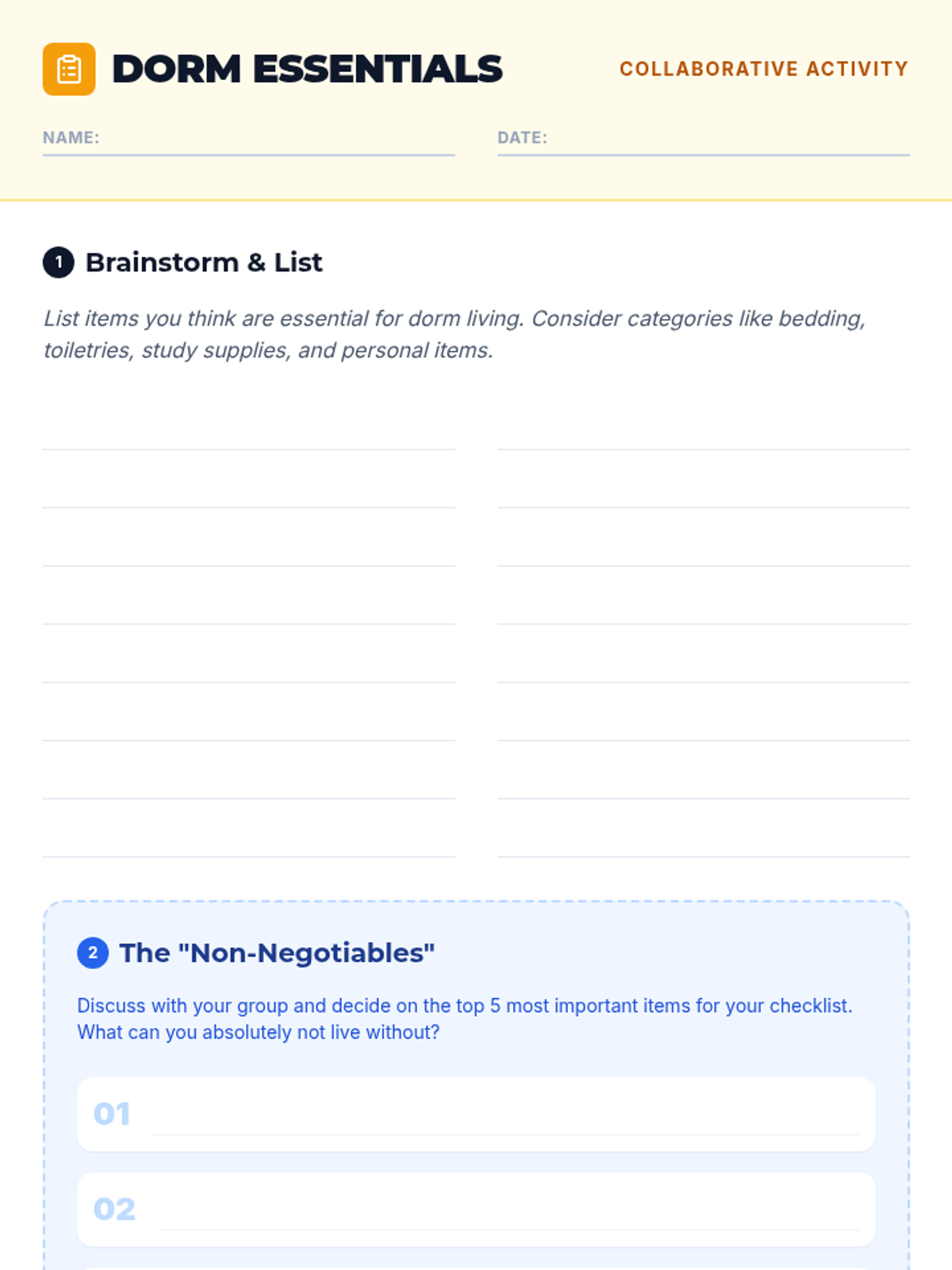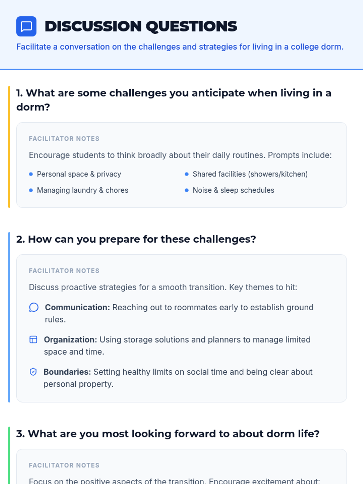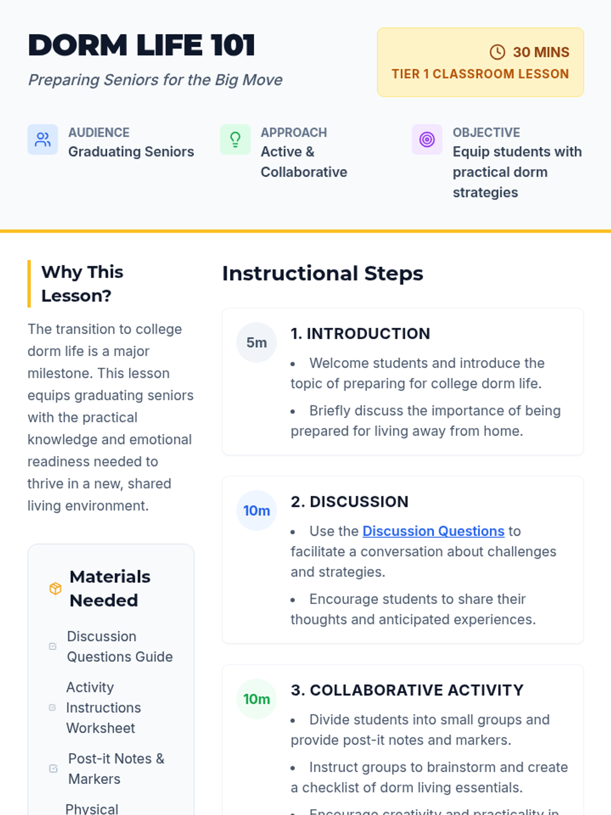 A comprehensive lesson for graduating seniors to navigate the transition to college dorm living, covering practical essentials and social strategies.