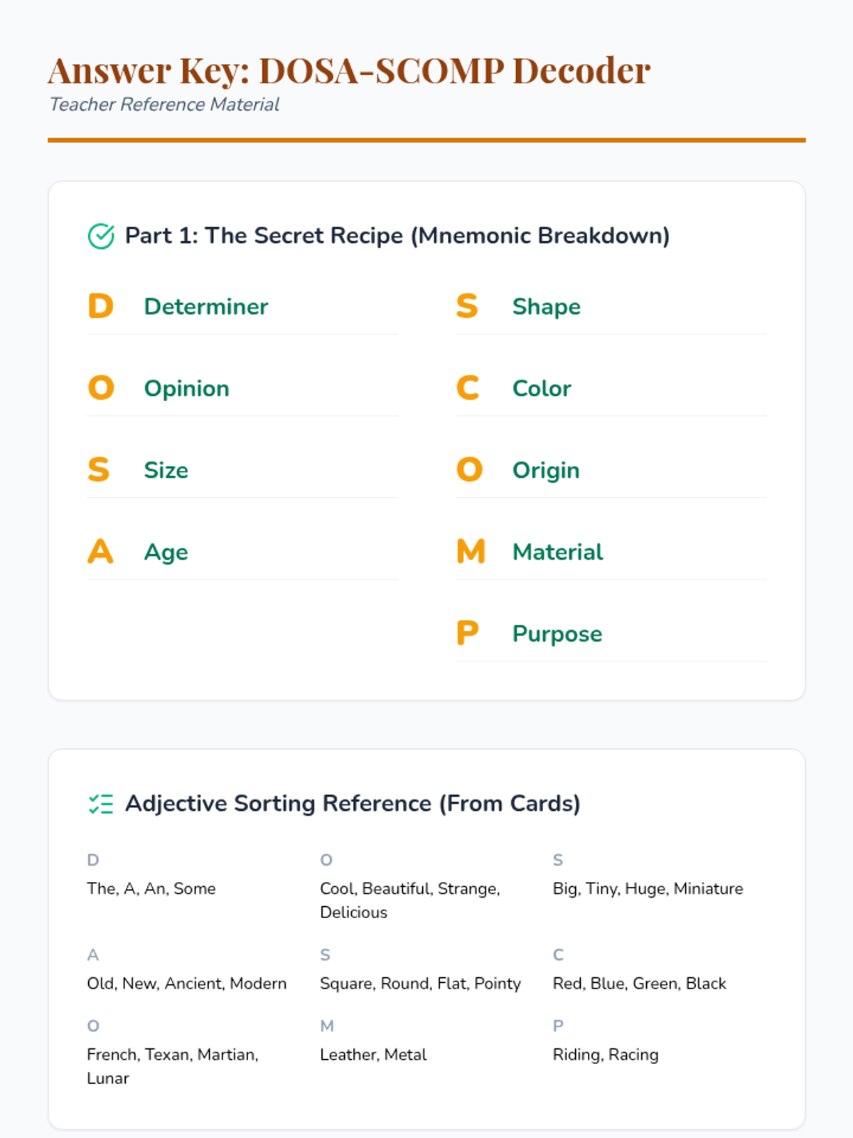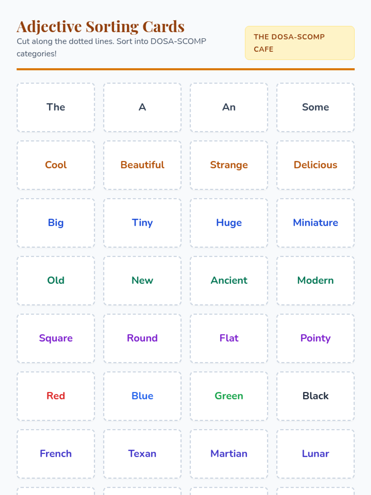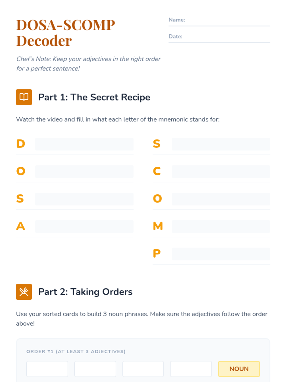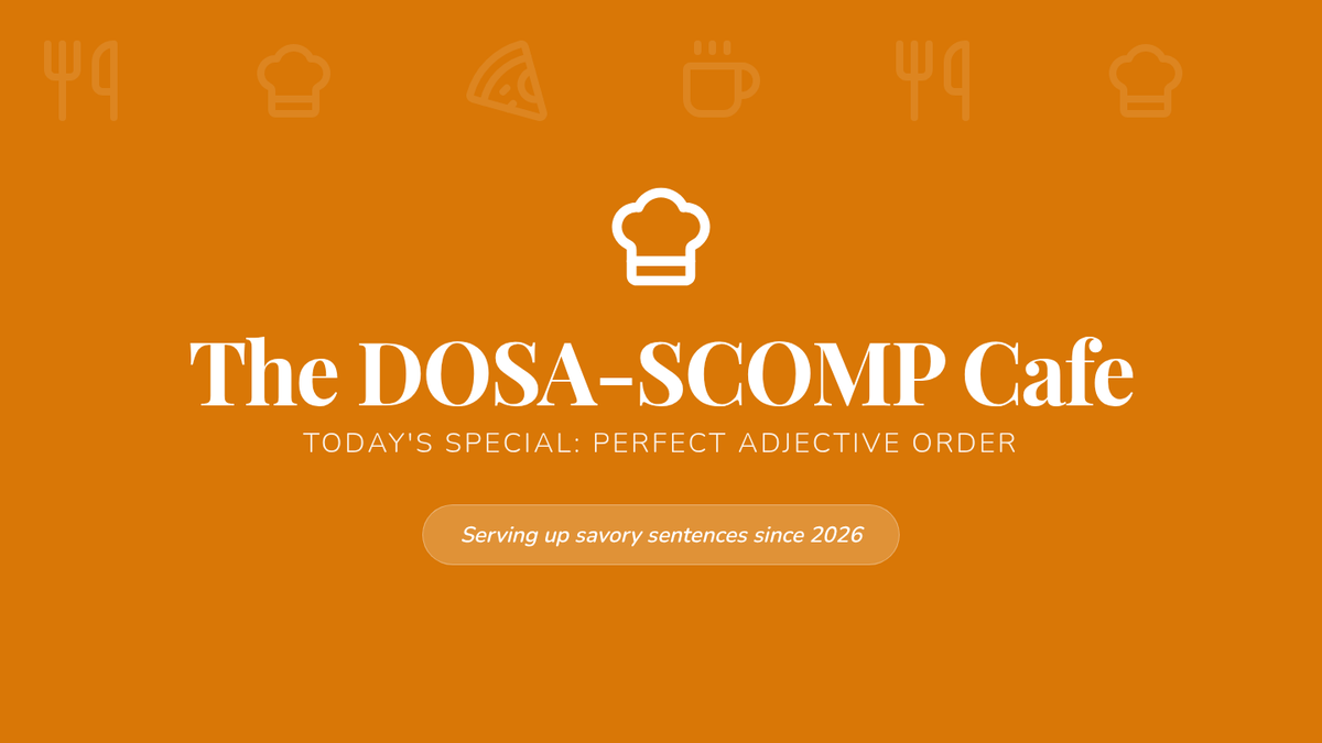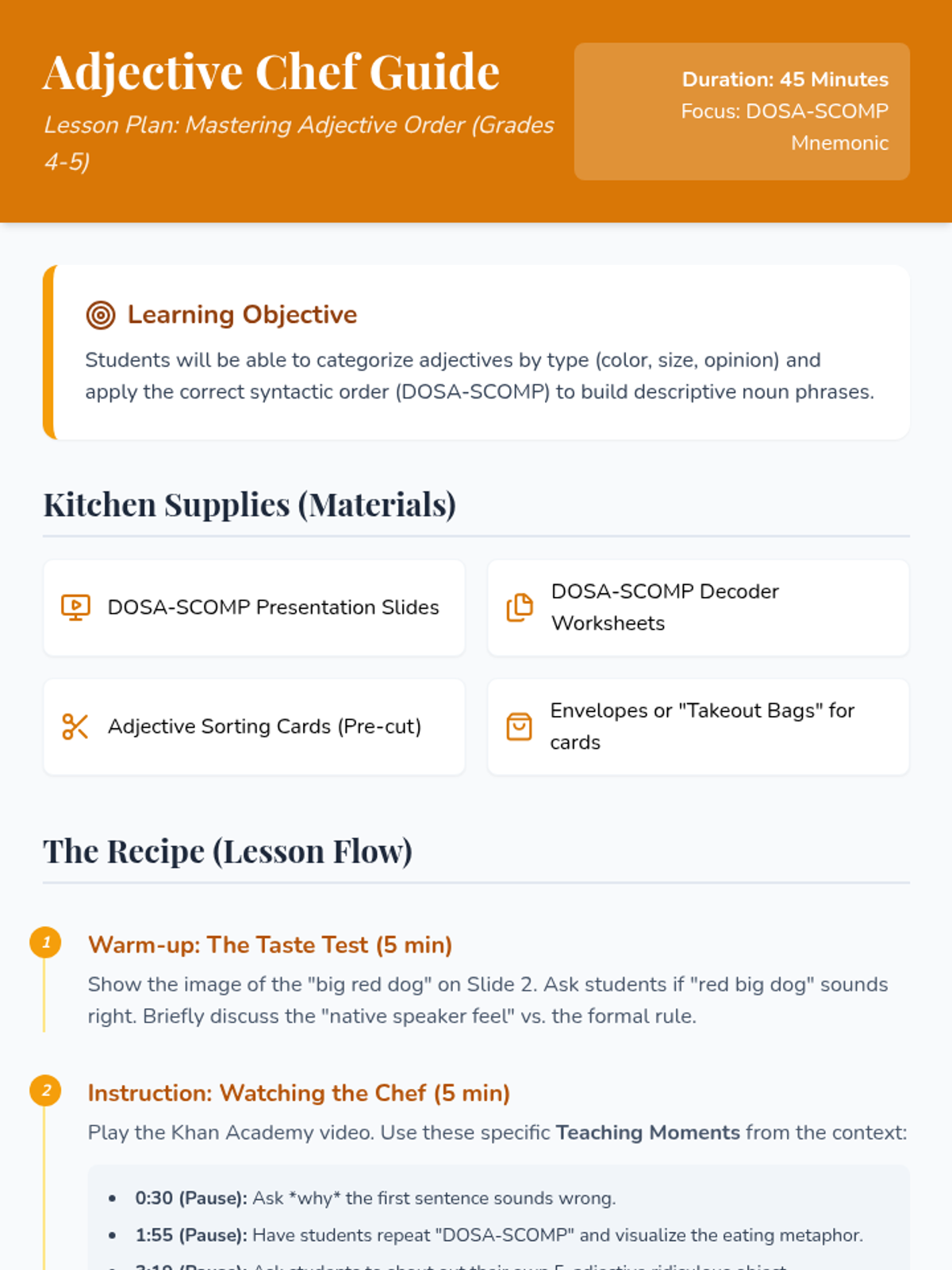 Students will master the order of adjectives using the DOSA-SCOMP mnemonic through a video-based lesson, a hands-on sorting activity, and creative sentence building.