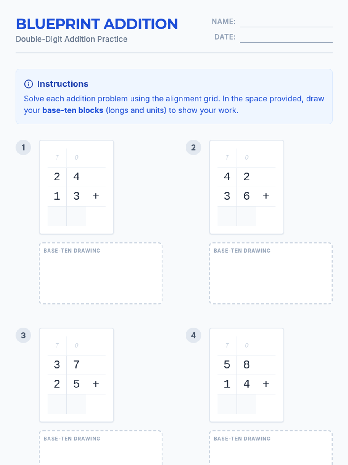 A straightforward introduction to double-digit addition using grid alignment and base-ten block representations to support place value understanding. Students practice both non-regrouping and regrouping problems.