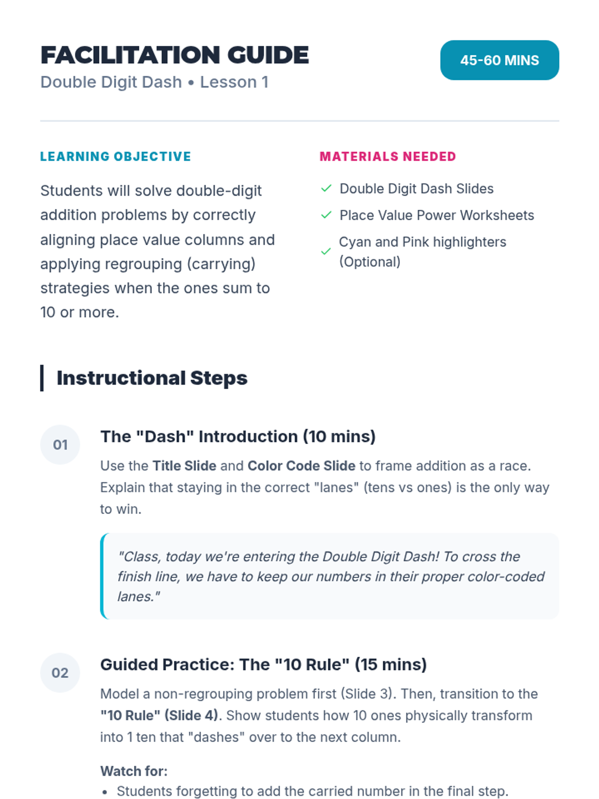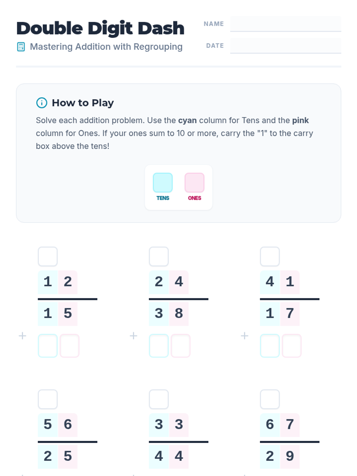 A lesson focused on mastering double-digit addition with a mix of regrouping and non-regrouping problems, featuring color-coded place value supports.