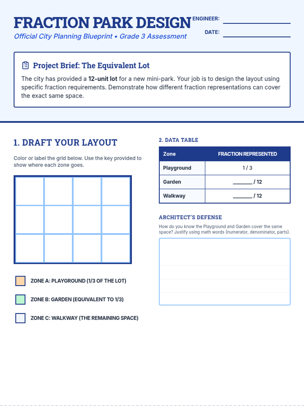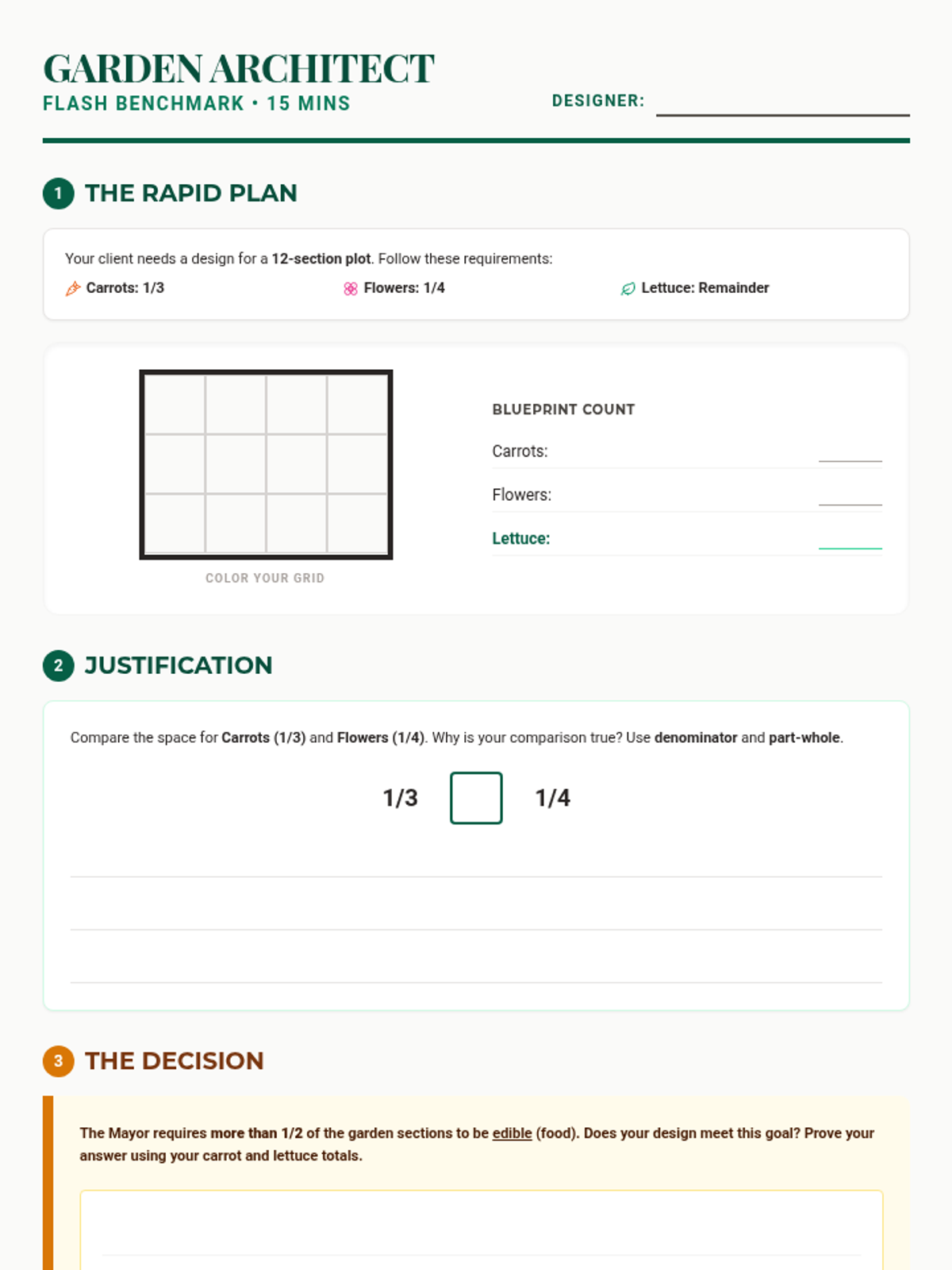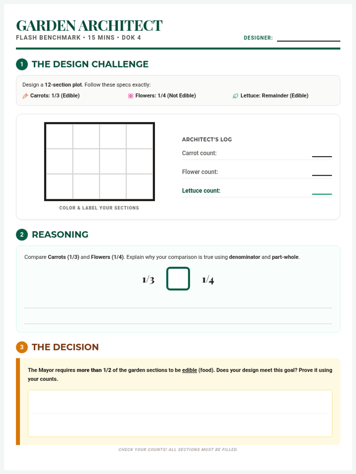 A DOK 4 performance task where students act as urban garden designers, applying fraction comparison strategies to solve real-world space allocation problems. Students will use area models and number lines to justify their planning decisions for two different community parks.