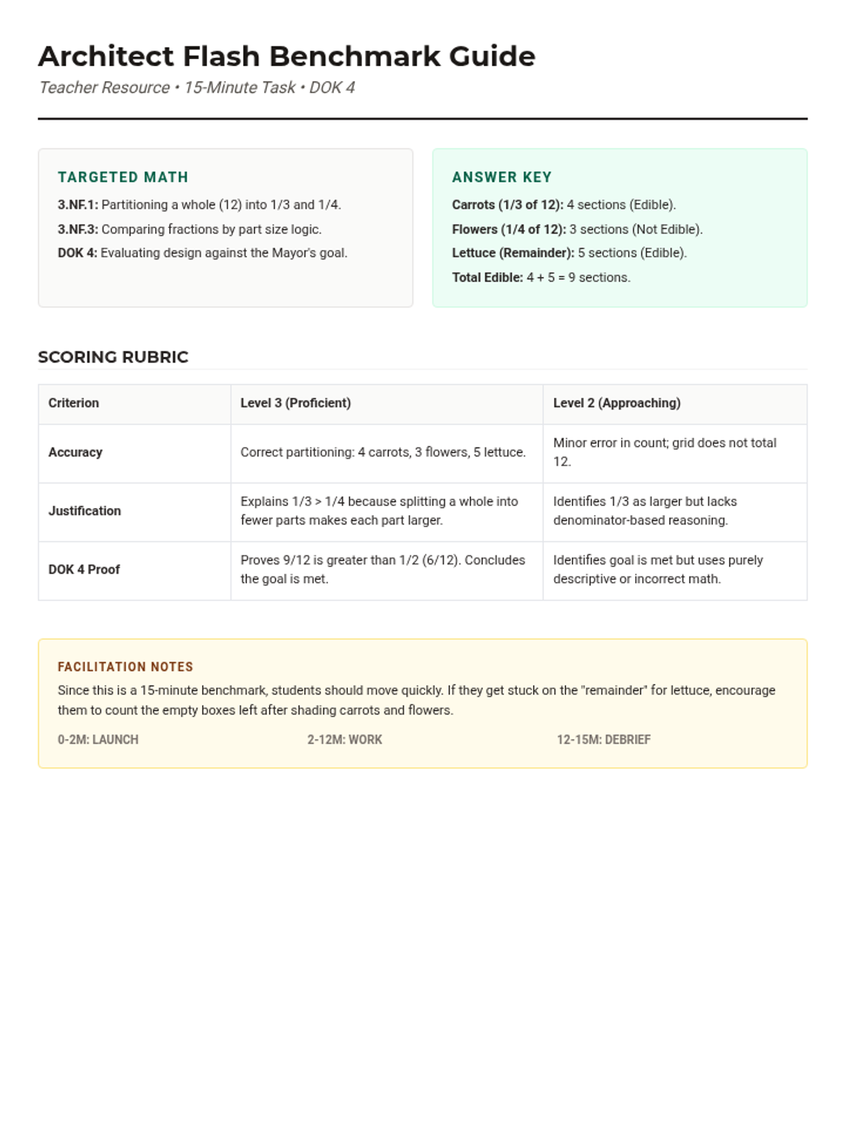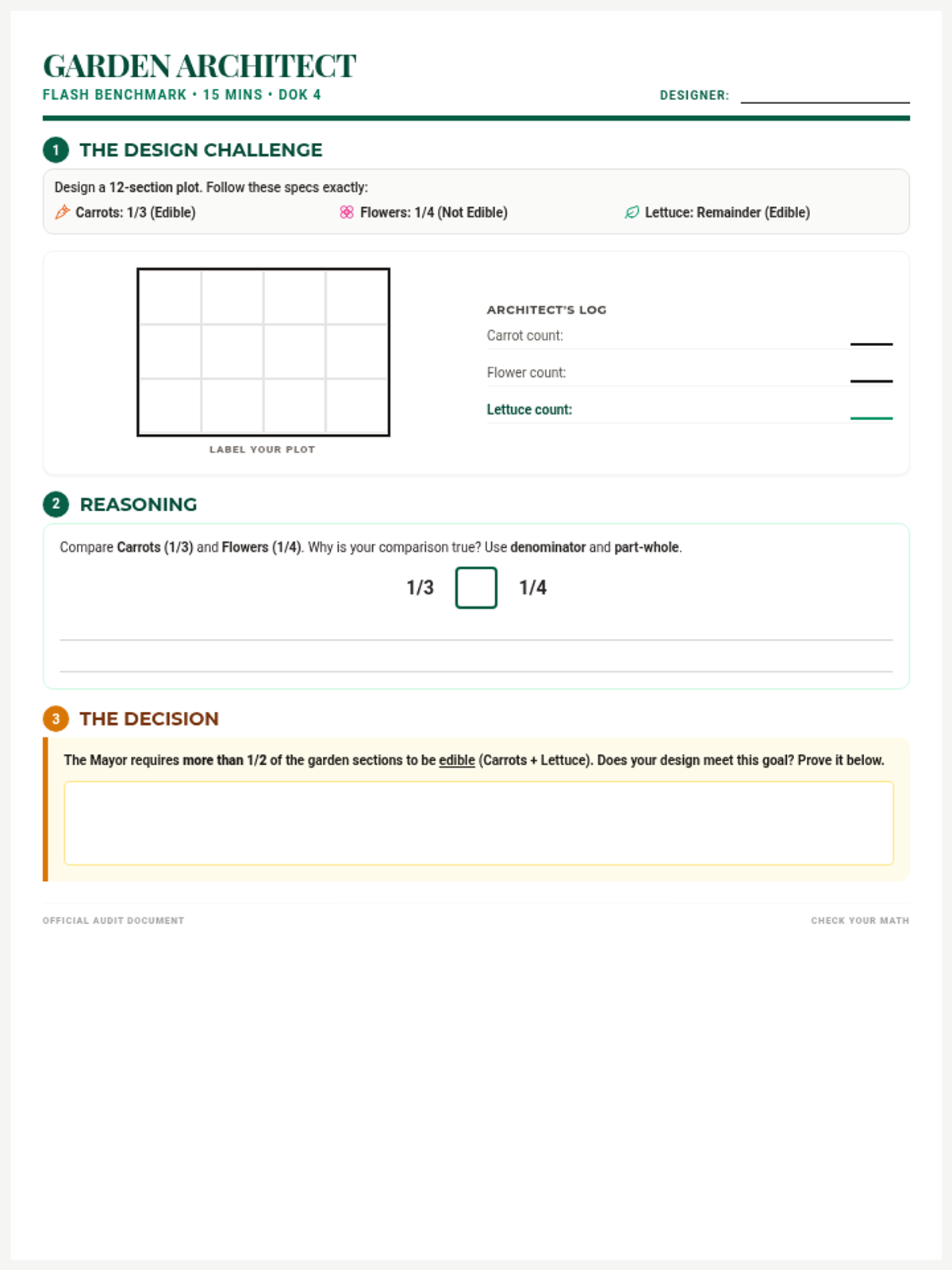 A 45-minute DOK 4 performance task where students act as garden architects. They must apply their knowledge of fraction parts, number lines, and equivalent fractions to design a community garden under specific constraints and justify their mathematical decisions.