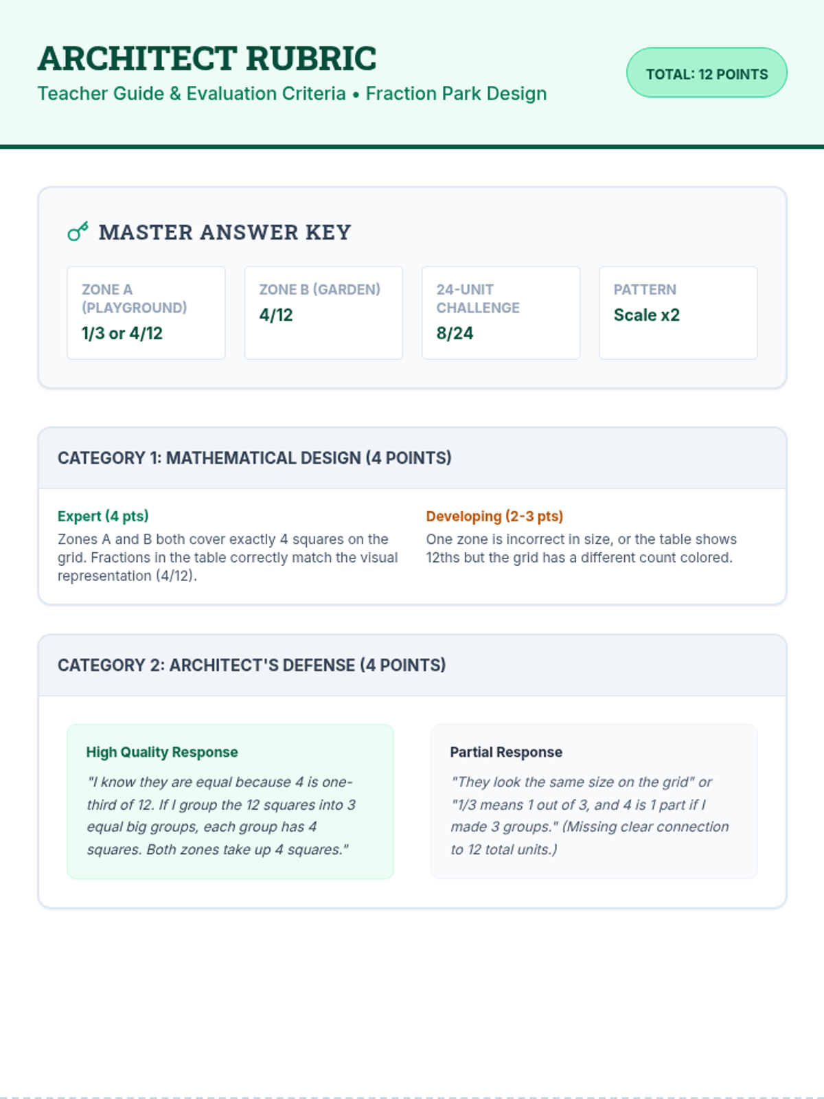 A short, high-level assessment focused on equivalent fractions through architectural design and reasoning. Students demonstrate Depth of Knowledge 4 by creating and justifying multiple representations of the same fractional value.