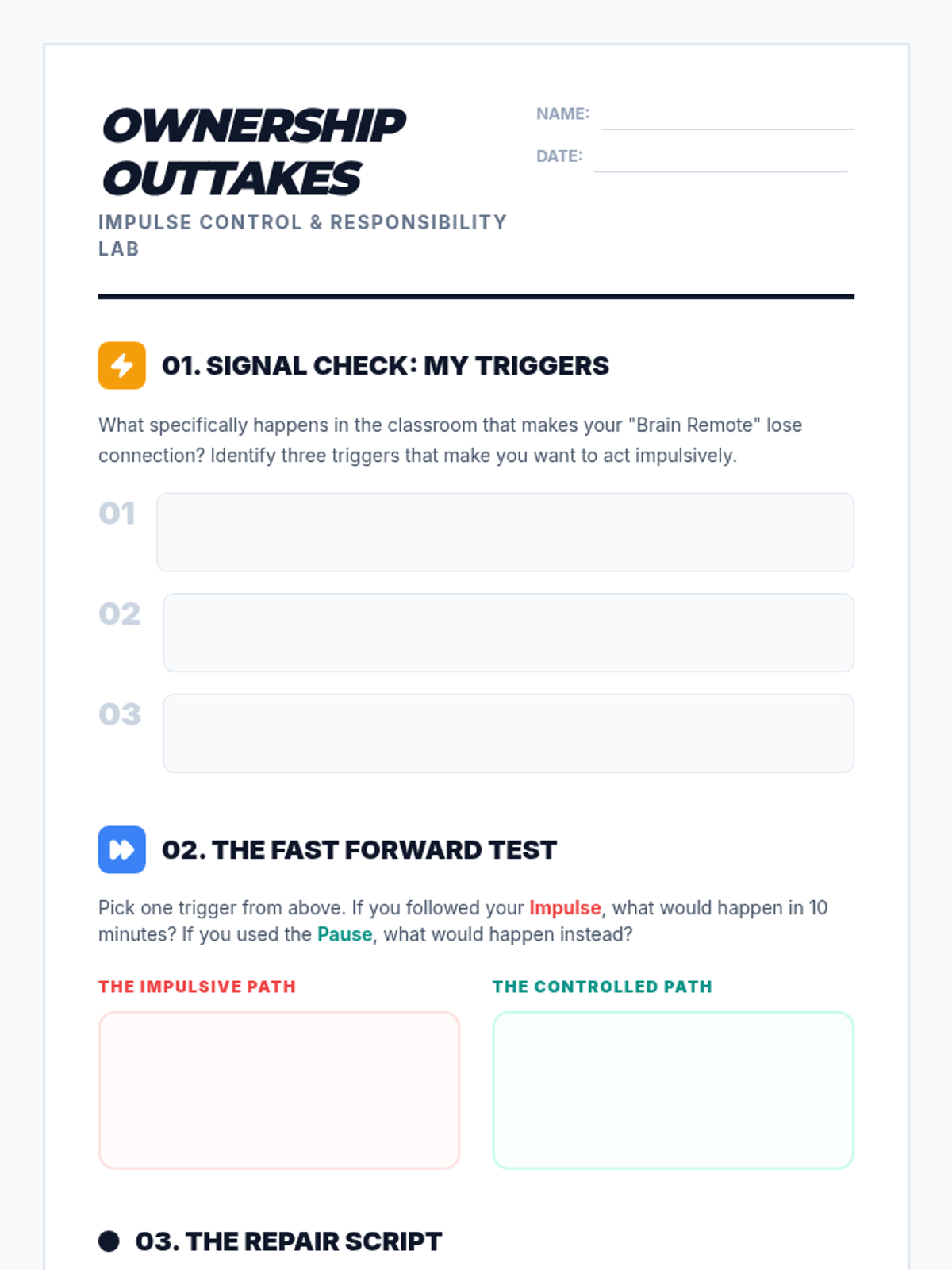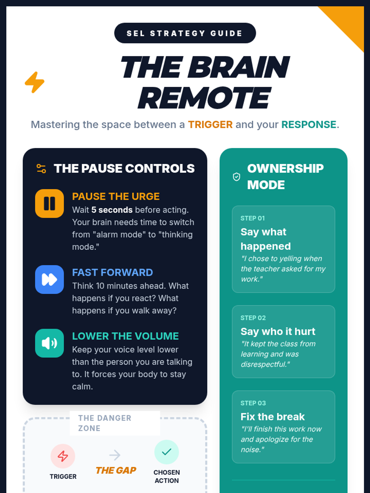 This Tier 3 SEL lesson focuses on intensive, explicit instruction for 8th graders struggling with classroom impulse control and taking ownership of their actions. It uses a 'Remote Control' metaphor to help students visualize the gap between a stimulus and their response, providing concrete steps for self-regulation and restorative responsibility.