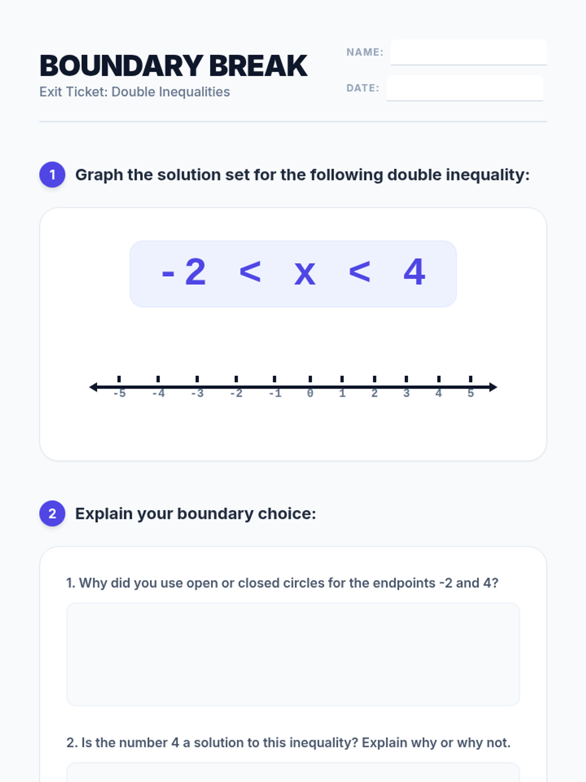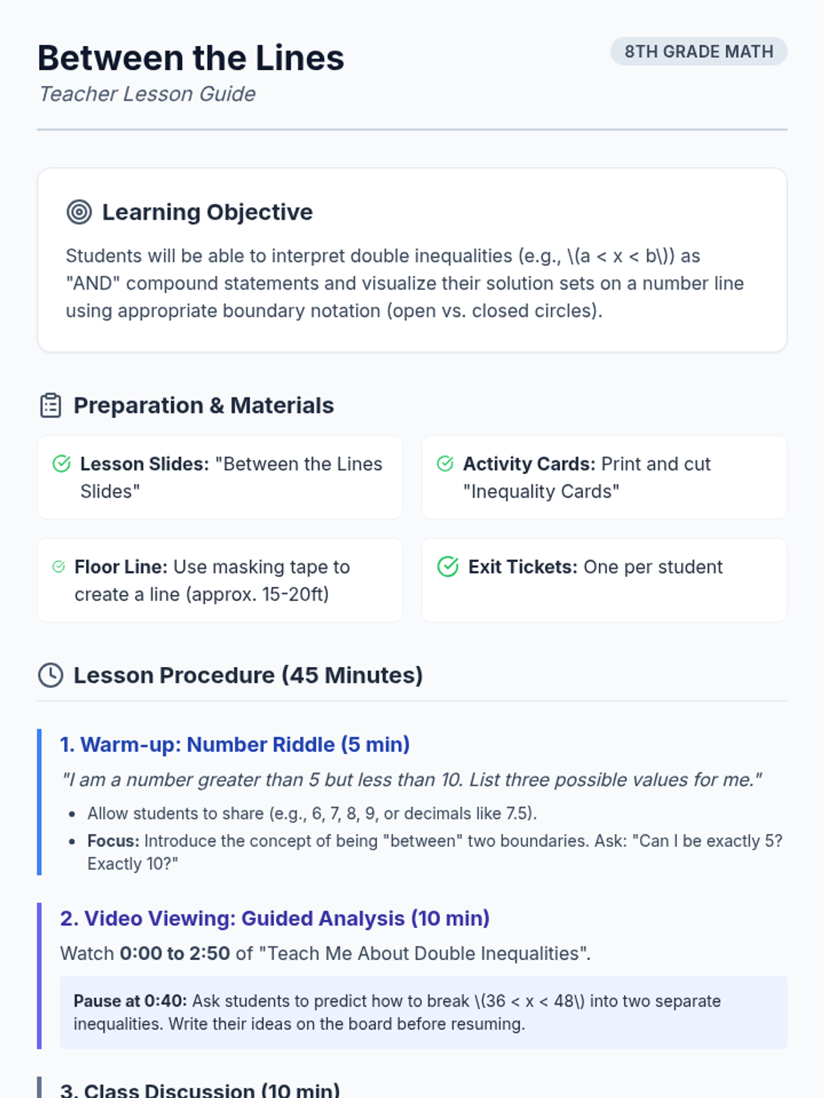 Students learn to interpret double inequalities as 'AND' statements and represent them on number lines through a warm-up riddle, video analysis, and a 'Human Number Line' physical activity.