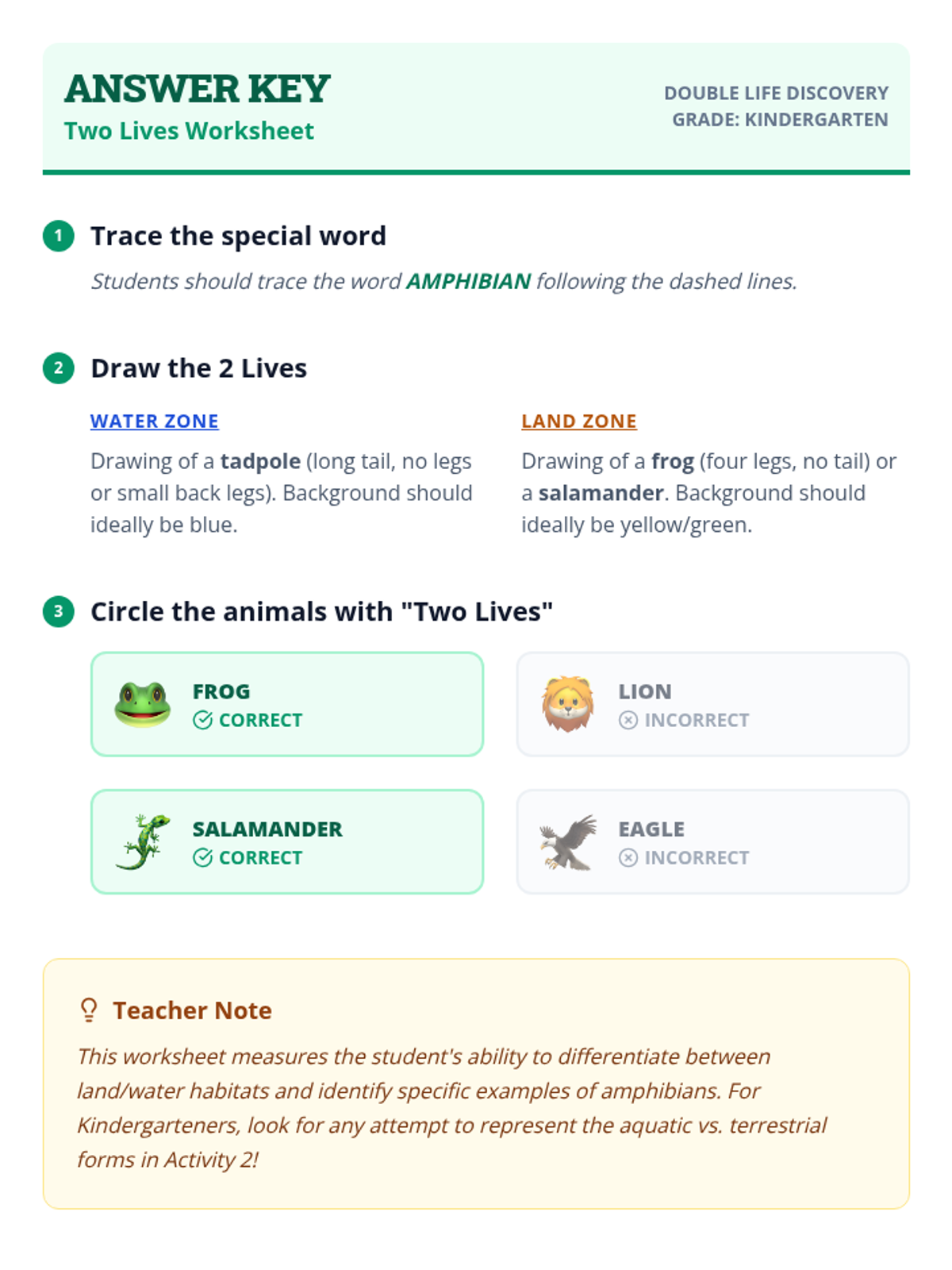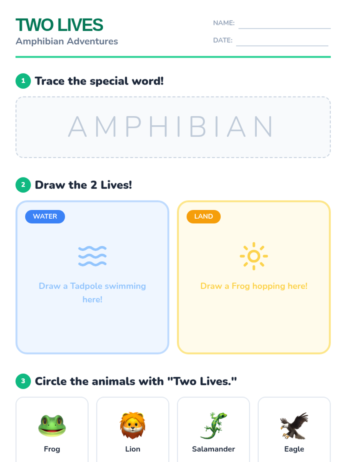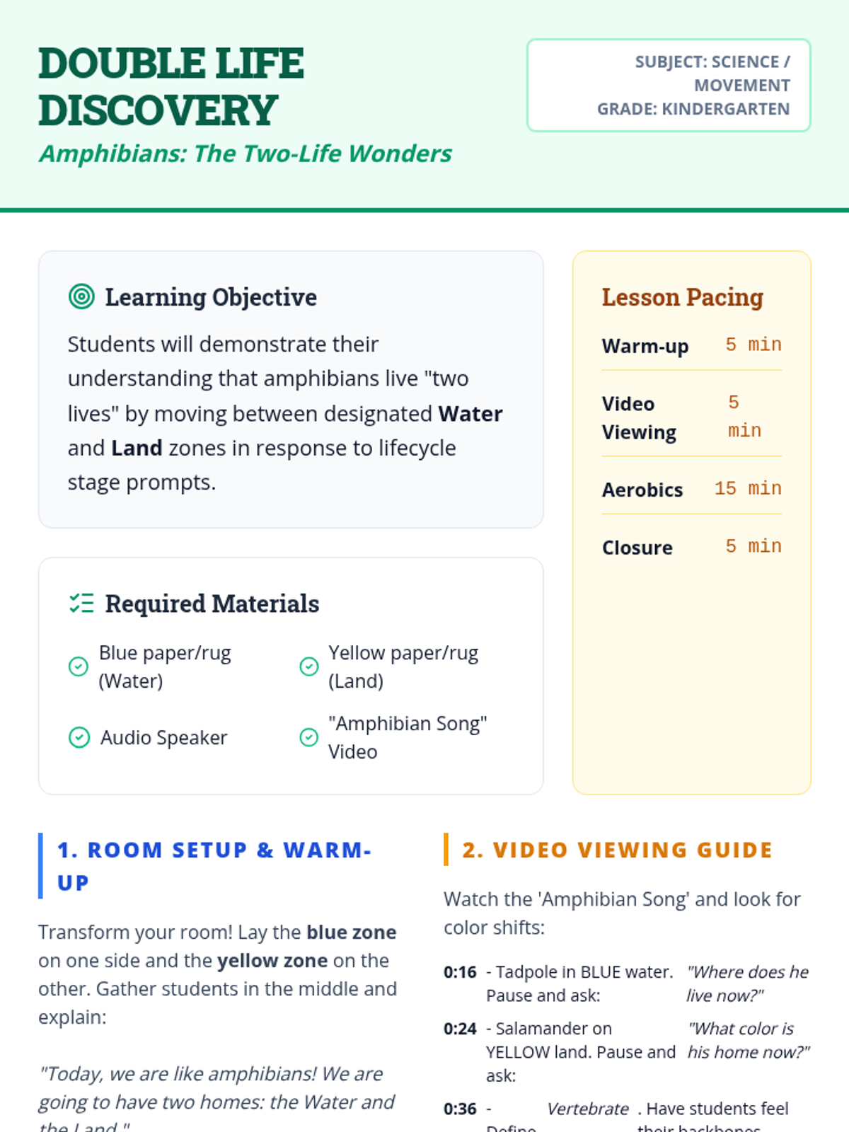 A high-energy, movement-based lesson for Kindergarteners to explore the 'two lives' of amphibians, transitioning from water-dwelling tadpoles to land-hopping frogs.