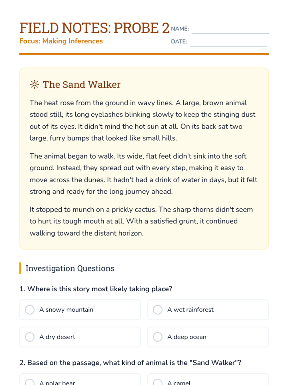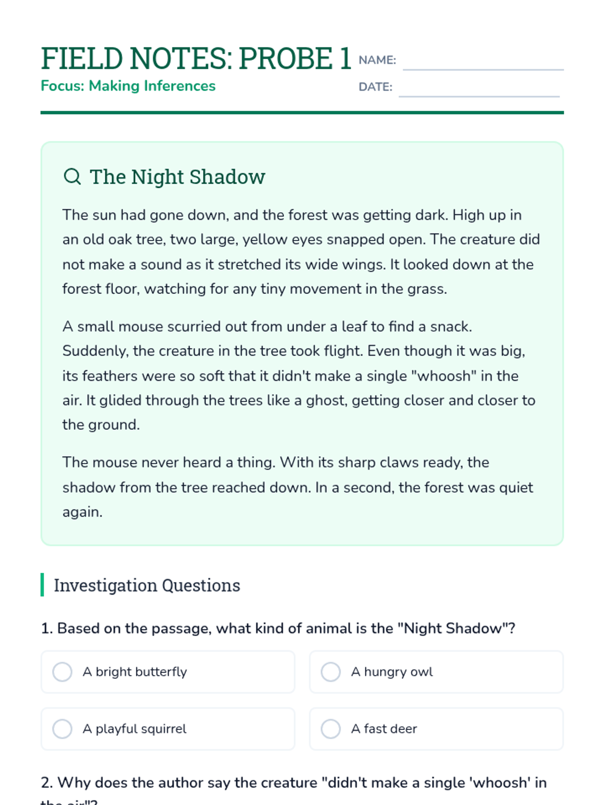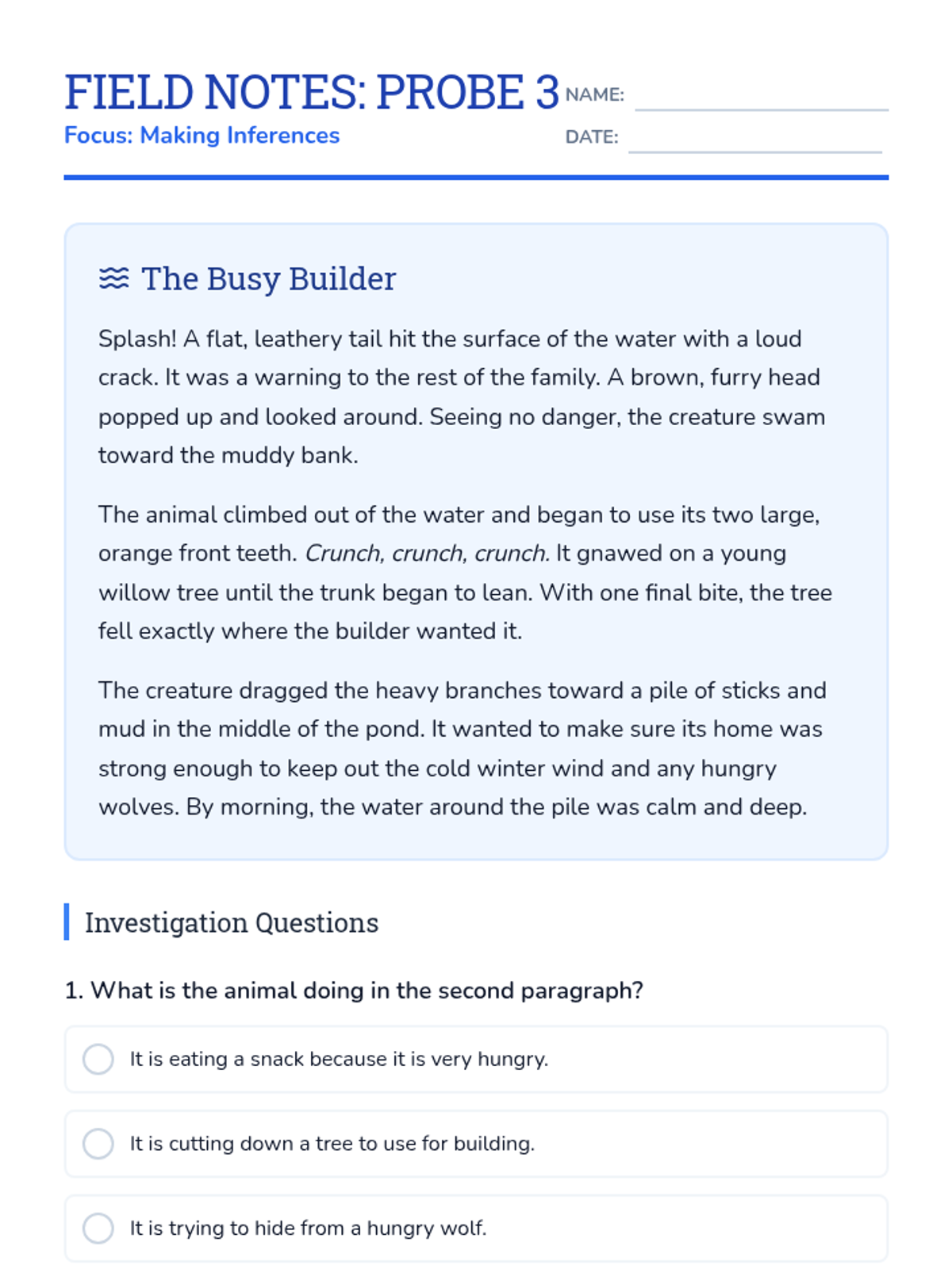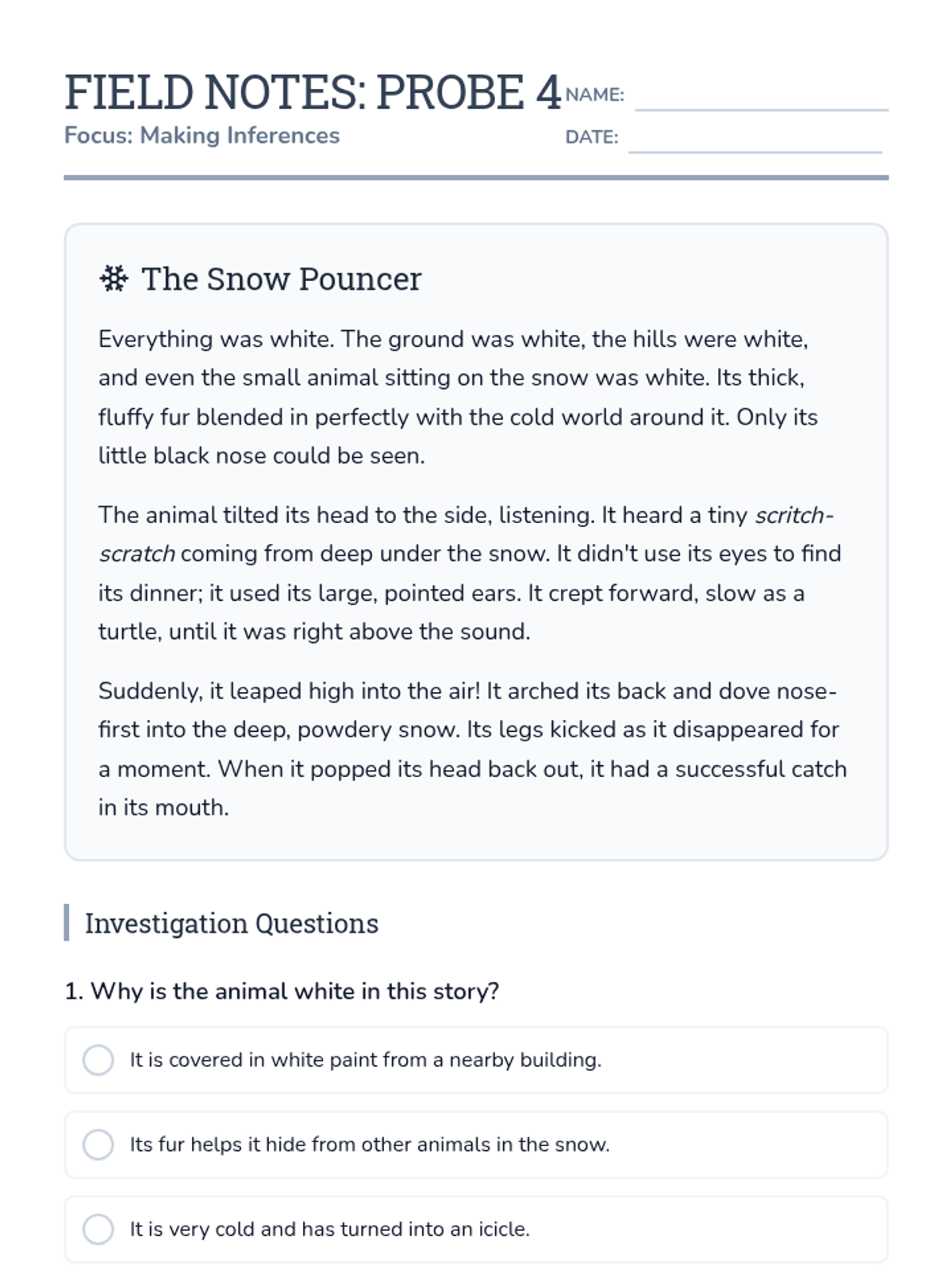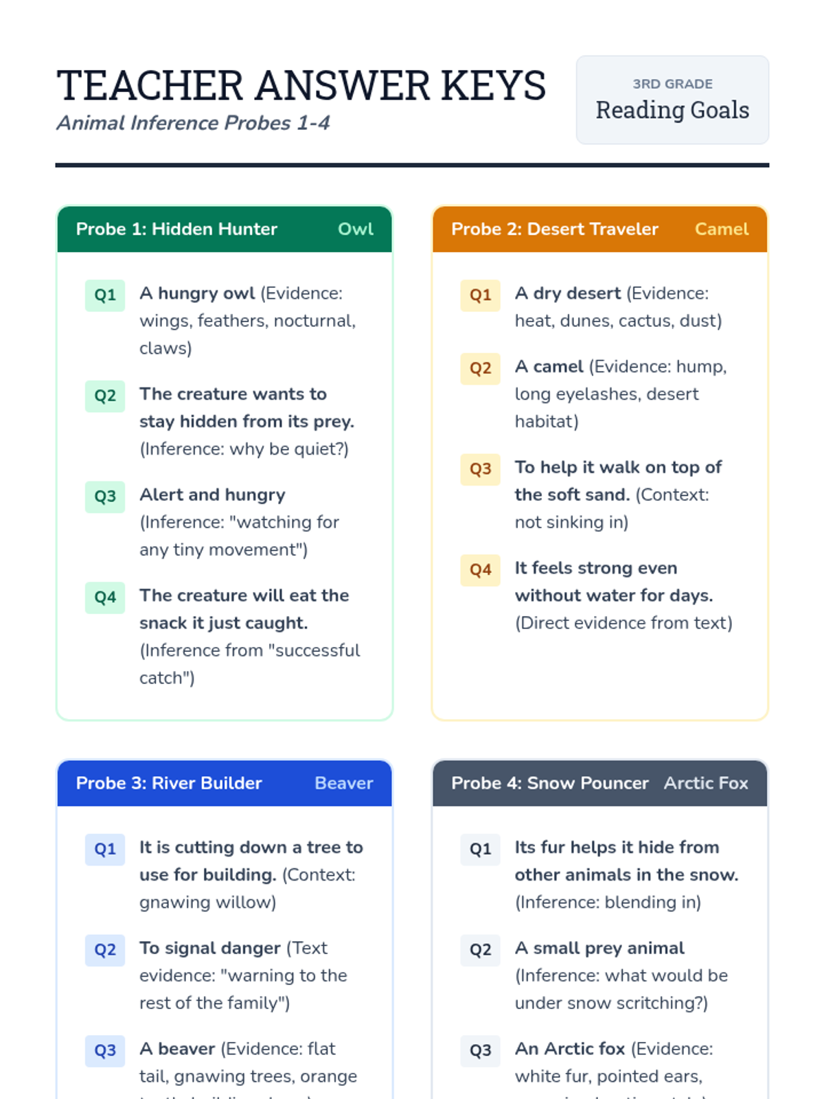 A collection of four short animal-themed reading probes designed to monitor progress on 3rd-grade inference goals. Each probe includes a passage and multiple-choice questions focusing on implied meaning and character motivations.
