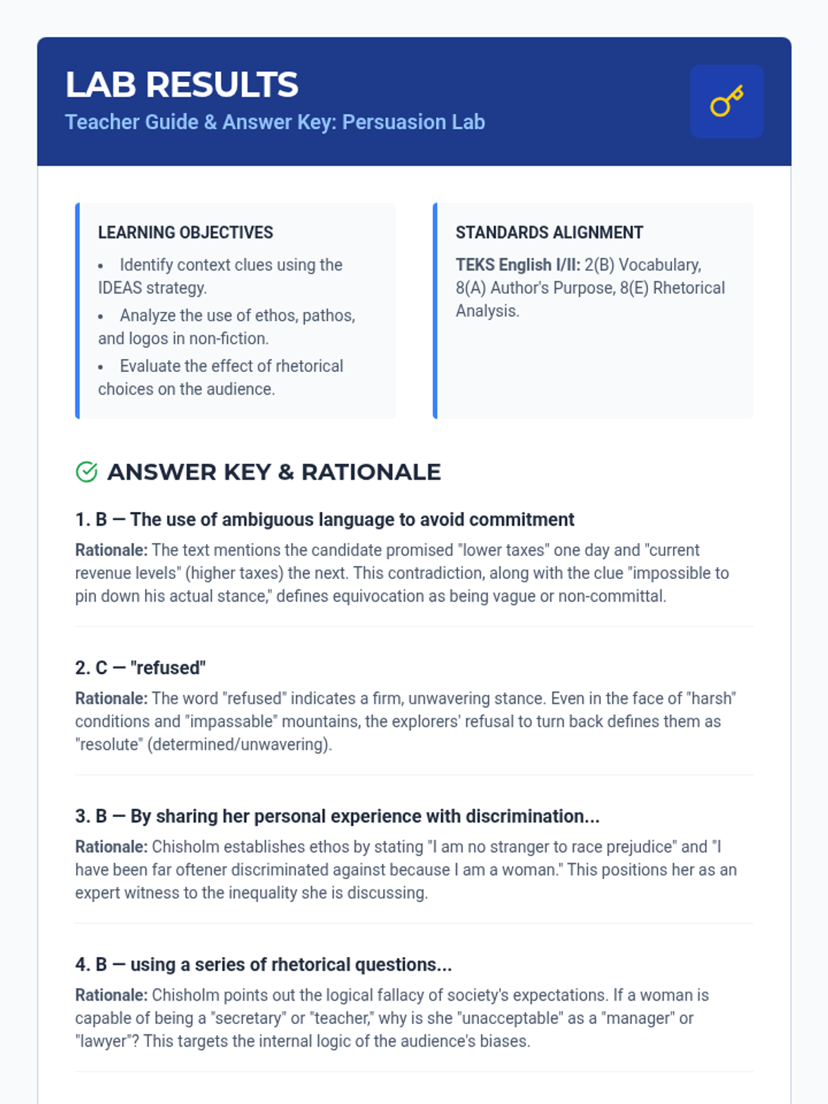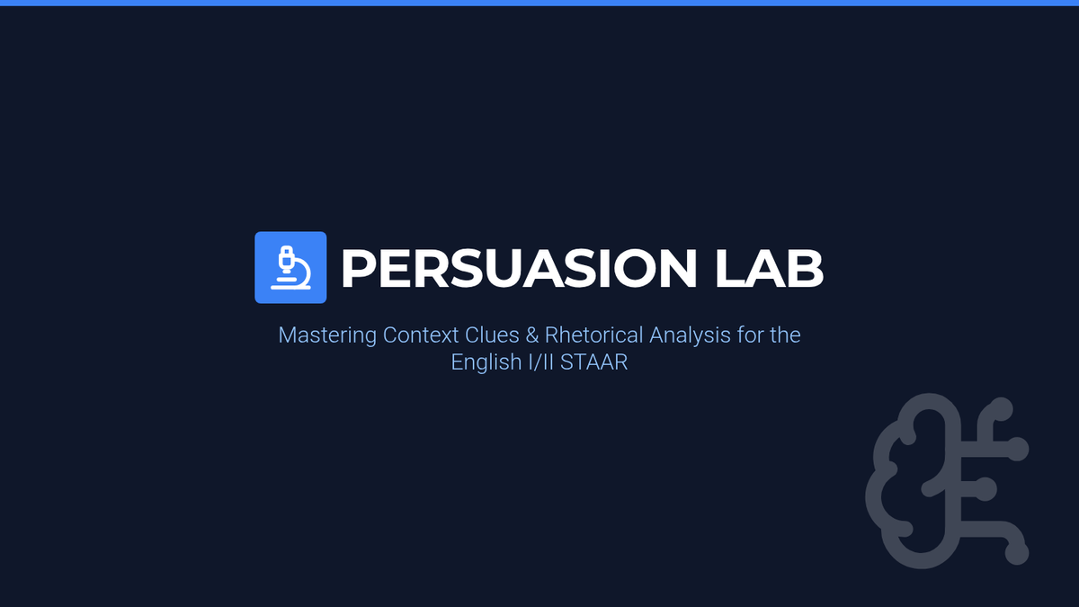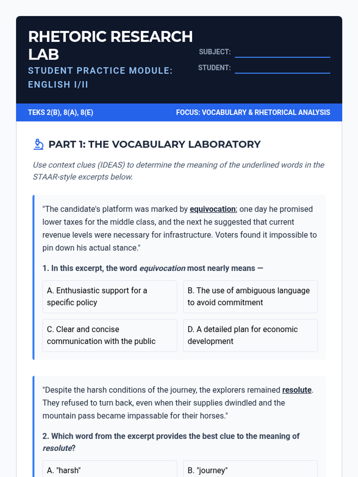 A comprehensive STAAR preparation lesson focusing on vocabulary in context strategies and rhetorical analysis (ethos, pathos, logos) for High School English I/II. Students will master context clue techniques and analyze how authors use language to persuade and impact their audience.