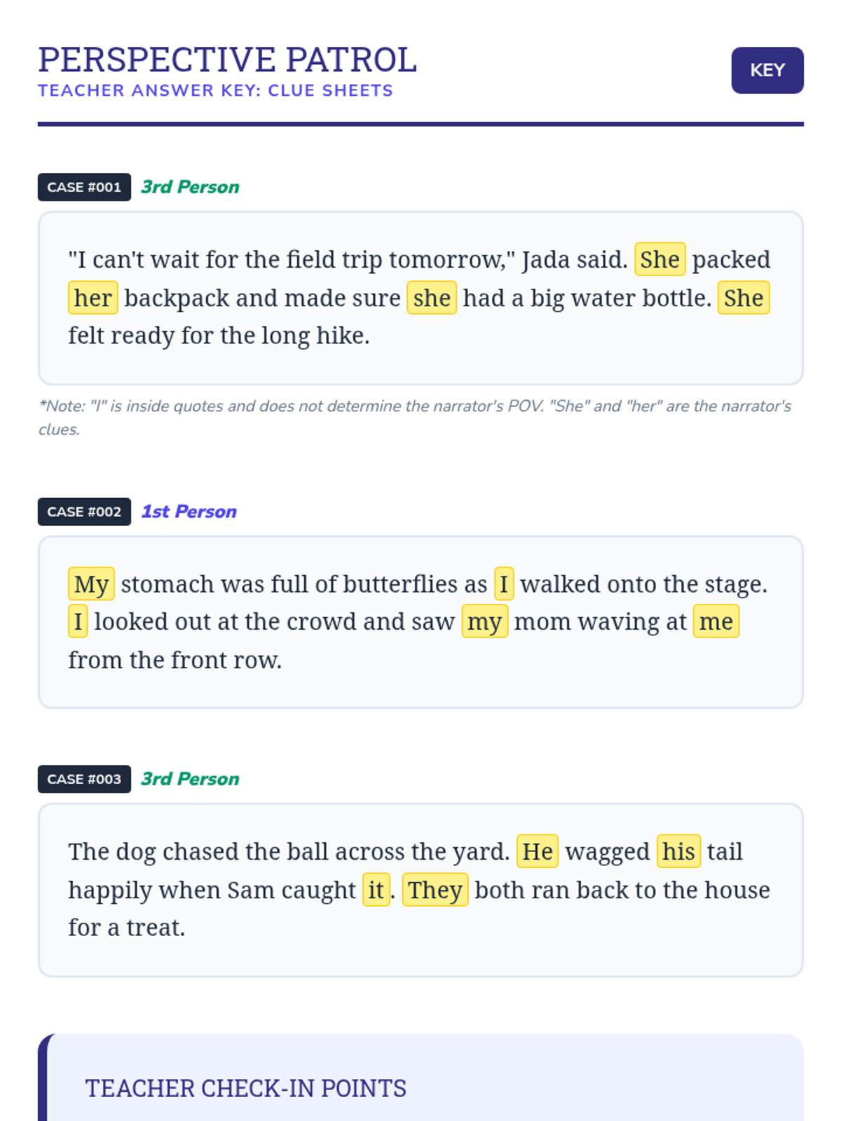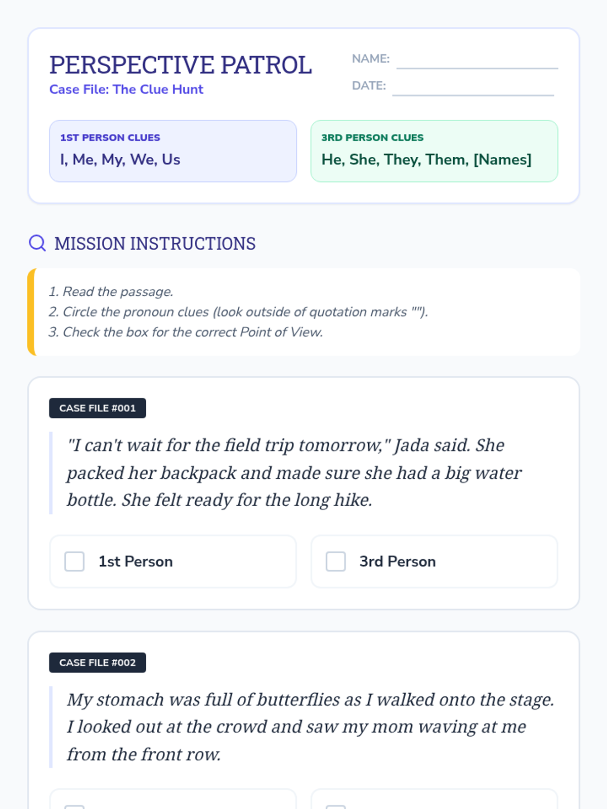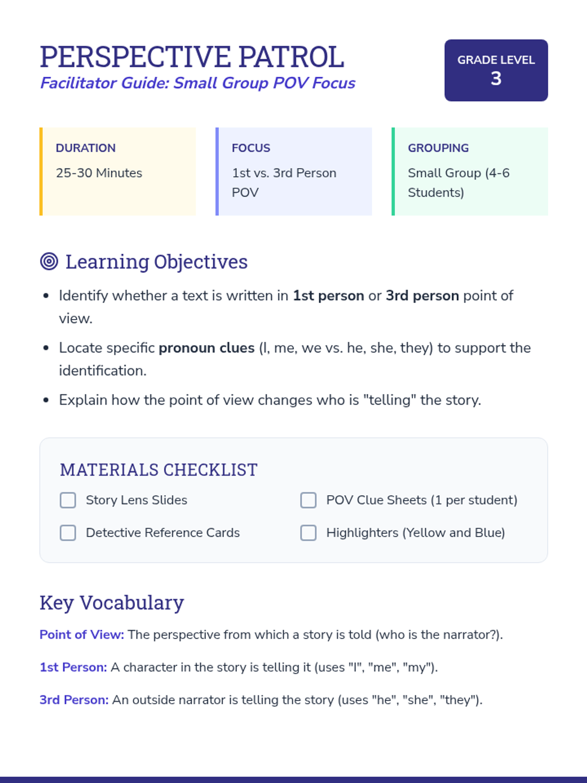 A 3rd-grade small group lesson focused on identifying and distinguishing between 1st person and 3rd person point of view using text evidence clues.