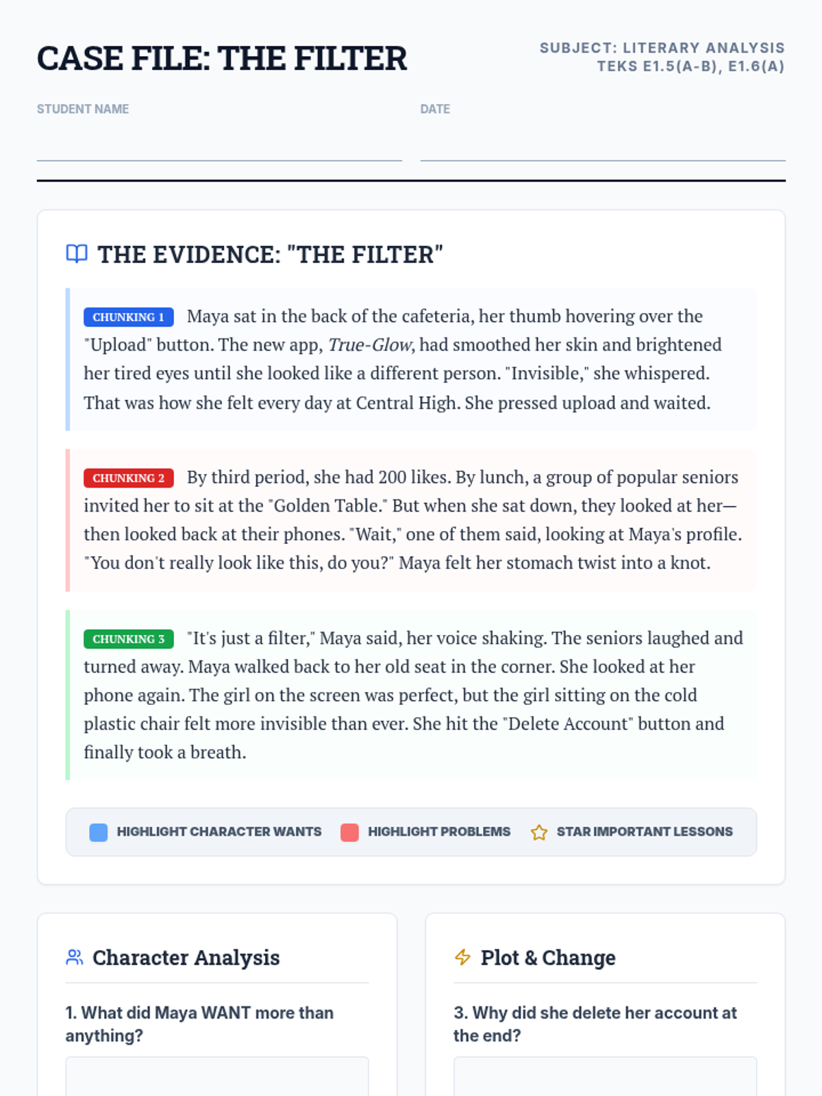 A scaffolded English I lesson focused on identifying theme and author's purpose through character analysis and guided annotation of a short fiction passage. Designed for students needing additional literacy support.