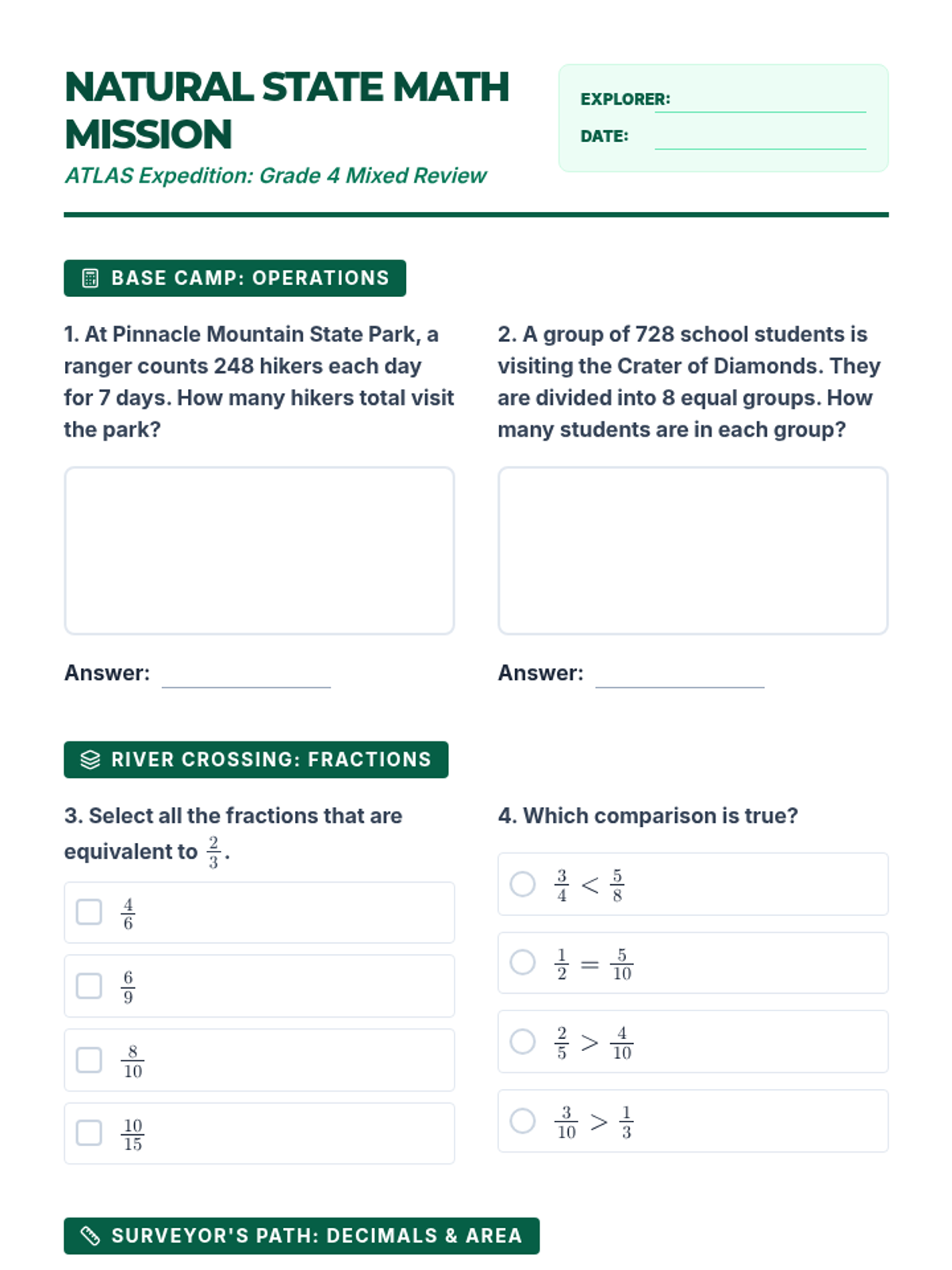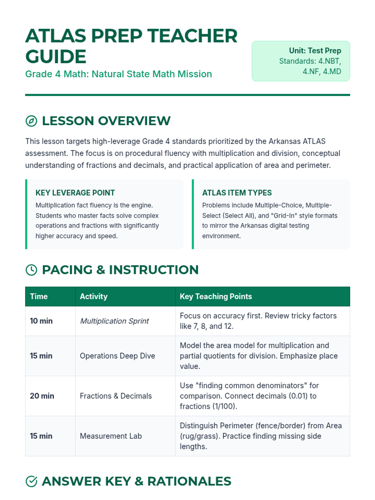 A comprehensive Grade 4 Math test prep lesson focused on key Arkansas Academic Standards (NBT, NF, and MD) to prepare students for the ATLAS assessment. The lesson emphasizes multiplication fact fluency as a foundation for solving multi-digit operations, fractions, and measurement problems.