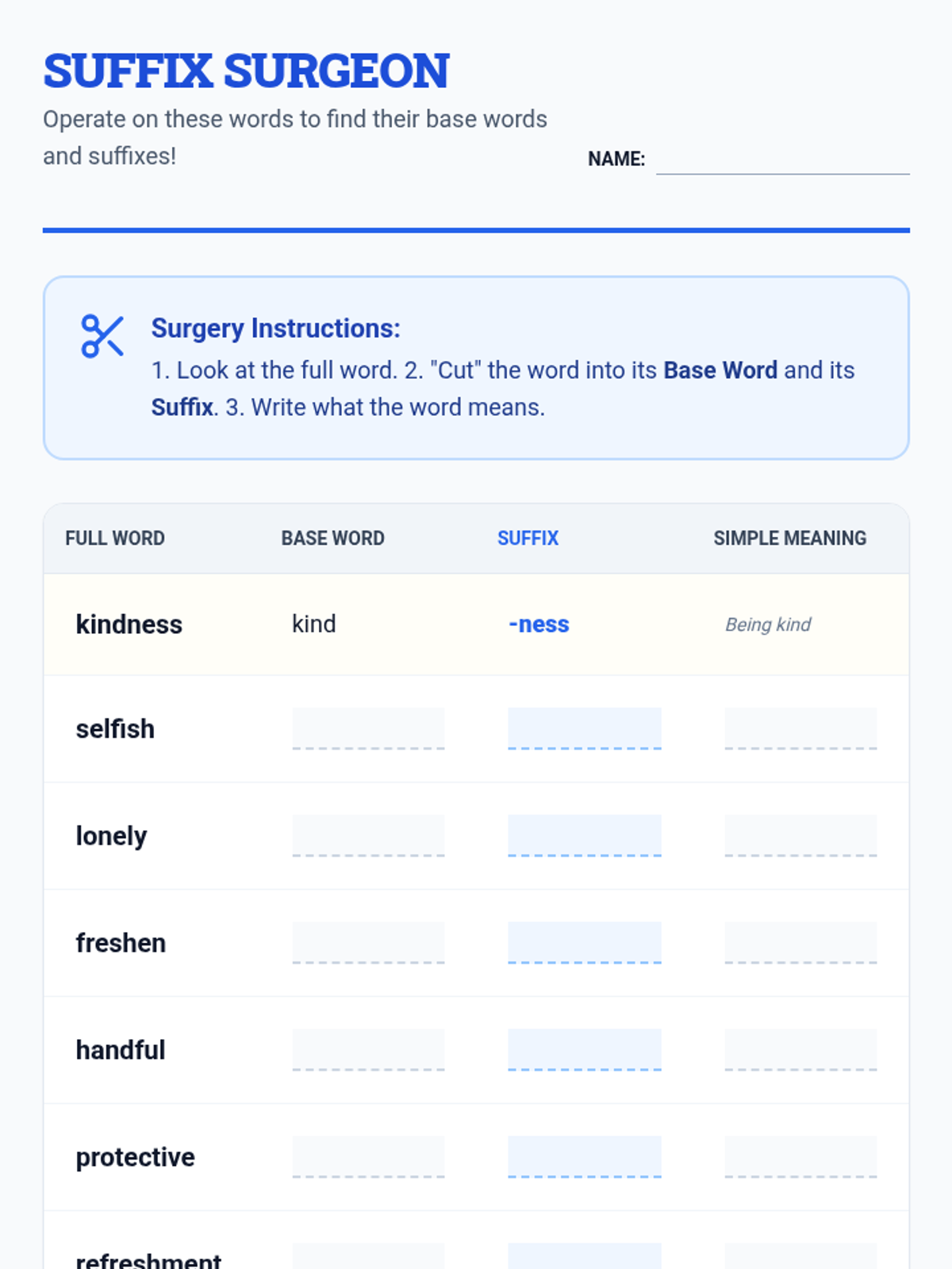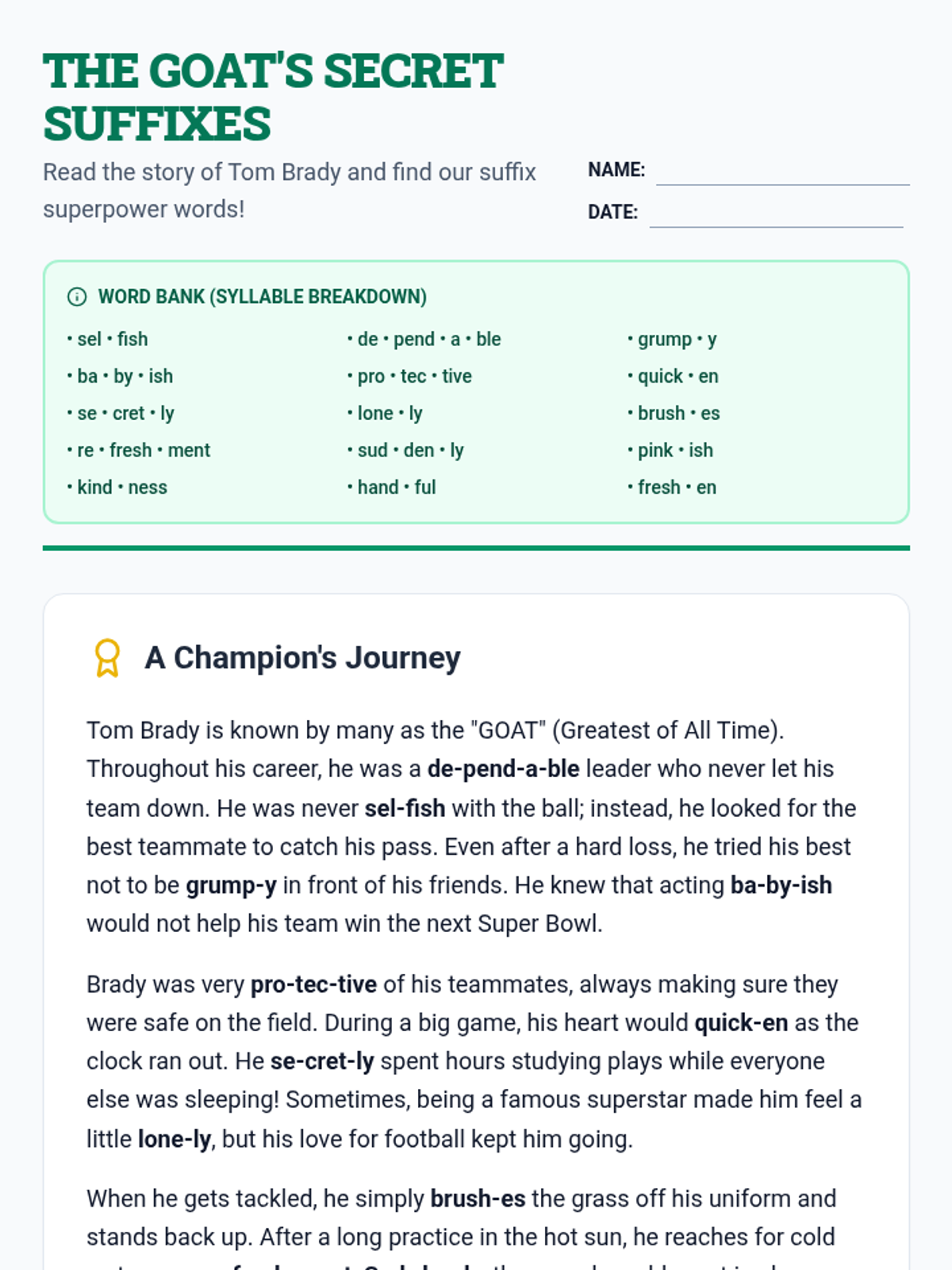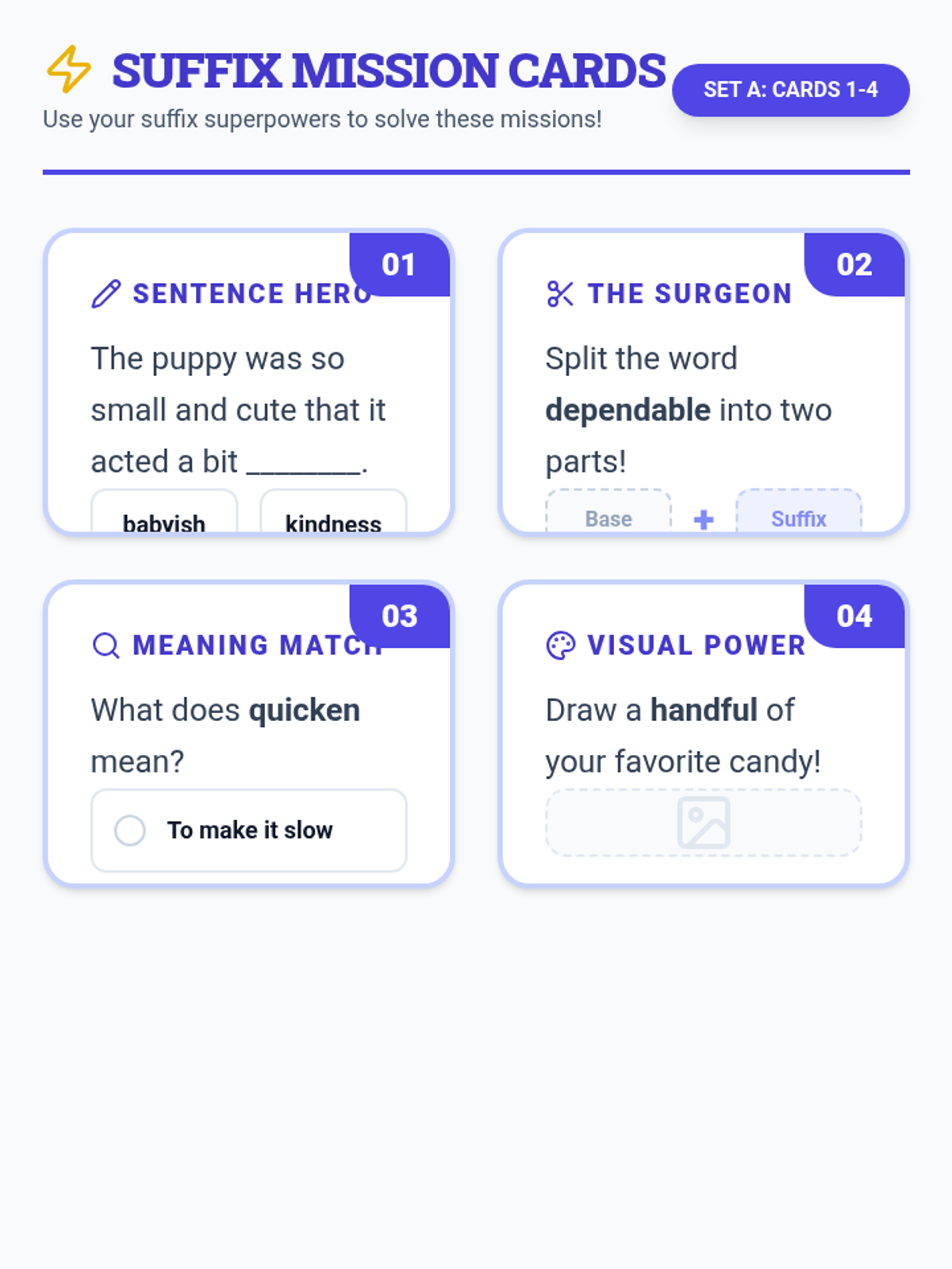 A comprehensive lesson introducing common suffixes through word breakdown, kid-friendly definitions, and sentence-level practice. Designed for 4th-grade students, including those with special needs, with heavy visual support and clear syllable division.