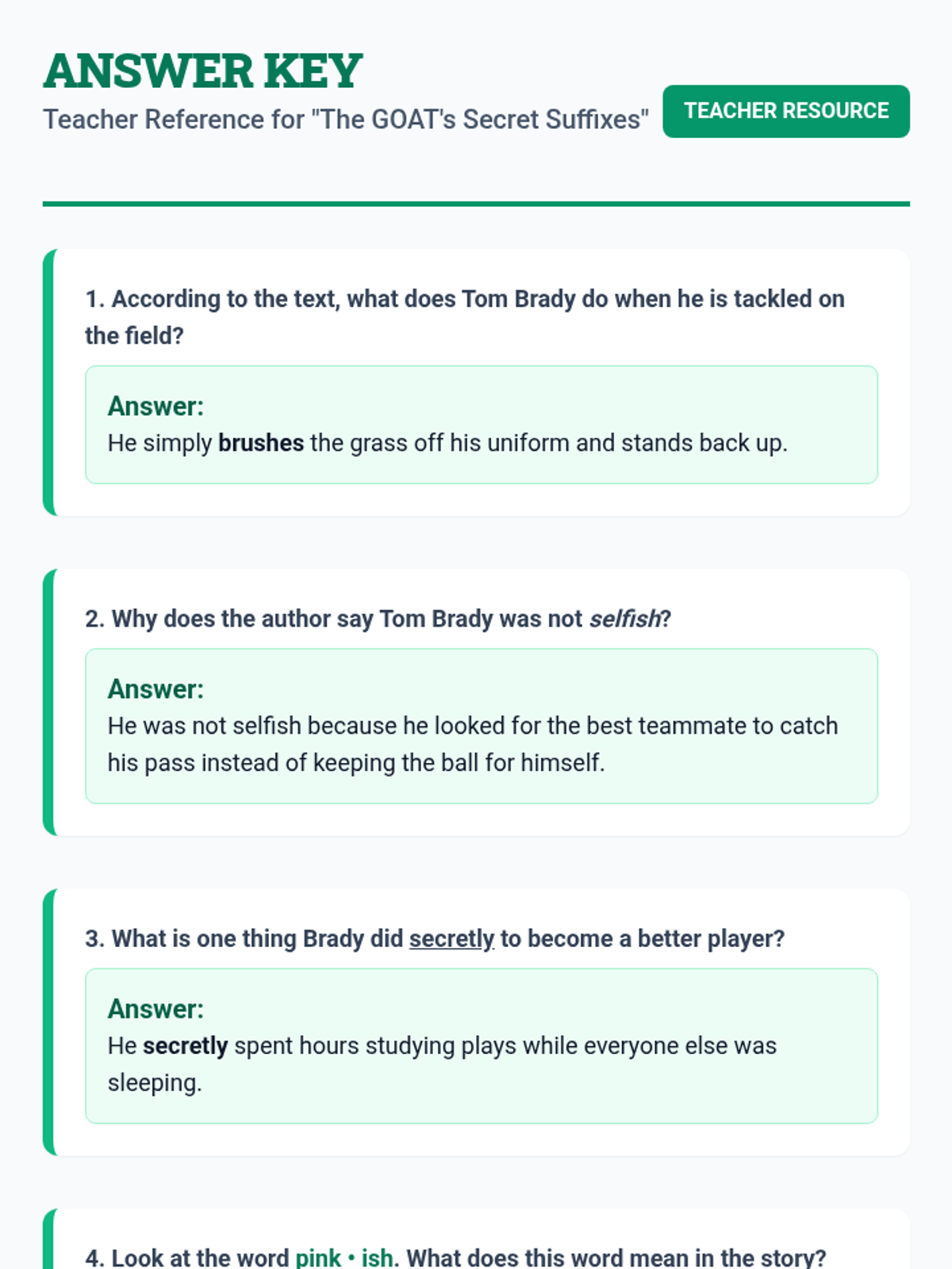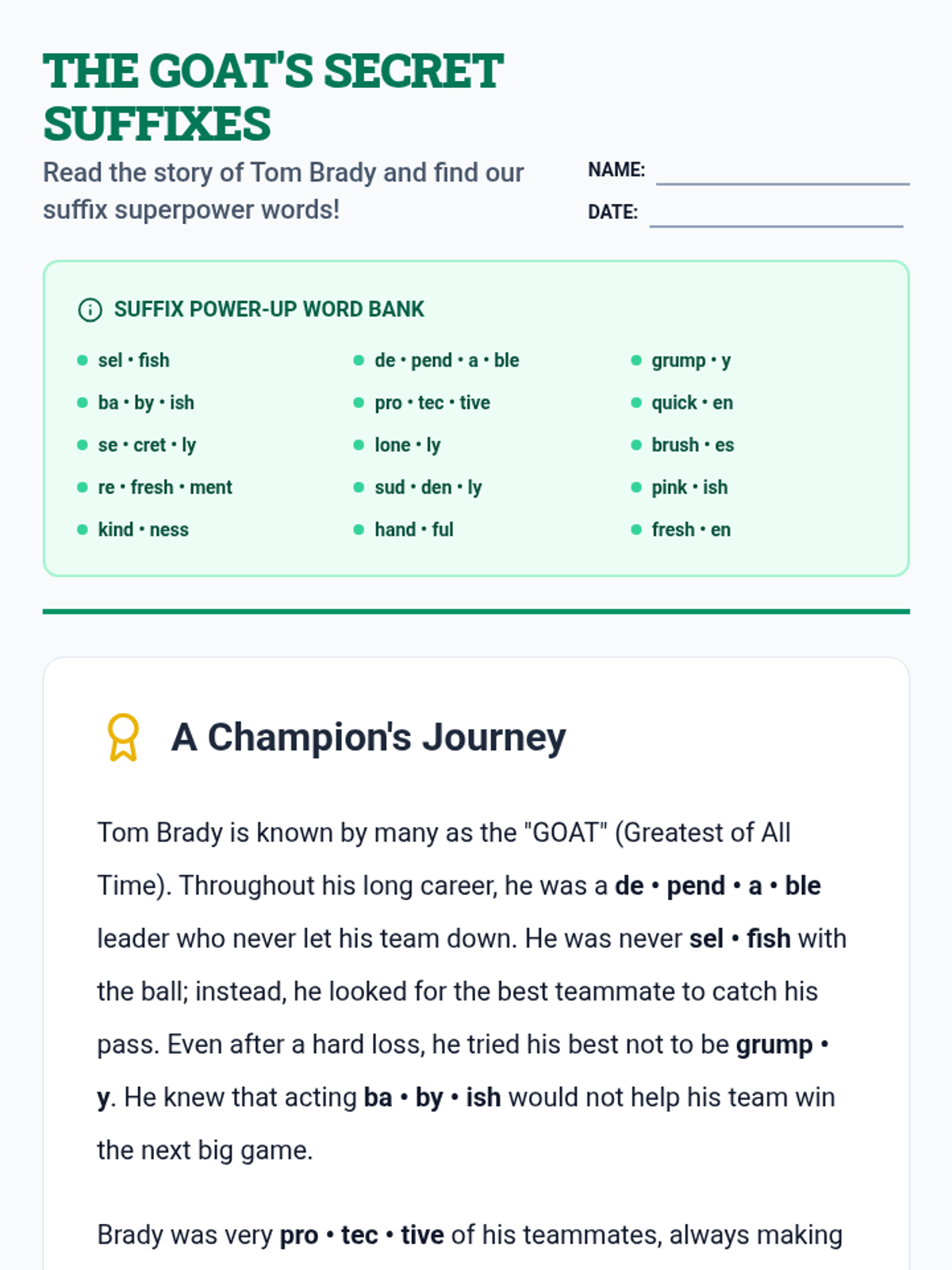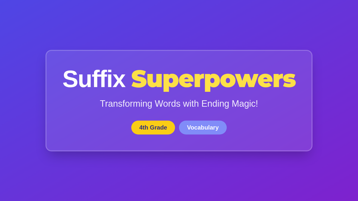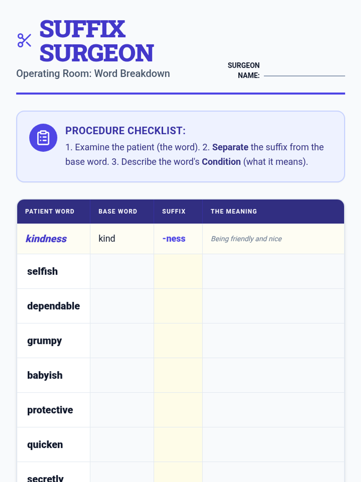 A comprehensive lesson introducing common suffixes through word breakdown, kid-friendly definitions, and sentence-level practice. Designed for 4th-grade students, including those with special needs, with heavy visual support and clear syllable division.