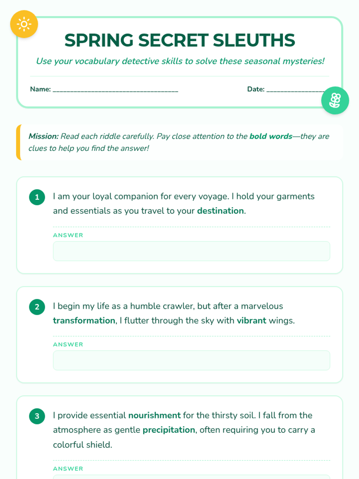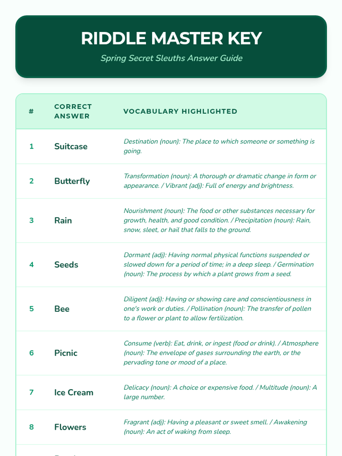 A collection of vocabulary-rich riddles centered around Spring Break themes, designed to challenge elementary students' word knowledge and critical thinking.