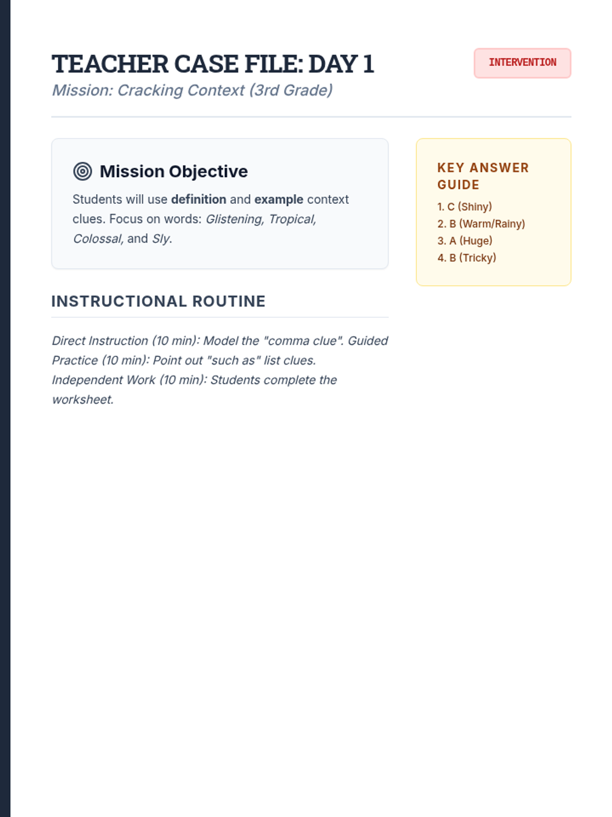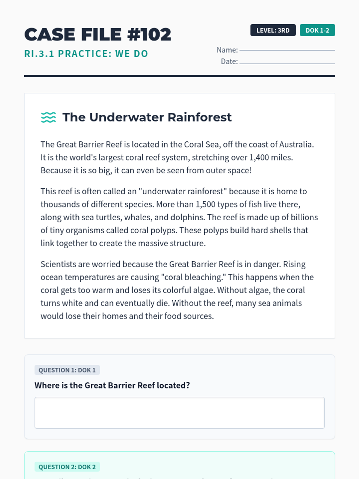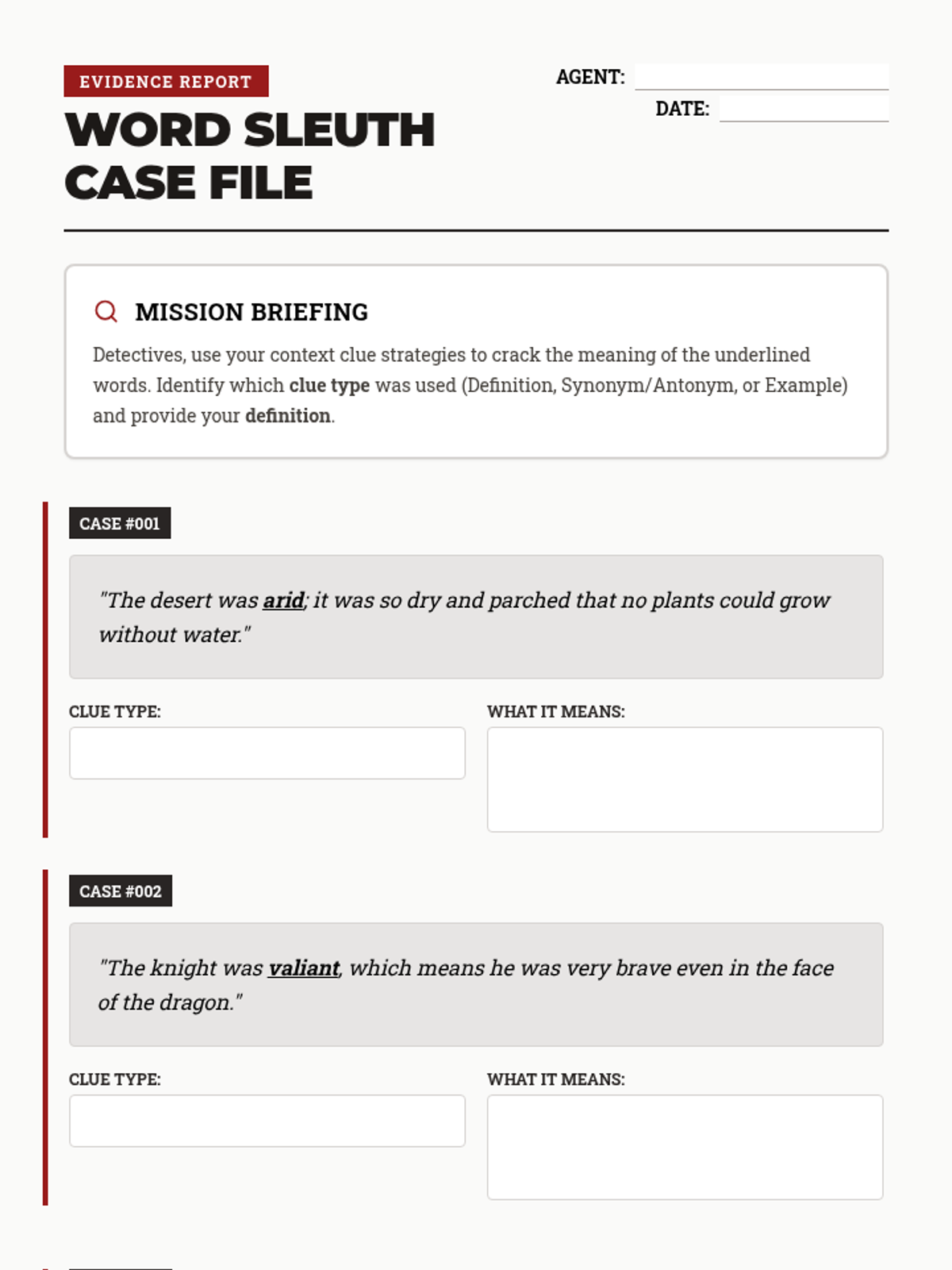 Students practice identifying specific vowel teams and diphthongs within simple sentences through a detective-themed decoding activity.